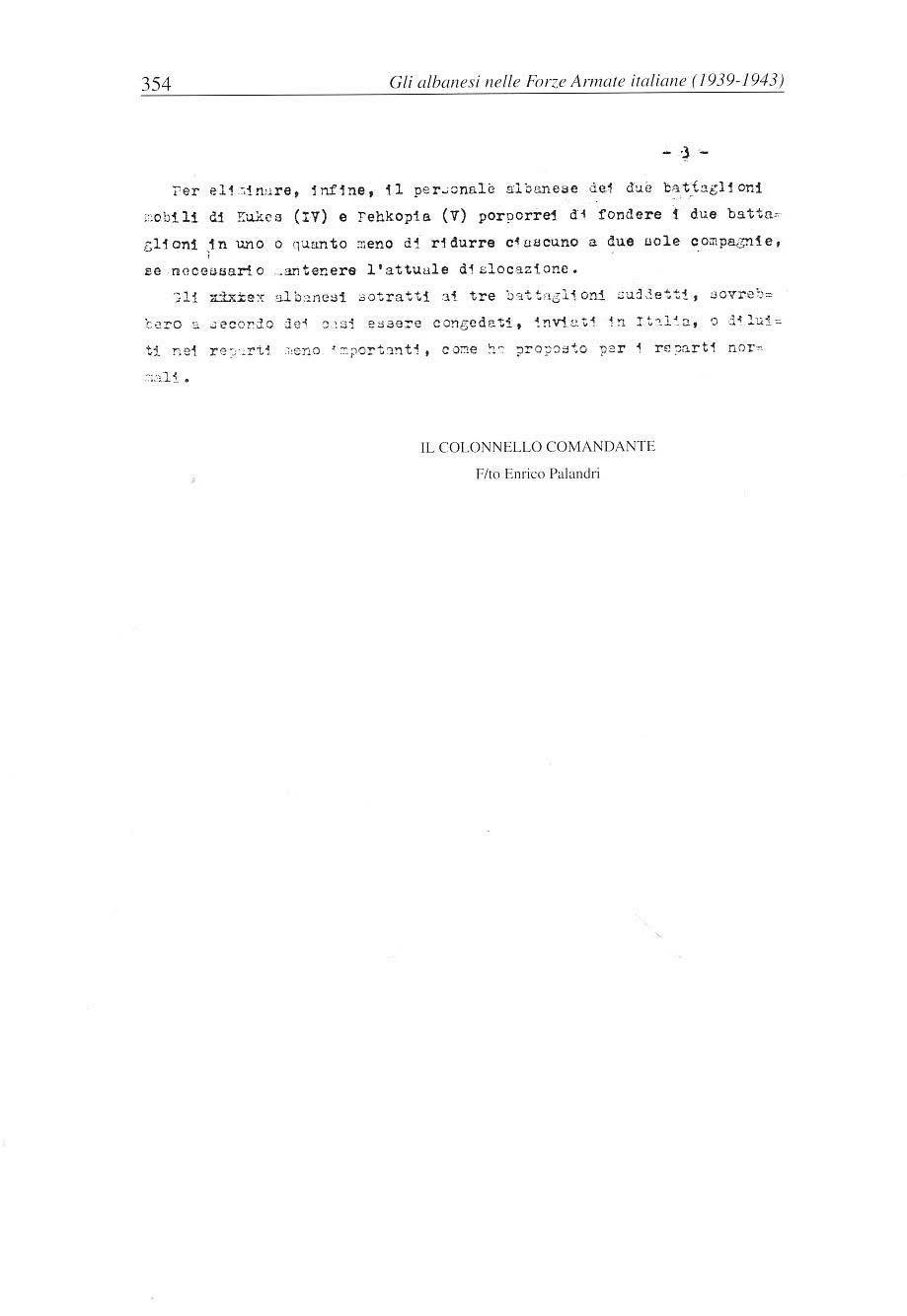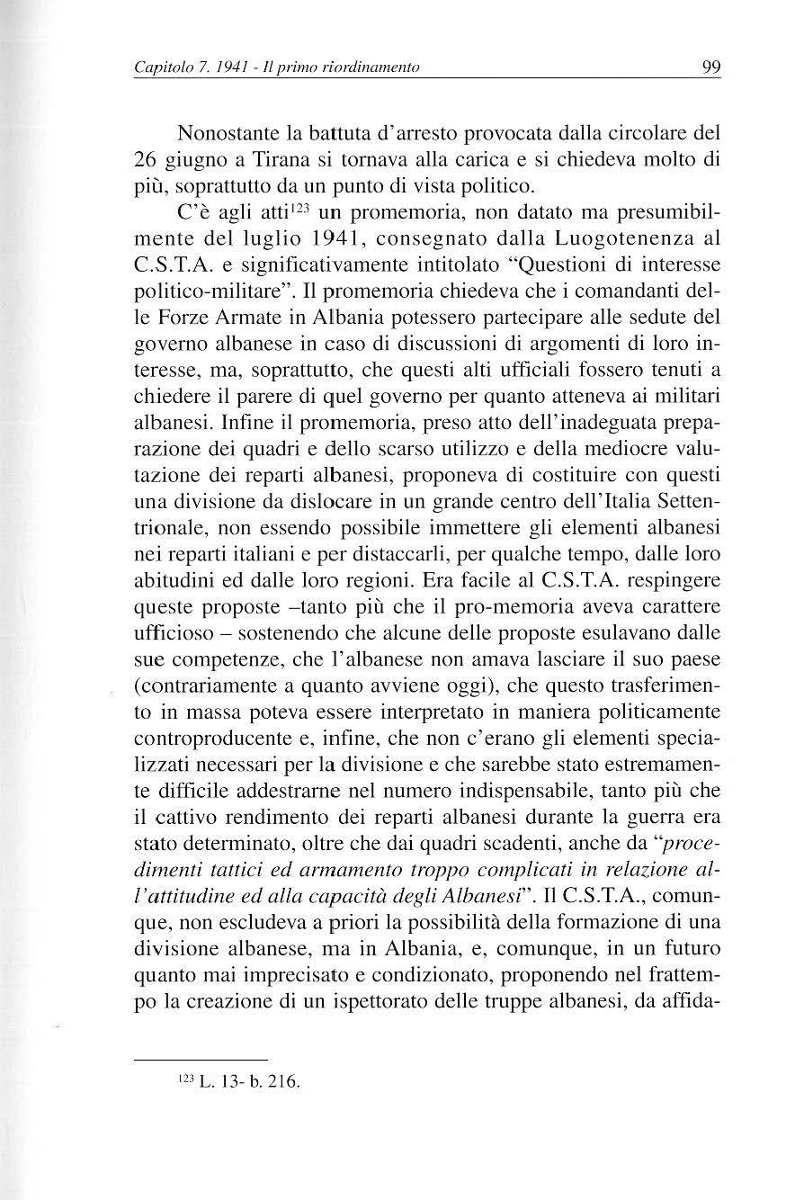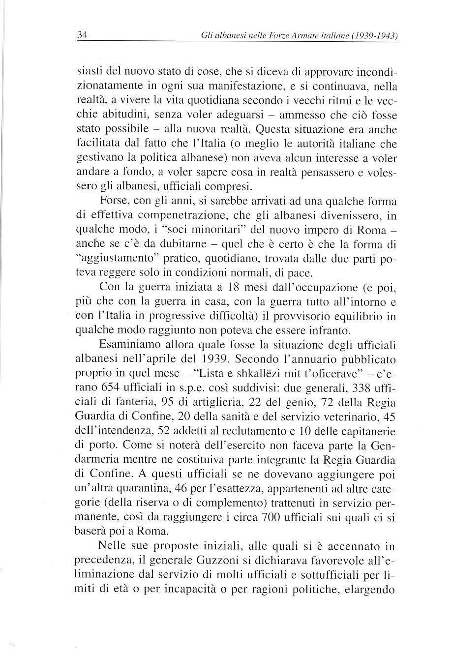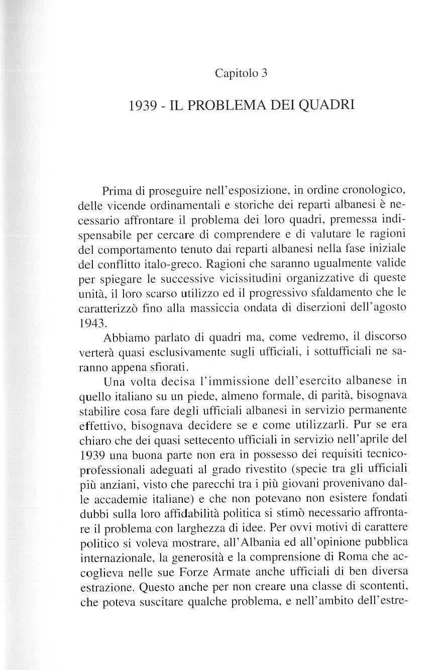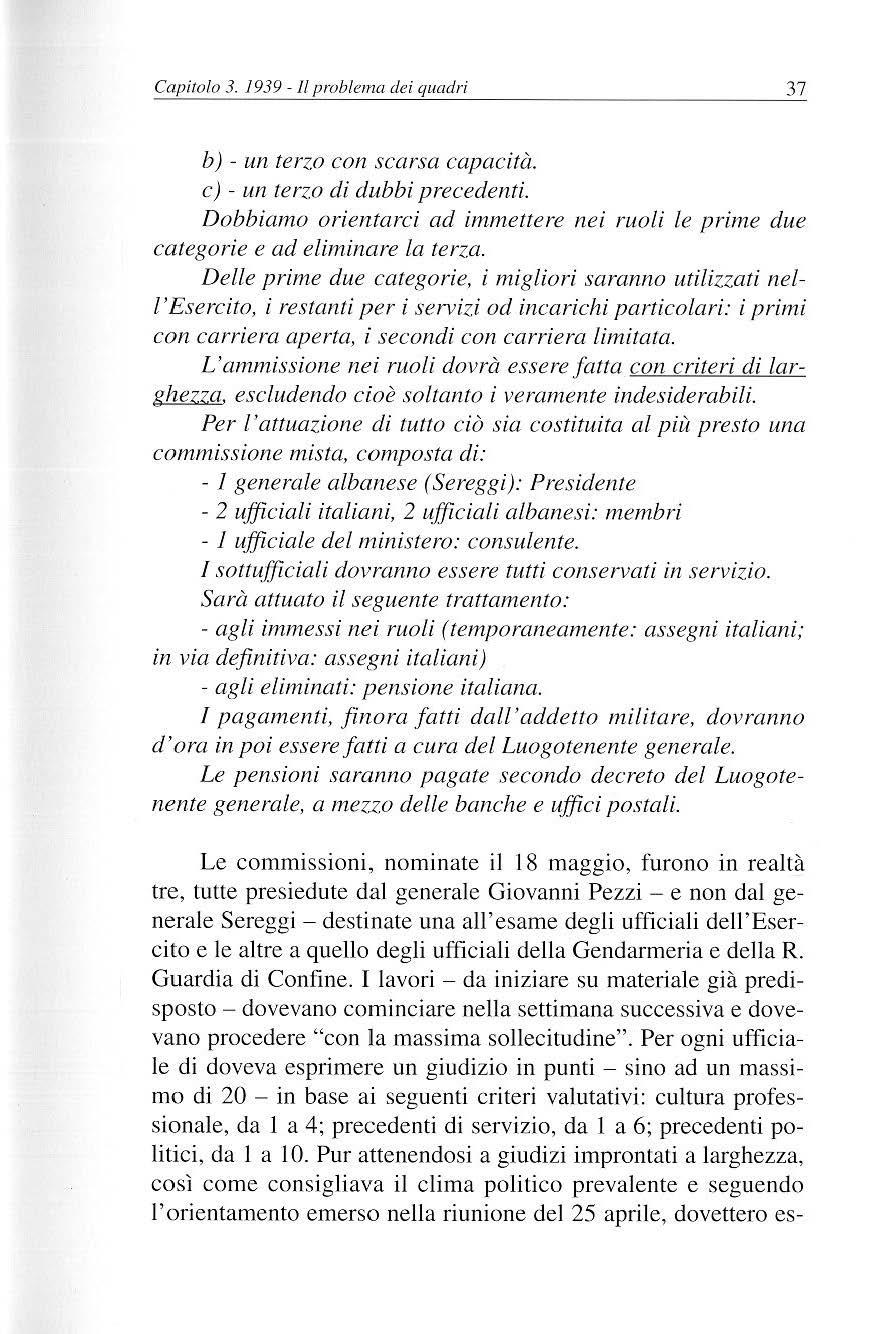 Allo stesso modo sareb be stata scartata la proposta, avanzata neJJa stessa sed uta, di formare i reggimenti di sta nza in Albania con un battaglione italiano ed uno albanese in tempo di pace ed un battaglione italiano e due albanesi in tempo di guerra. Passan do al problema dei quadri , nella riunione venivano fissati i criteri relativi al trattamento eia riservare agli ufficiali albanesi in servizio permanente effettivo per quanto atteneva al loro mantenim en to in servizio ed al loro stipendio .