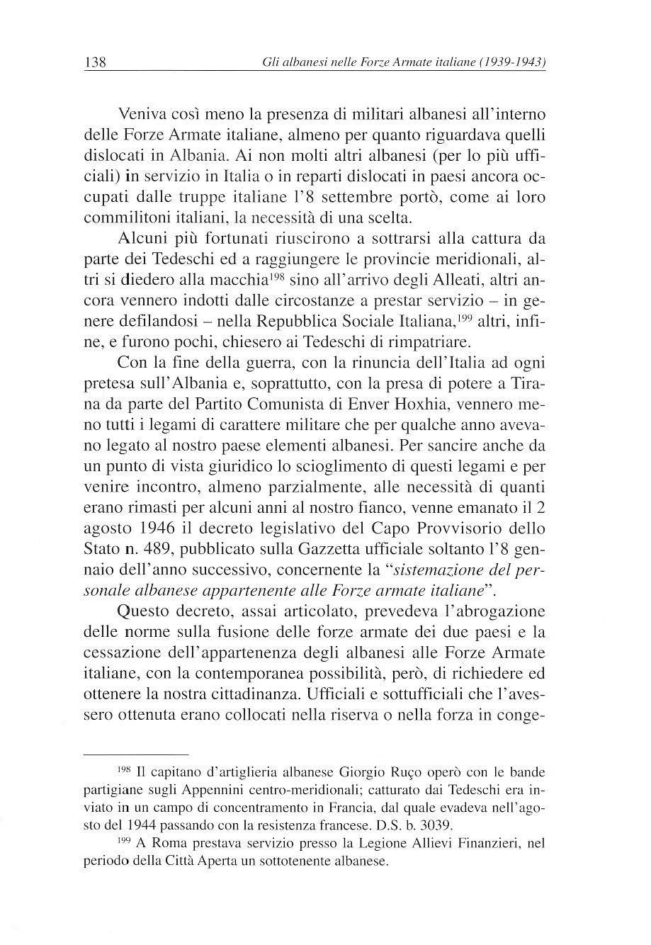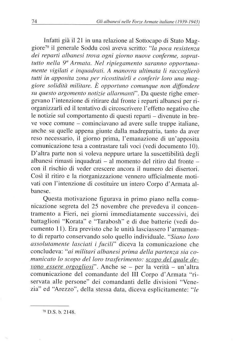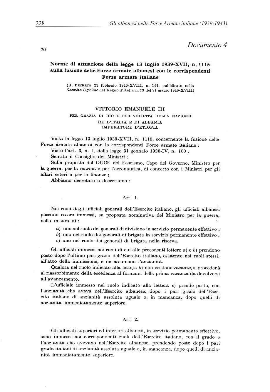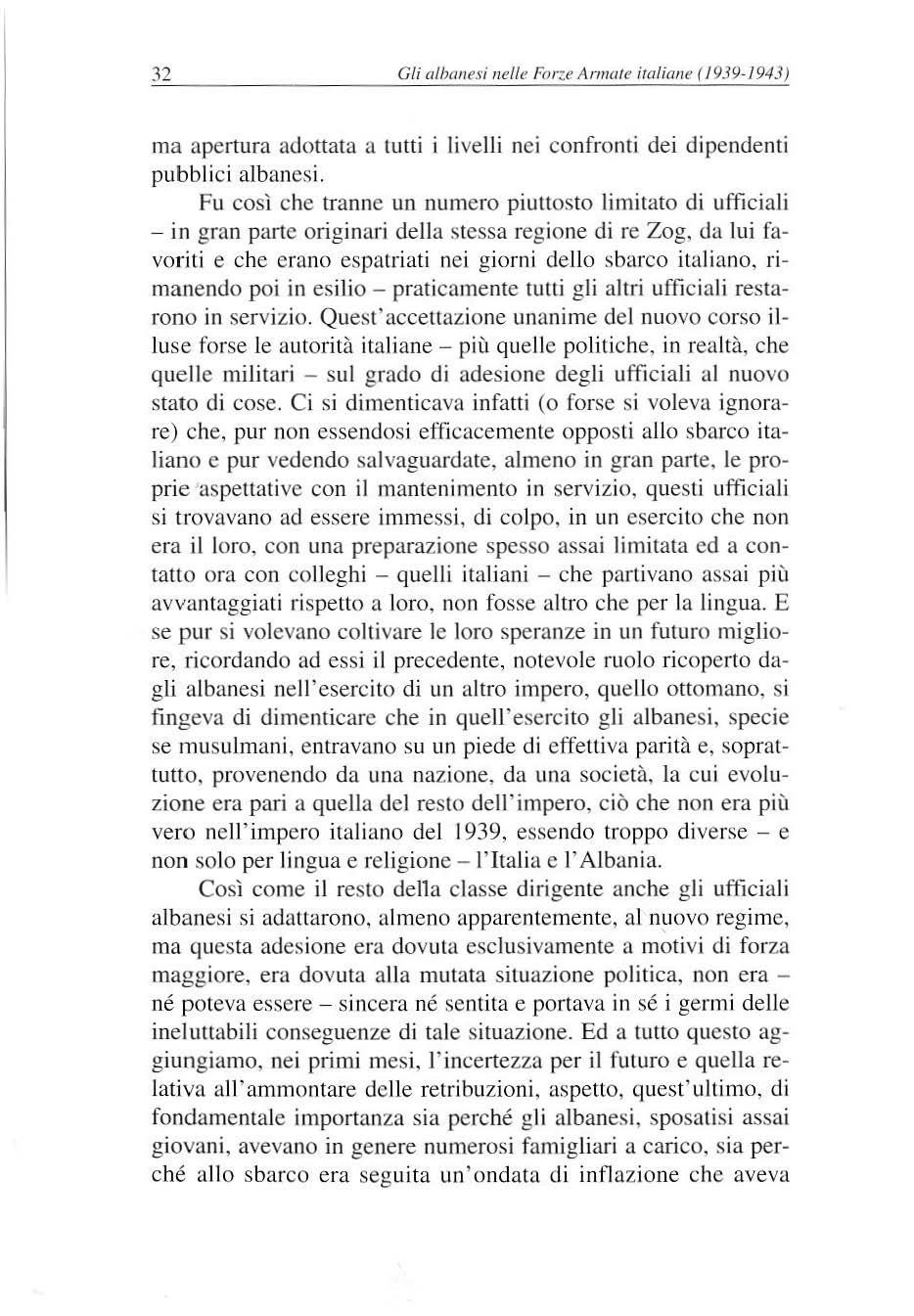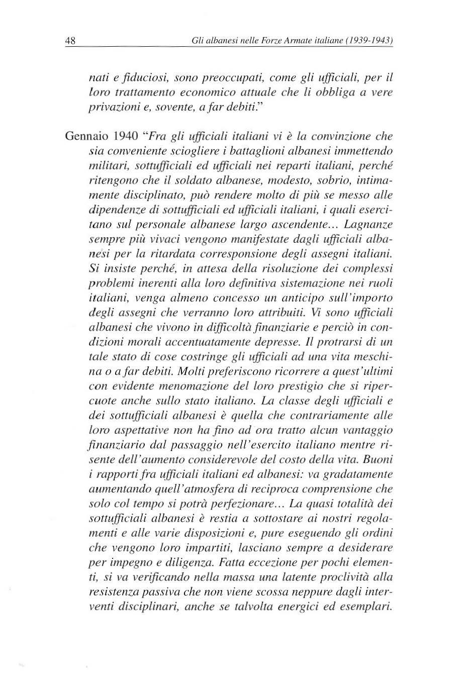Allo stesso modo sareb be stata scartata la proposta, avanzata neJJa stessa sed uta, di formare i reggimenti di sta nza in Albania con un battaglione italiano ed uno albanese in tempo di pace ed un battaglione italiano e due albanesi in tempo di guerra. Passan do al problema dei quadri , nella riunione venivano fissati i criteri relativi al trattamento eia riservare agli ufficiali albanesi in servizio permanente effettivo per quanto atteneva al loro mantenim en to in servizio ed al loro stipendio .