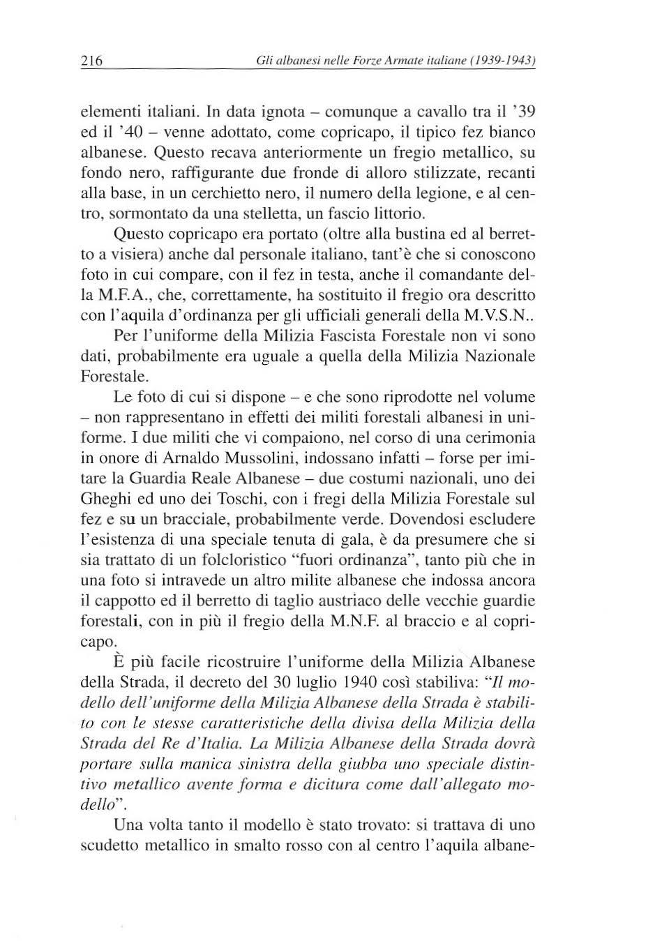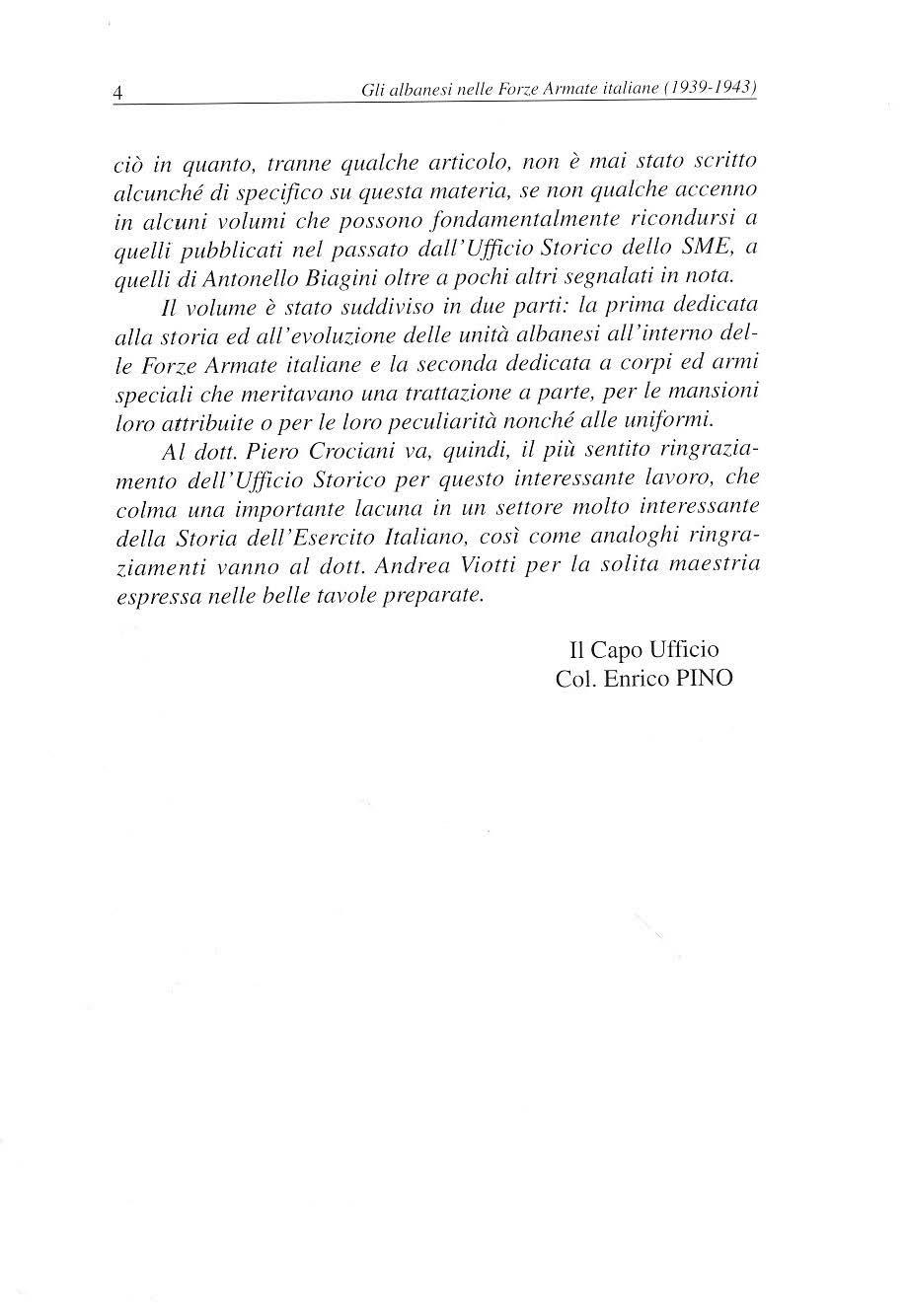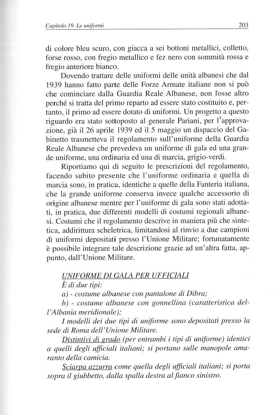 Il volume è stato suddiviso in due parti: la prima dedicata alla storia ed all'evoluzione delle unità albanesi all'interno delle Forze Armate italiane e la seconda dedicata a corpi ed armi speciali che meritavano una tratta zione a parte , per le mansioni loro attribu ite o per le loro peculiarità nonch é alle un(fonni.