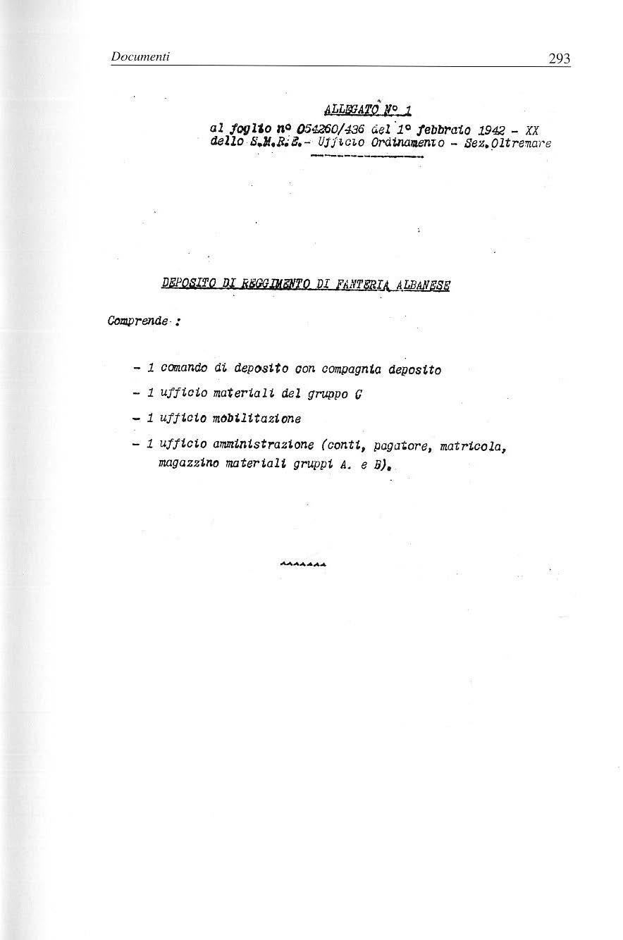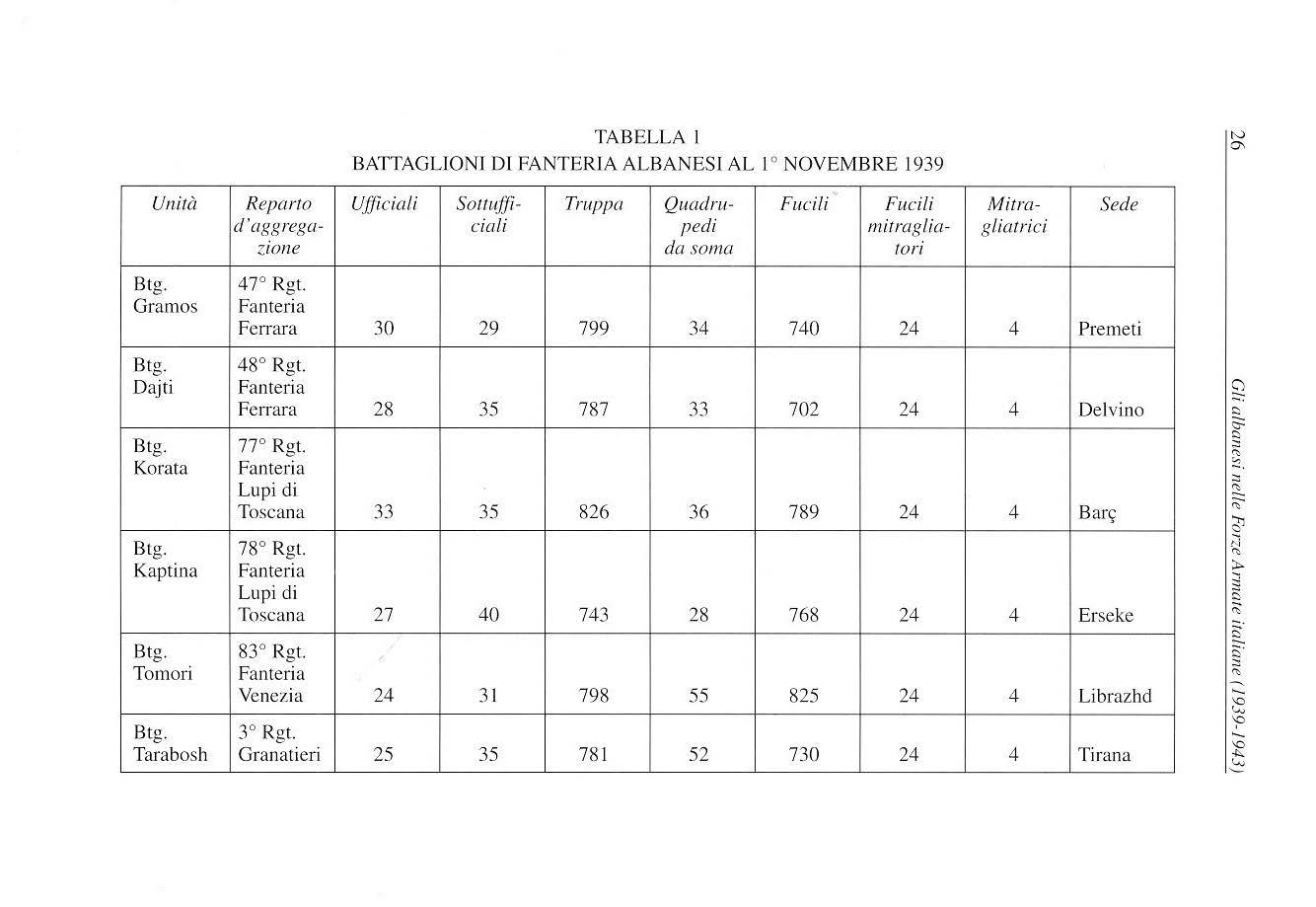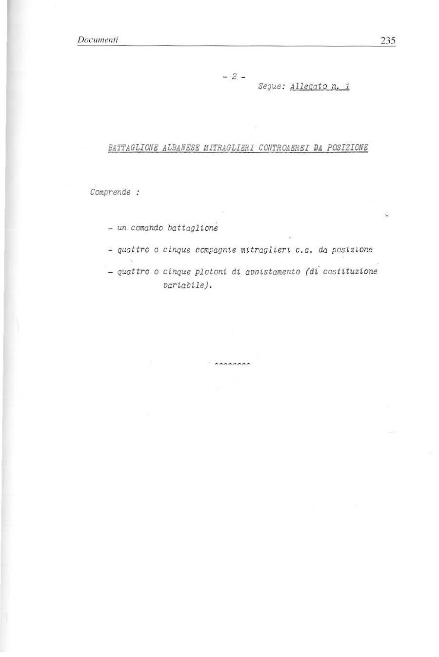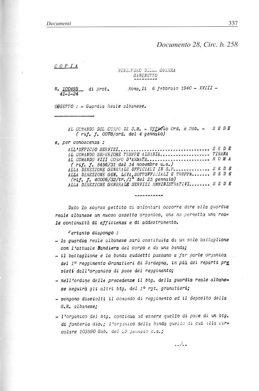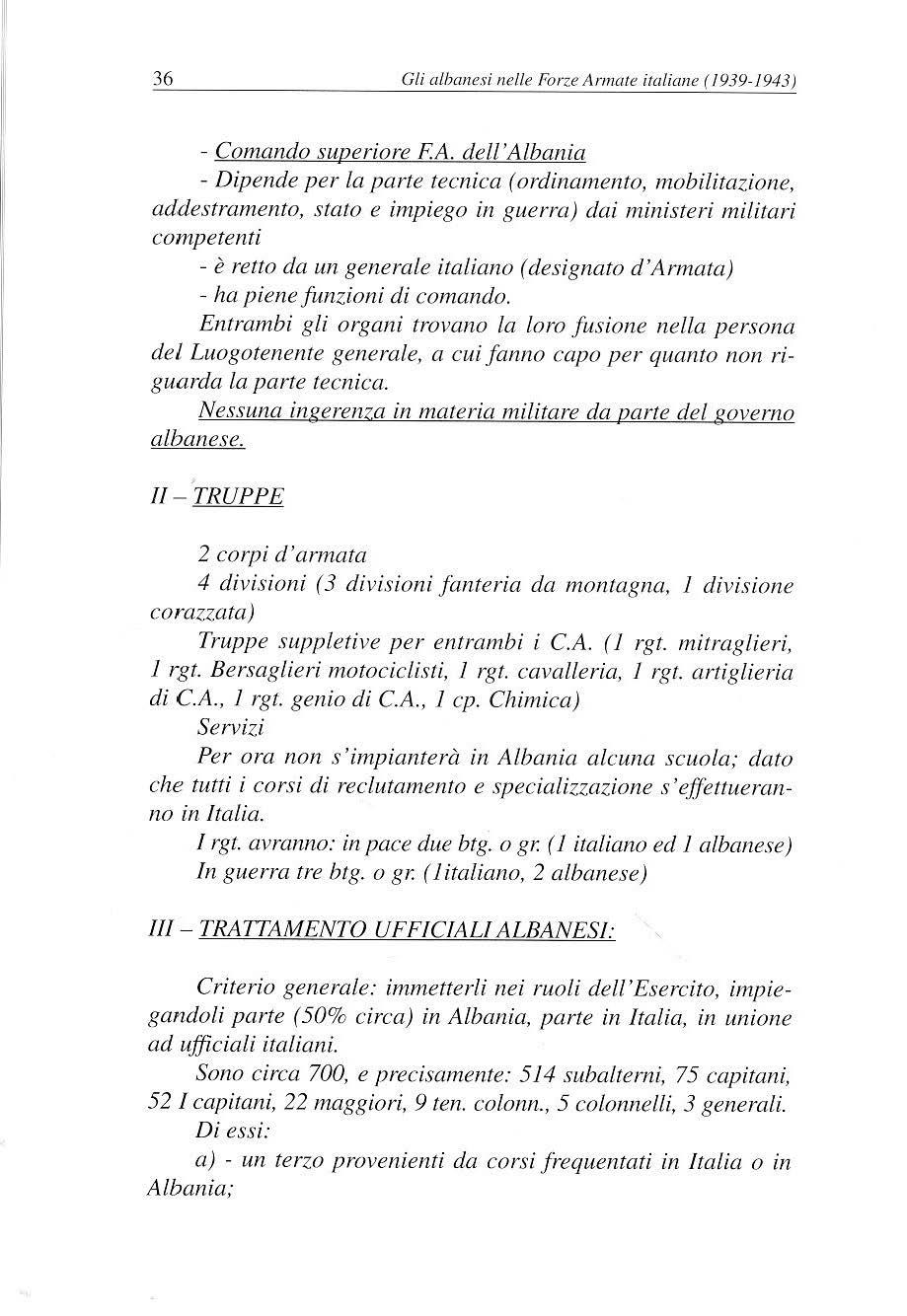 Innan zi tut to era specificato che non si doveva prevedere la costituzione di grandi unit à a lban esi "per difficoltà cli inqu adramen to e p er non creare ambienti adatti allo svi luppo di pericolose presunzioni " e che ci si sarebbe limit ati alla formazione di reparti minori da inserire nelle nost r e unit à in Albania. Si volevano creare sei battaglioni di fanteria, quattro batterie da 75/13 - all ' inc irca gli stessi reparti esiste nti sotto Zog - due compagnie del genio e dieci repart i presidiari oltre ad un ' unità di rappresentanza il reggim ento (ridotto a battaglione) della Gu ard ia Real e Albanese, eia dislocare, quest'ultimo, a Roma .