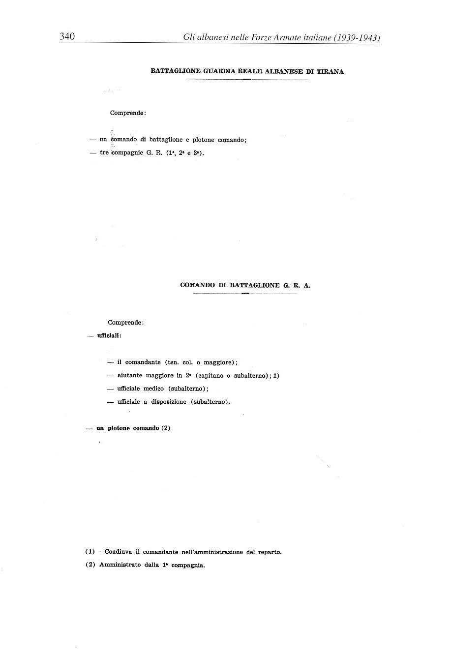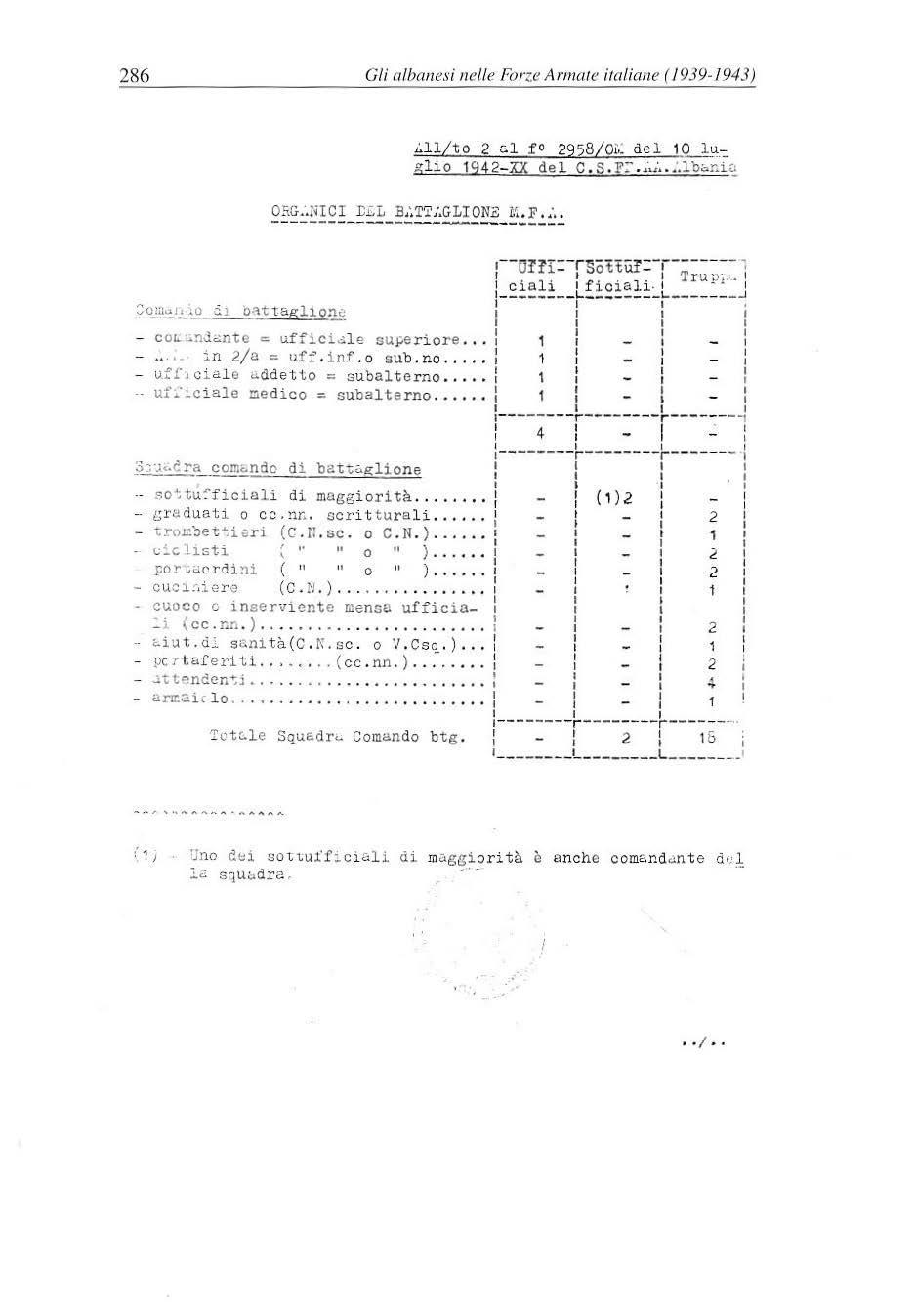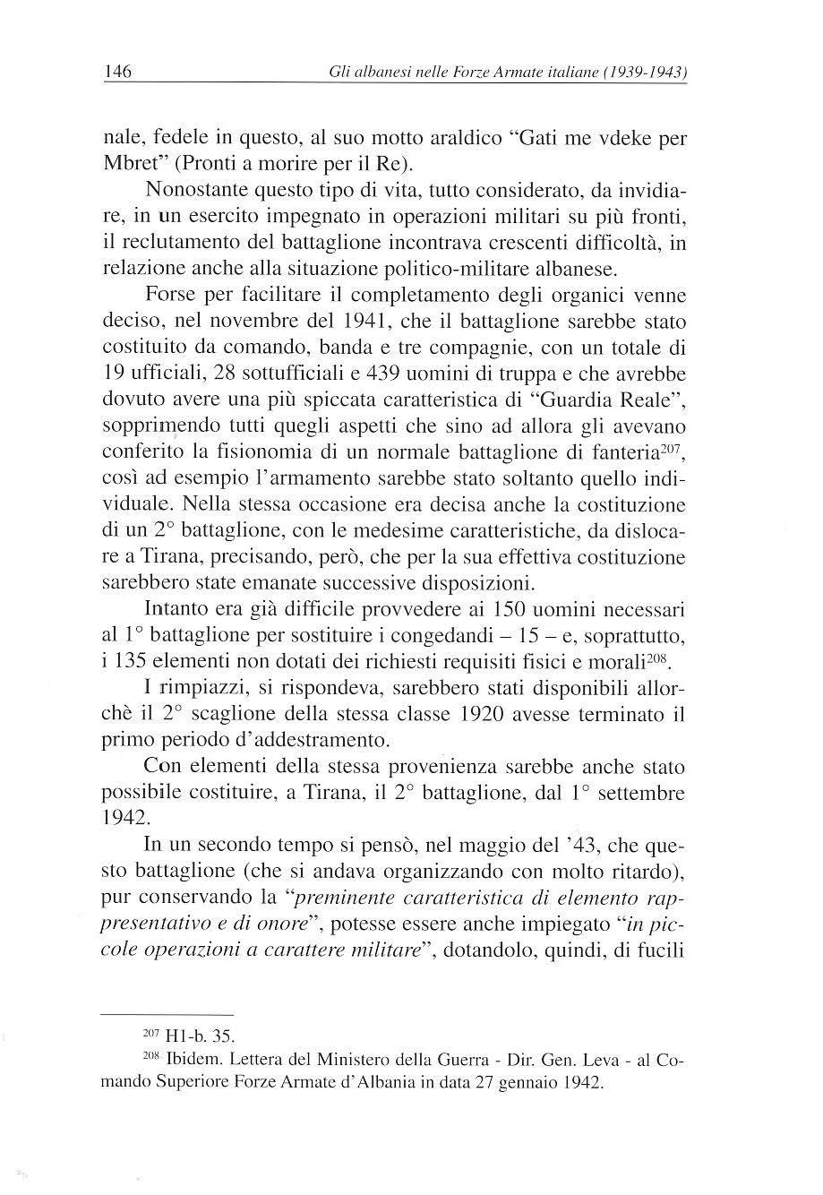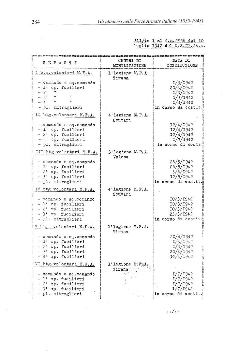 Innan zi tut to era specificato che non si doveva prevedere la costituzione di grandi unit à a lban esi "per difficoltà cli inqu adramen to e p er non creare ambienti adatti allo svi luppo di pericolose presunzioni " e che ci si sarebbe limit ati alla formazione di reparti minori da inserire nelle nost r e unit à in Albania. Si volevano creare sei battaglioni di fanteria, quattro batterie da 75/13 - all ' inc irca gli stessi reparti esiste nti sotto Zog - due compagnie del genio e dieci repart i presidiari oltre ad un ' unità di rappresentanza il reggim ento (ridotto a battaglione) della Gu ard ia Real e Albanese, eia dislocare, quest'ultimo, a Roma .