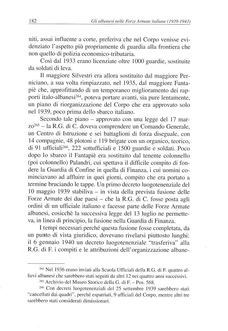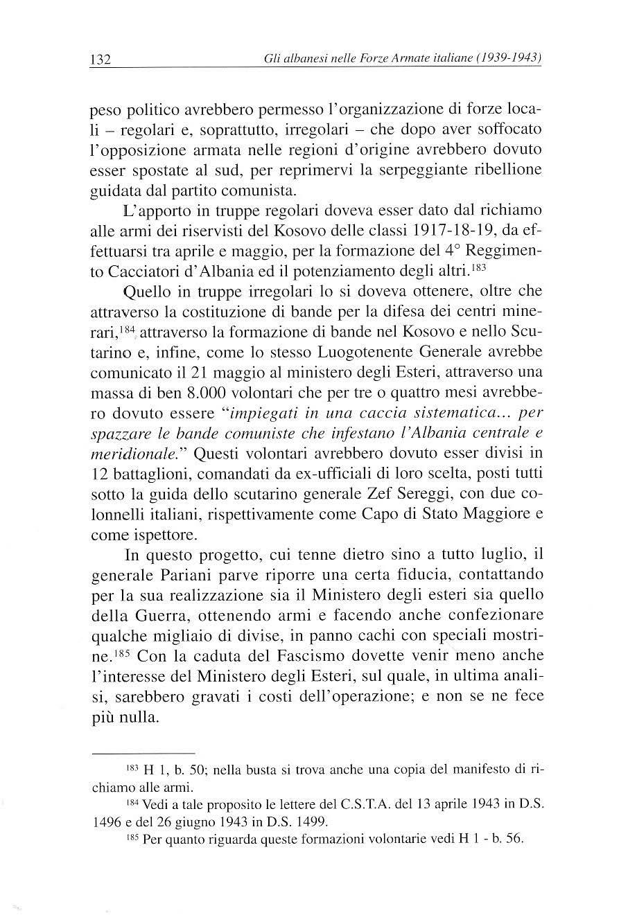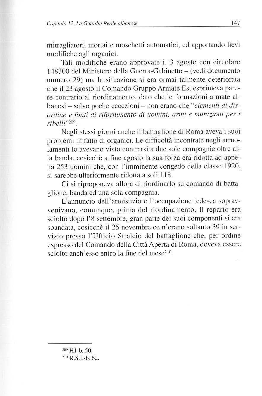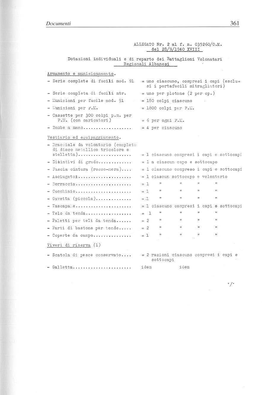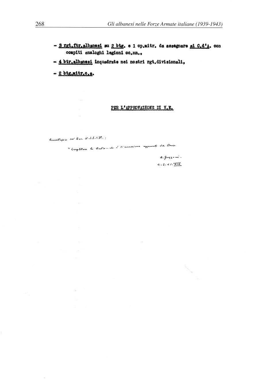 Innan zi tut to era specificato che non si doveva prevedere la costituzione di grandi unit à a lban esi "per difficoltà cli inqu adramen to e p er non creare ambienti adatti allo svi luppo di pericolose presunzioni " e che ci si sarebbe limit ati alla formazione di reparti minori da inserire nelle nost r e unit à in Albania. Si volevano creare sei battaglioni di fanteria, quattro batterie da 75/13 - all ' inc irca gli stessi reparti esiste nti sotto Zog - due compagnie del genio e dieci repart i presidiari oltre ad un ' unità di rappresentanza il reggim ento (ridotto a battaglione) della Gu ard ia Real e Albanese, eia dislocare, quest'ultimo, a Roma .