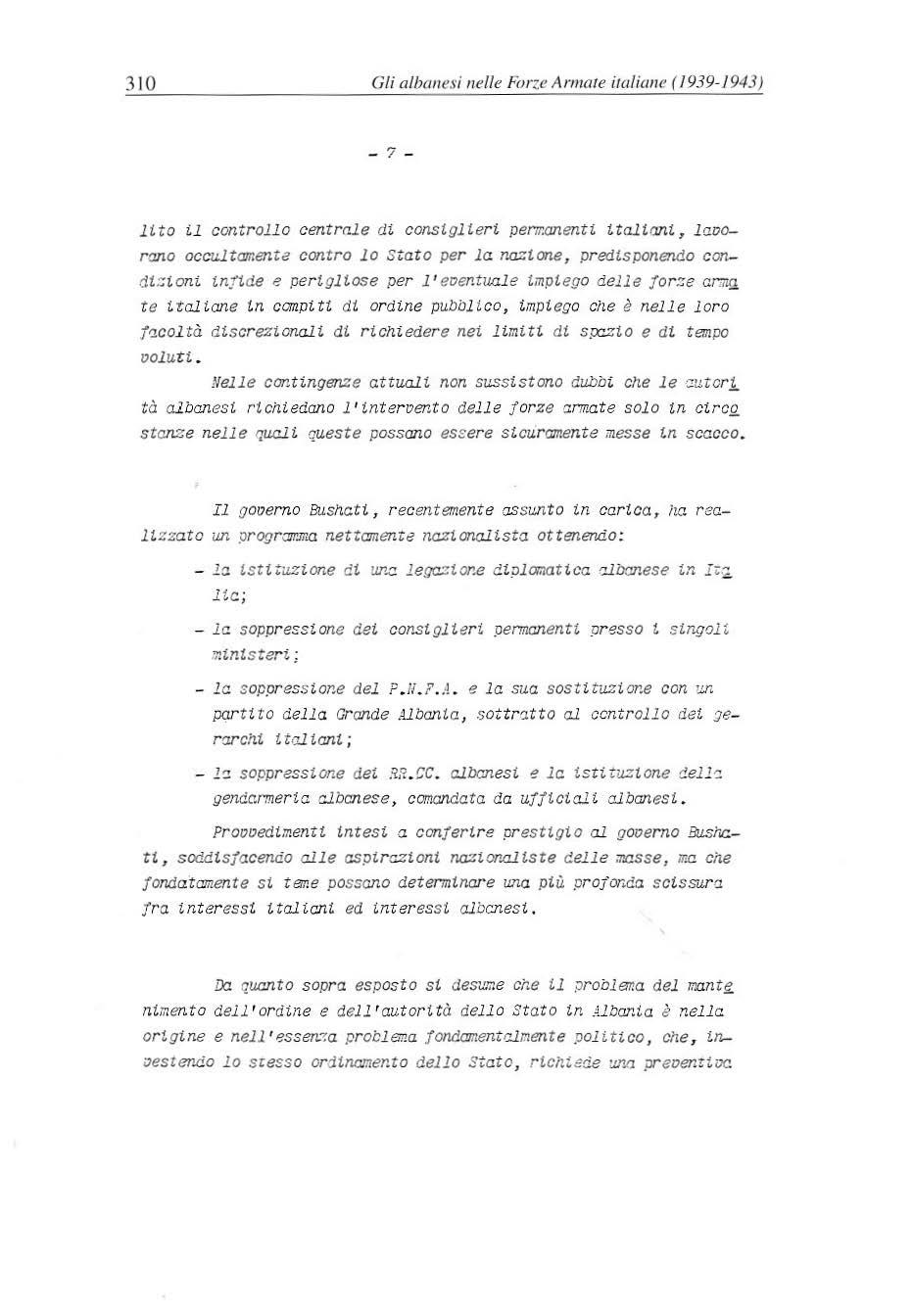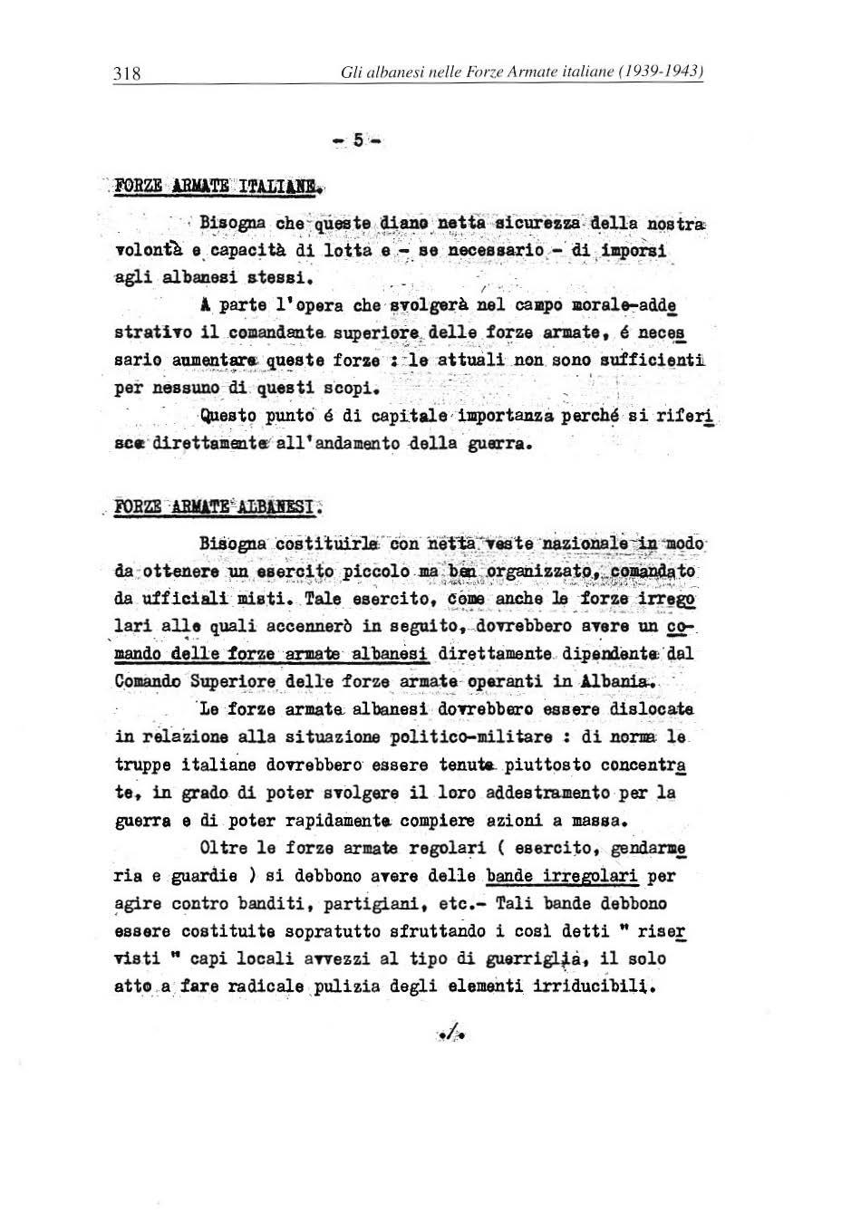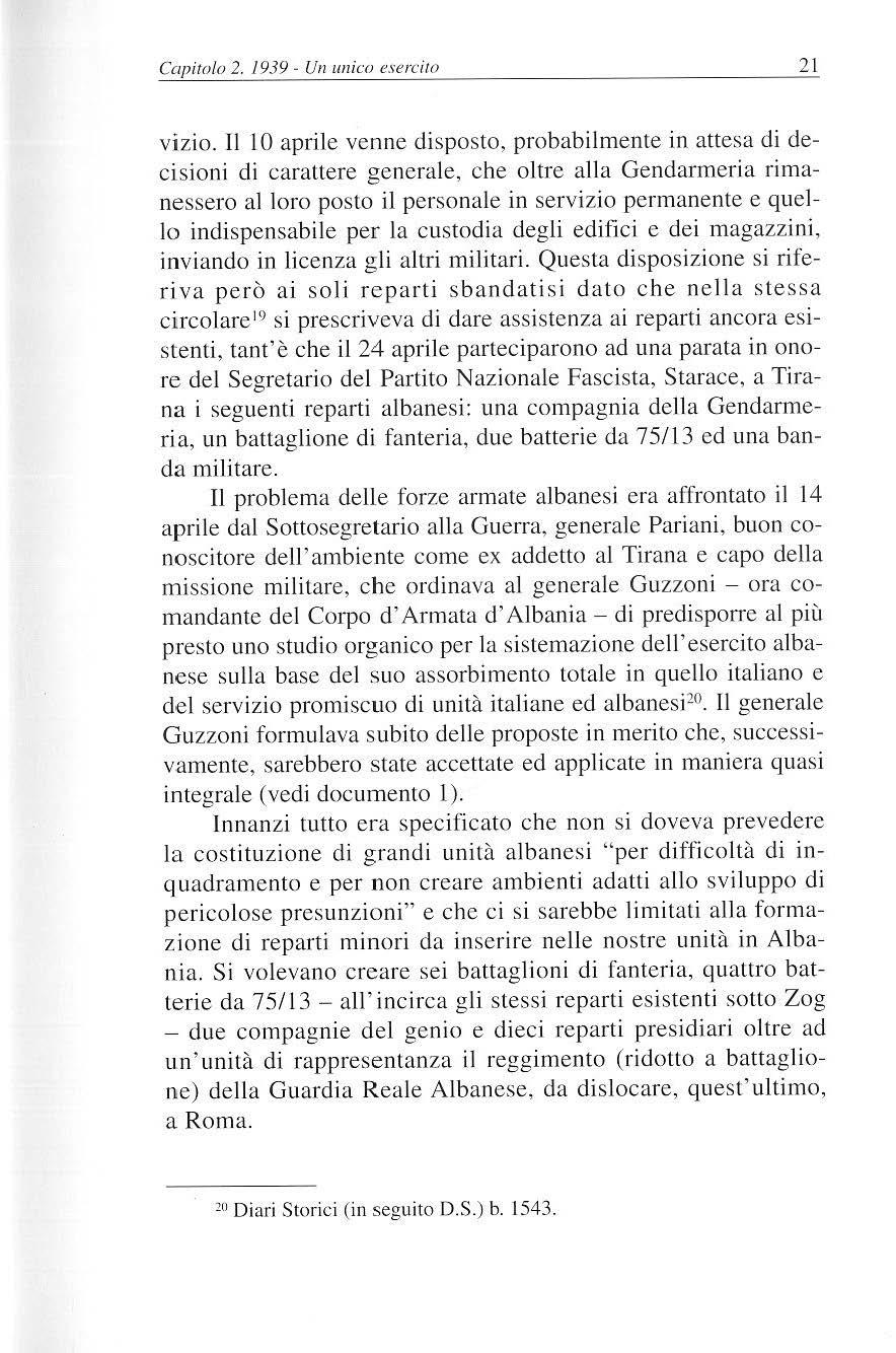 Il problema delle forze armate albanes i e ra affrontato i I 14 aprile dal Sottosegretario alla Guerra, generale Pari ani, buon conoscitore dell'ambiente come ex addetto al Tirana e capo della missione militare, che ordinava al generale Gu zzoni - ora comandante del Corpo d'Armata cl' Albania - di predisporre al più presto uno studio organico per la sistemazione dell'esercito a lbanese sulla base del s uo assorbime nto totale in quello italiano e del serv izio pro misc uo di unità italiane ed a lb anesi20 . Il generale Guzzoni formulava sub ito delle proposte in merito che, successivamente , sarebbero state accettate ed applicate in maniera quasi integrale (vedi do c um ento 1).