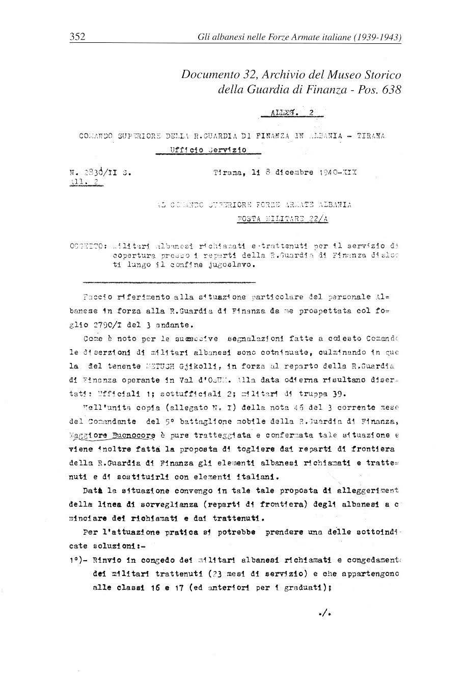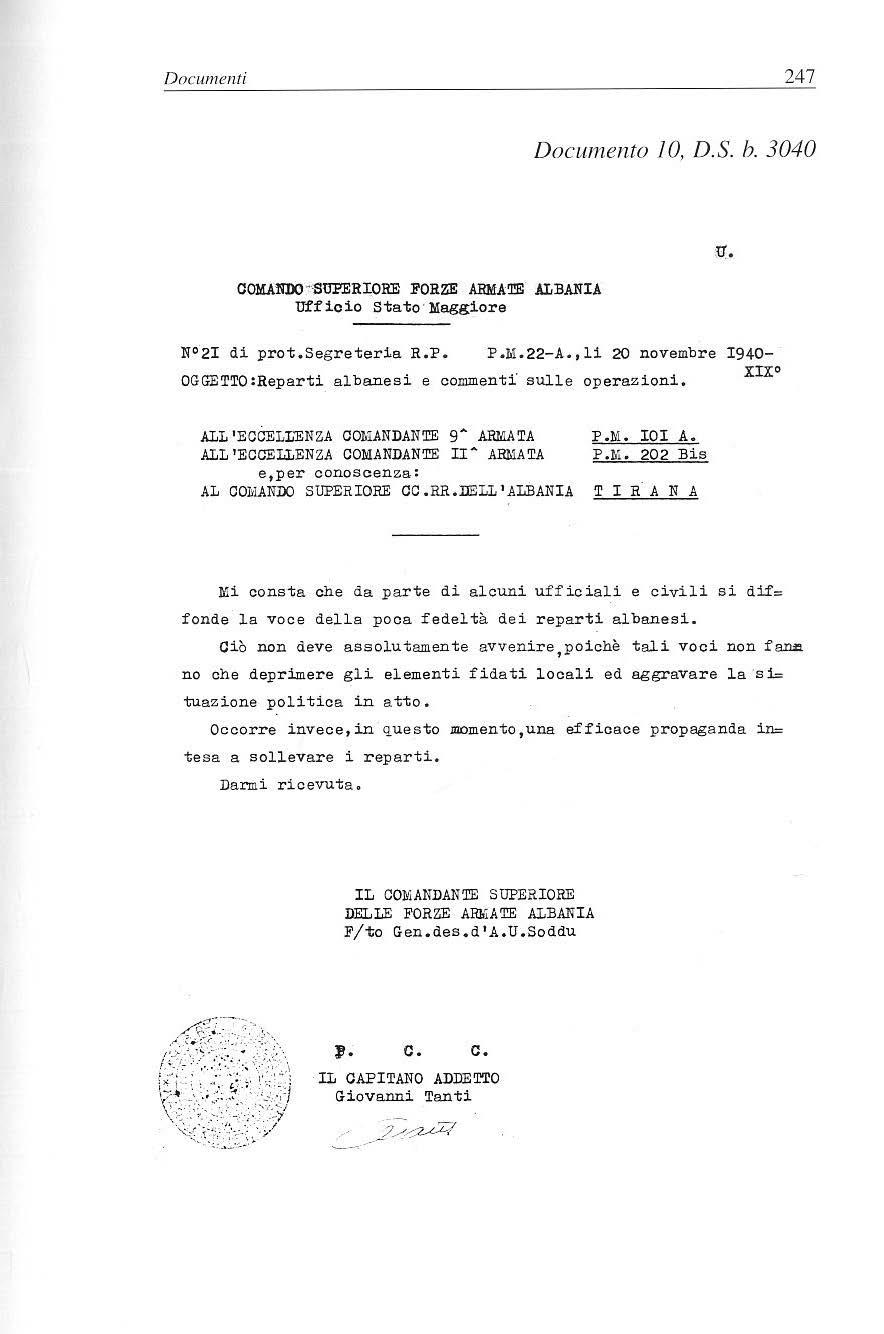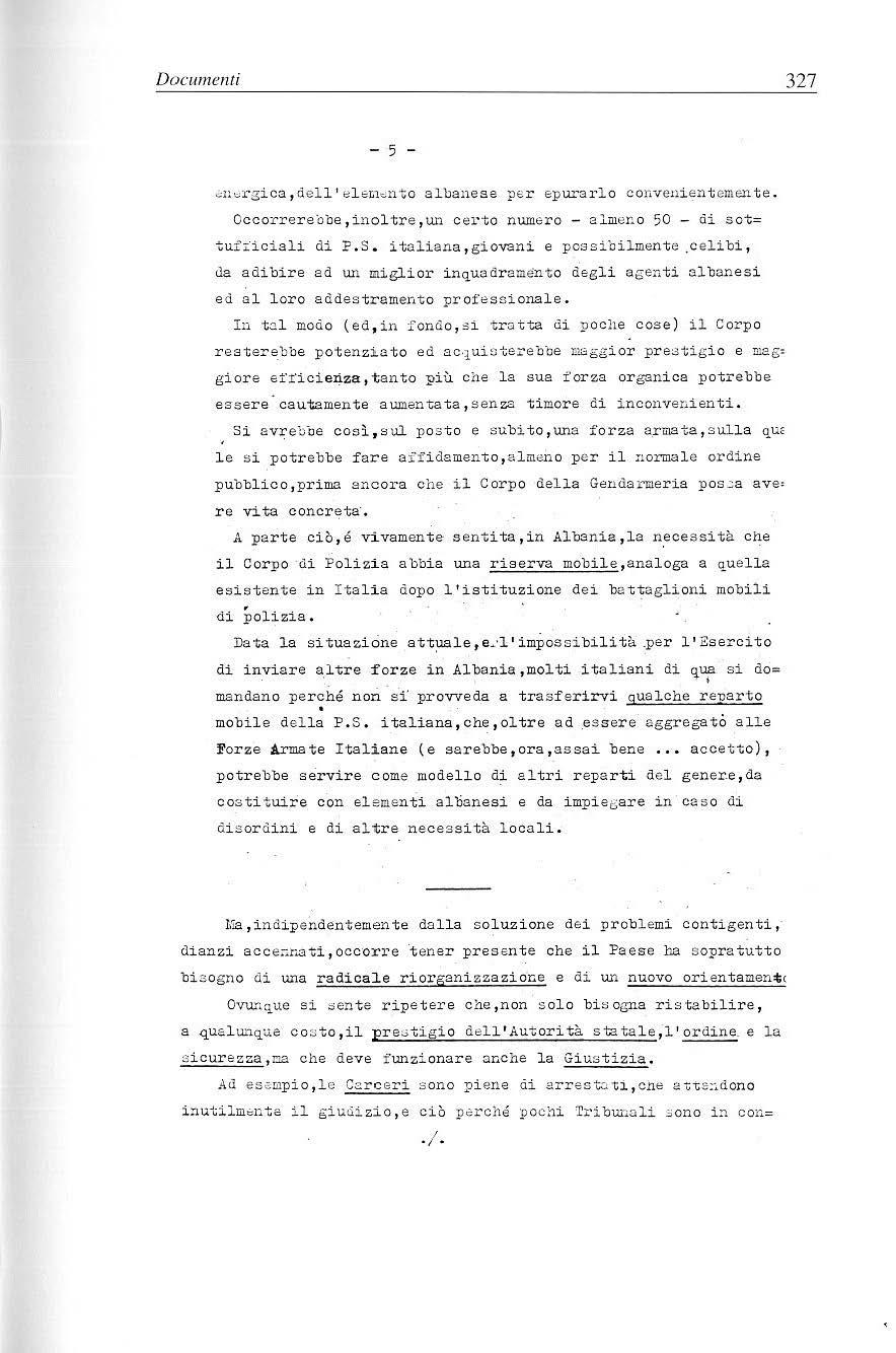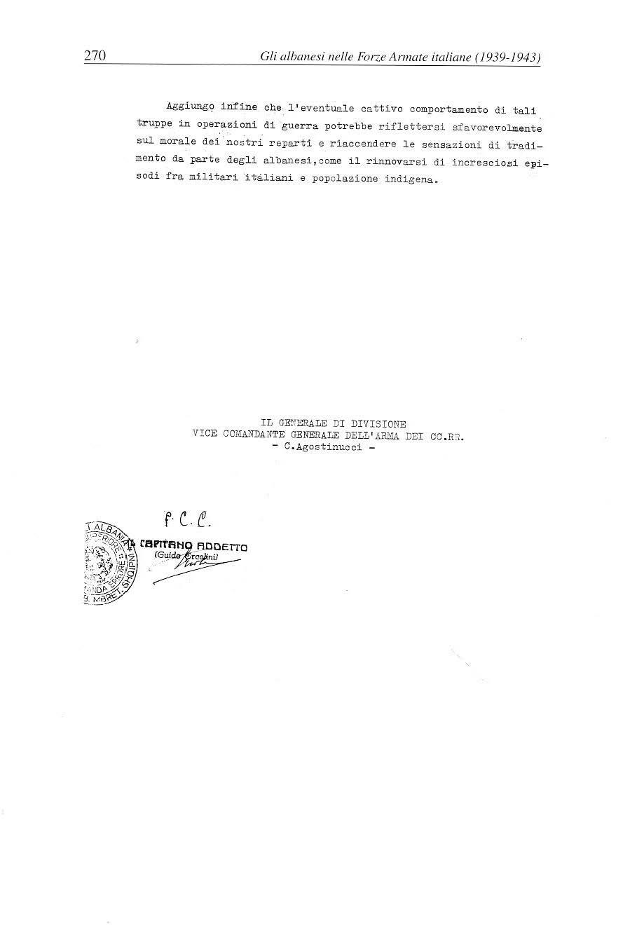 Il problema delle forze armate albanes i e ra affrontato i I 14 aprile dal Sottosegretario alla Guerra, generale Pari ani, buon conoscitore dell'ambiente come ex addetto al Tirana e capo della missione militare, che ordinava al generale Gu zzoni - ora comandante del Corpo d'Armata cl' Albania - di predisporre al più presto uno studio organico per la sistemazione dell'esercito a lbanese sulla base del s uo assorbime nto totale in quello italiano e del serv izio pro misc uo di unità italiane ed a lb anesi20 . Il generale Guzzoni formulava sub ito delle proposte in merito che, successivamente , sarebbero state accettate ed applicate in maniera quasi integrale (vedi do c um ento 1).