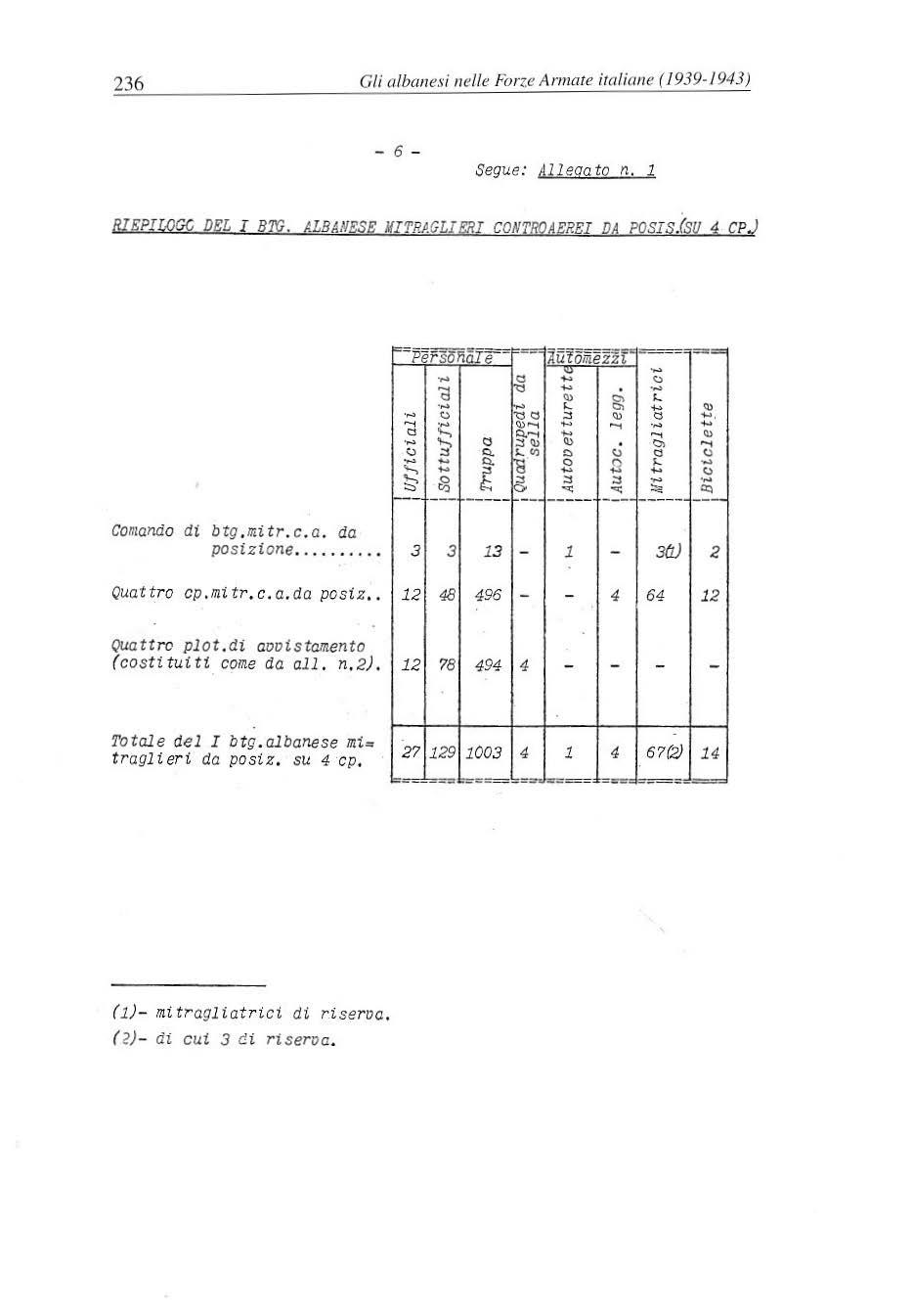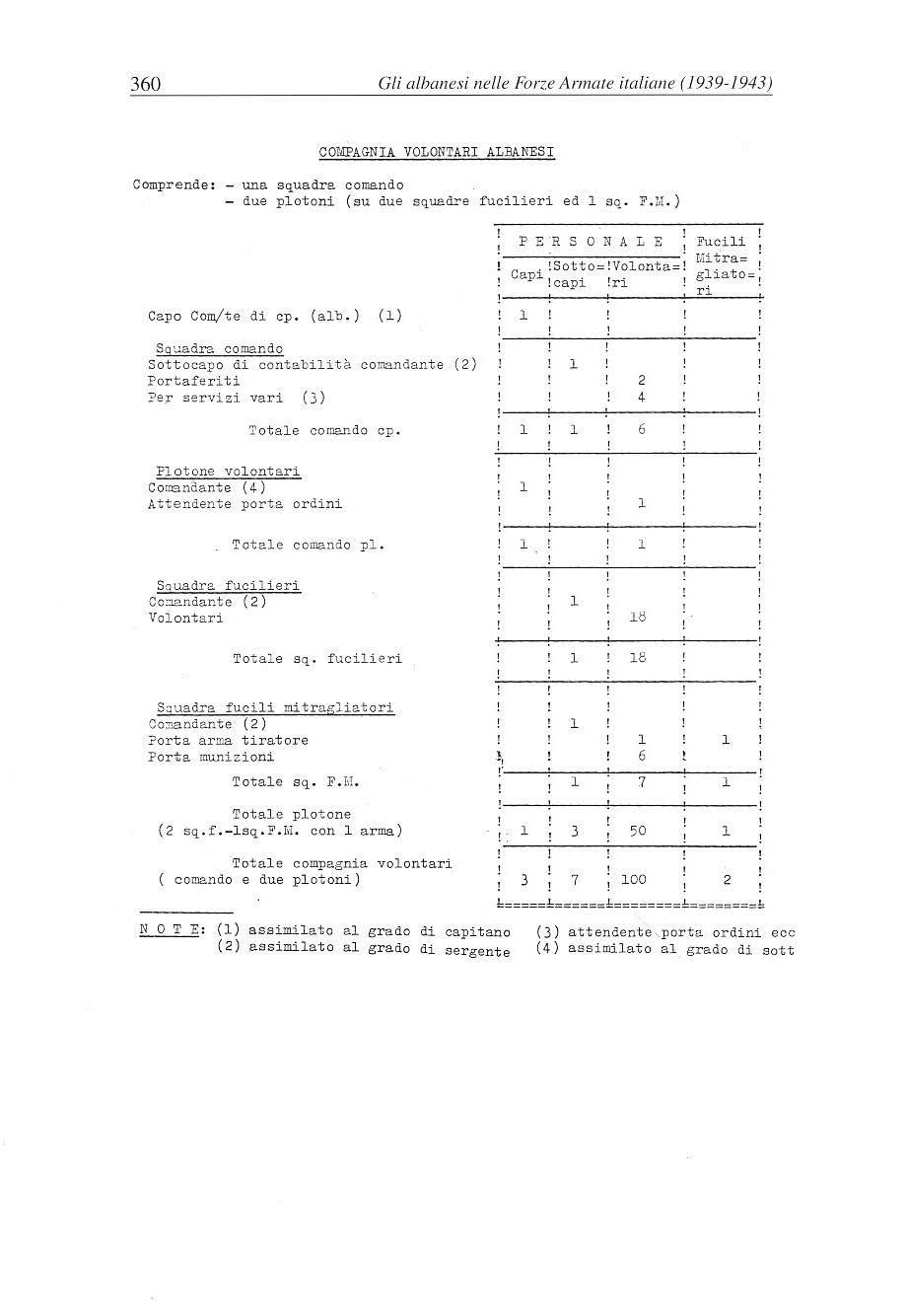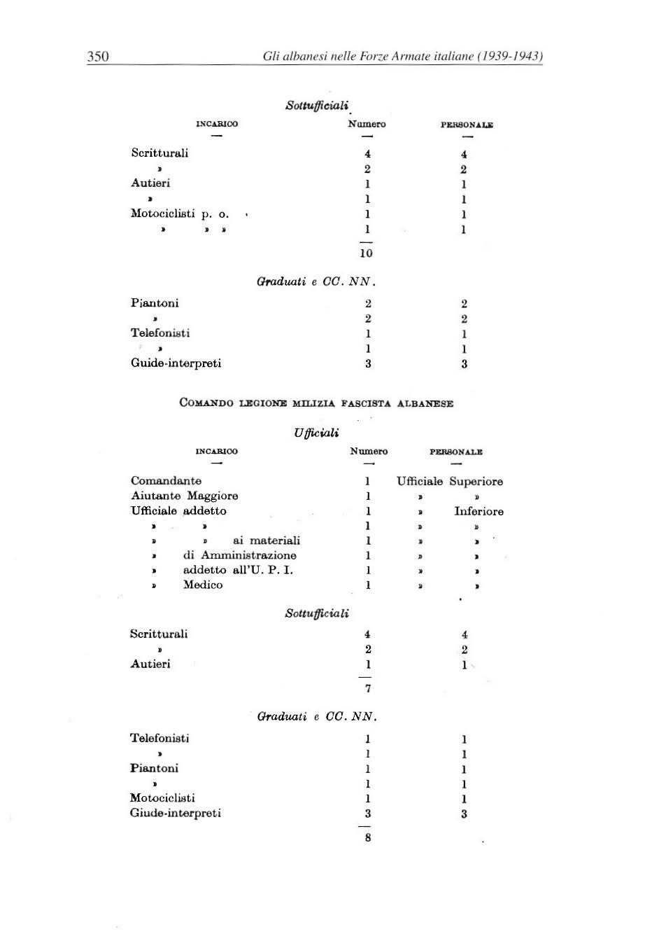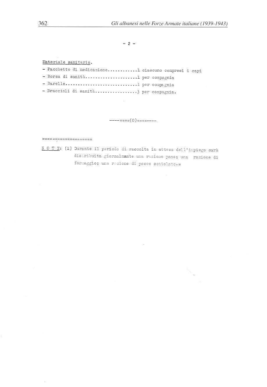 A quelli delle unità indiv.isionate si dovevano poi aggiungere gli ufficiali addetti ai comandi e agli uffici della Difesa Territoriale e gli elementi albanesi dei serviz i e delle unità presidiarie e più precisamente nove ufficiali, sei sottufficiali e 29 graduati e soldati della Direzione di Commissariato, cinque, undici e 109 del Centro Automobilist ico, due, quattordici e l 59 della compag ni a presidia ria cli Tirana , oltre agli elementi della Guardia Reale a Roma , agli allievi ed uffic iali che frequenta vano accademie e scuo le cli applicazione in Ita lia ed agli ufficiali che prestavano servizio in reparti italiani dislocati in A lb ania25 .