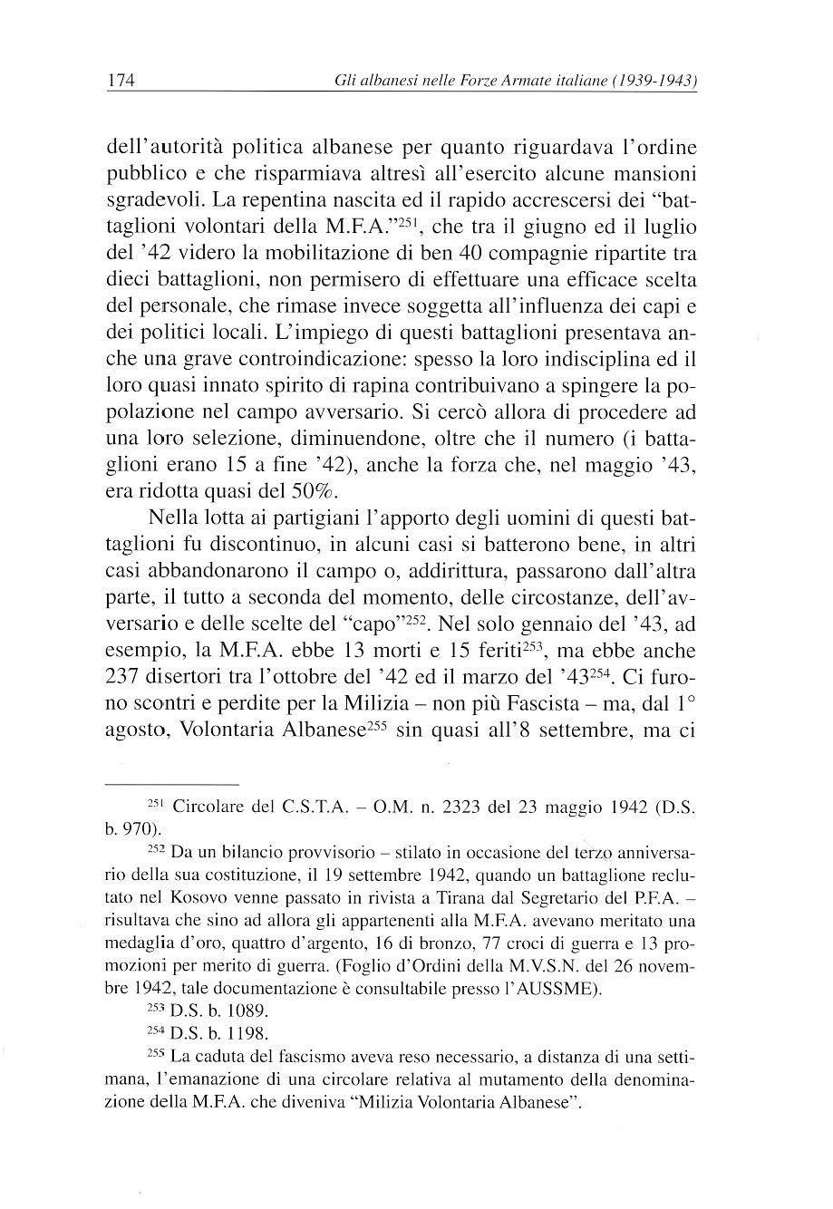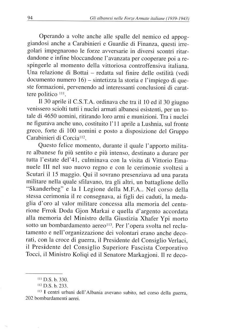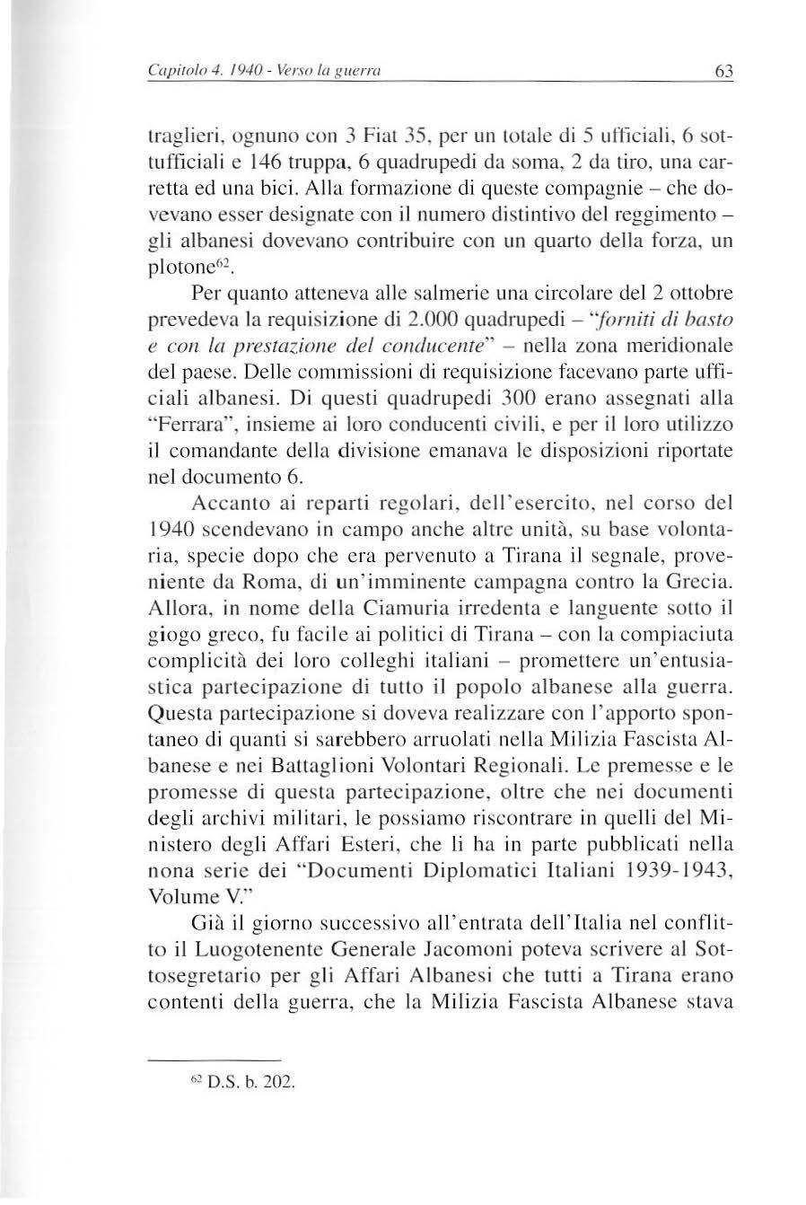 A quelli delle unità indiv.isionate si dovevano poi aggiungere gli ufficiali addetti ai comandi e agli uffici della Difesa Territoriale e gli elementi albanesi dei serviz i e delle unità presidiarie e più precisamente nove ufficiali, sei sottufficiali e 29 graduati e soldati della Direzione di Commissariato, cinque, undici e 109 del Centro Automobilist ico, due, quattordici e l 59 della compag ni a presidia ria cli Tirana , oltre agli elementi della Guardia Reale a Roma , agli allievi ed uffic iali che frequenta vano accademie e scuo le cli applicazione in Ita lia ed agli ufficiali che prestavano servizio in reparti italiani dislocati in A lb ania25 .