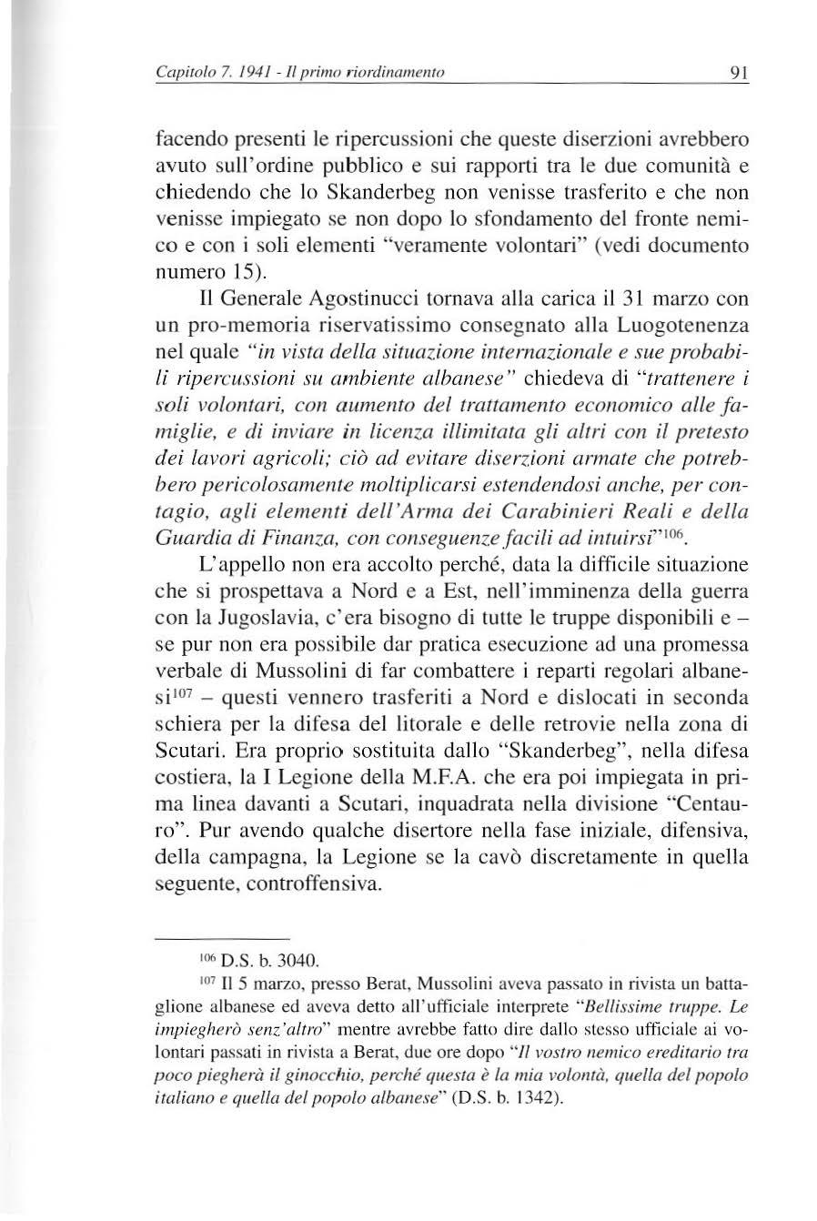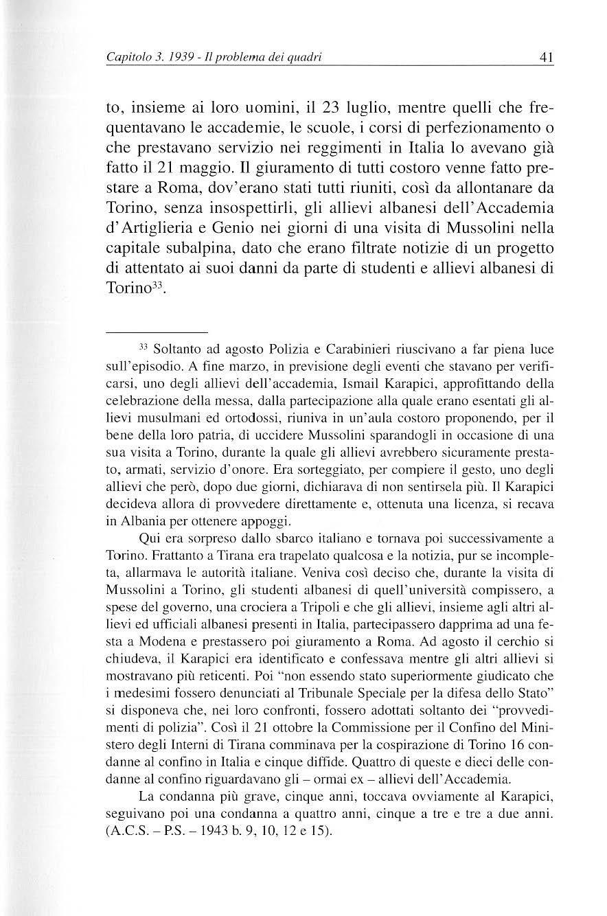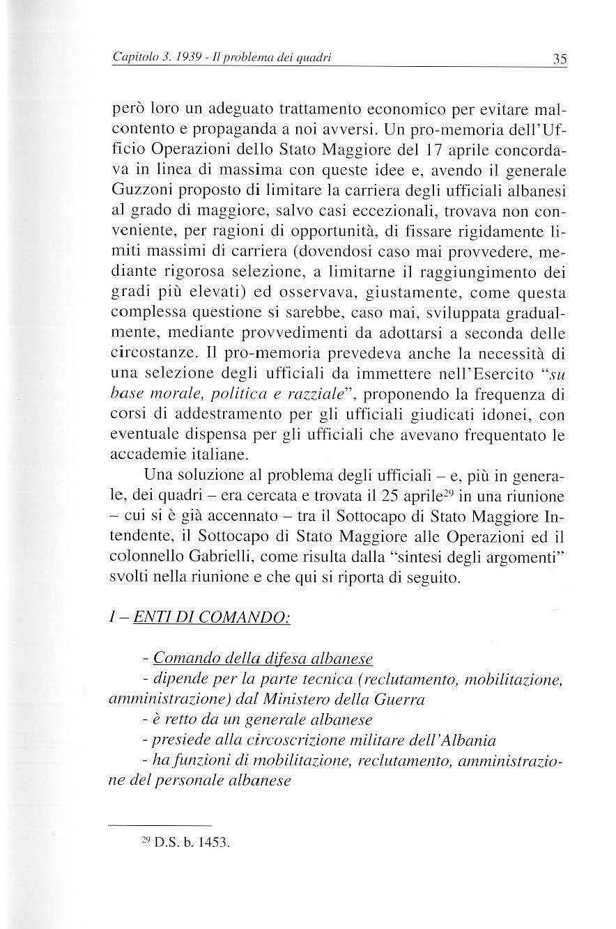 Il documento affrontava poi il problema della ca1Tiera degli uffic iali albanesi, che con l'organizzazione proposta avreb bero visto la loro carriera limitata al grado di maggiore, ed avanzava proposte in merito ad eventuali ulteriori svilu ppi di carriera , accennando anche al delicato problema delle capacità professionali e dell 'affidabilità degli ufficiali stessi, di cui s i tratterà più specificatamente nel capitolo successivo.