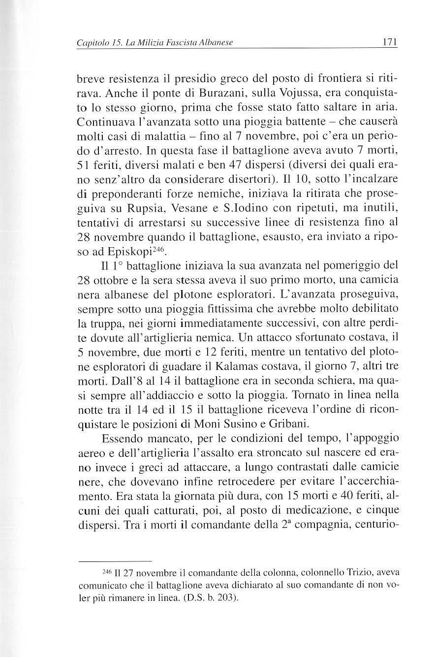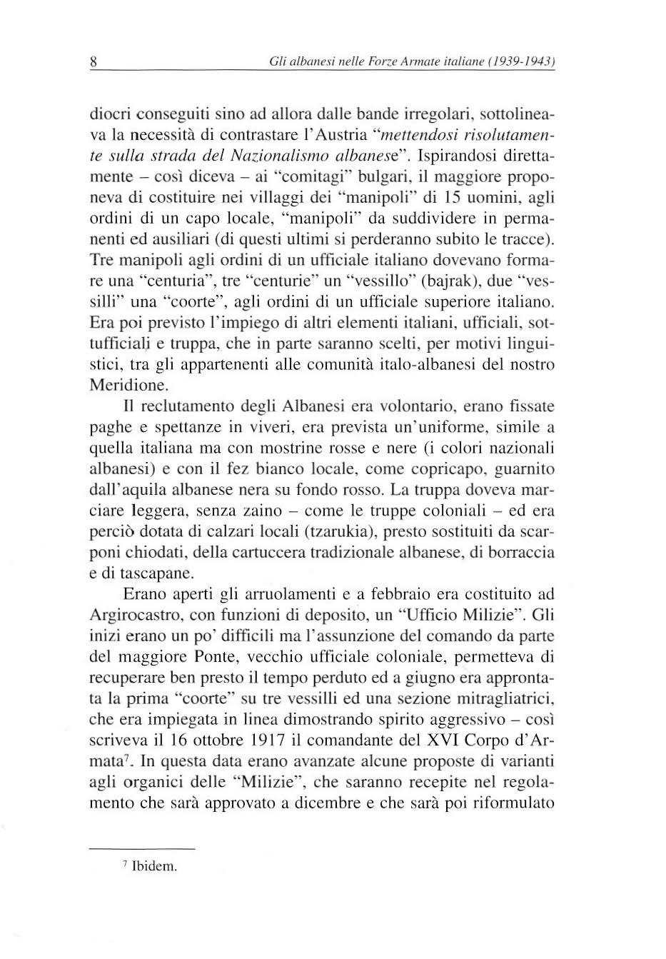Erano aperti g li arruo lamenti e a febbraio era costi tuito ad Argirocastro , con fun z io ni di d epos ito , un "Ufficio Mili z ie". Gli ini z i erano un po ' diffi ci li ma l'assunzione del comando da p a rt e del maggiore Po nt e, ve cc hi o ufficiale coloniale, perme tteva cli rec uperare be n presto il te mpo perduto ed a giugno era approntata la prima " coorte " s u tre vess illi ed una sez ione mitragliatrici , che era impi eg ata in li nea dimo st rando spir ito aggre ss ivo - co sì scriveva il 16 ottobre ] 917 il comandante d e l XVI Corpo cl ' Armata7 In questa data erano a va nza te alcun e proposte di varianti agli organi c i delle " Milizie··, che s arann o recepit e nel regolame nto che sarà approv ato a dic embre e che !jarà p oi riformu lato