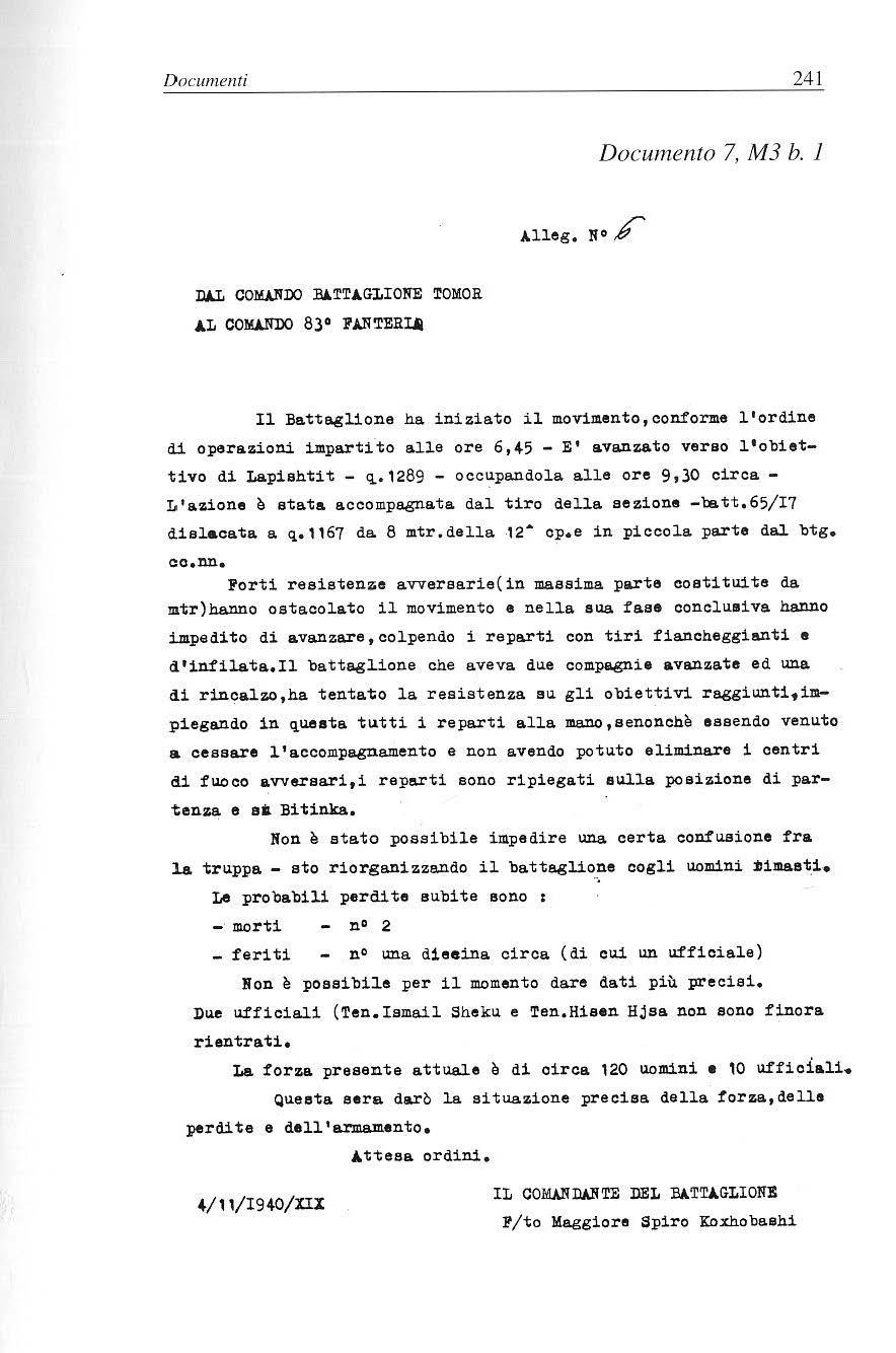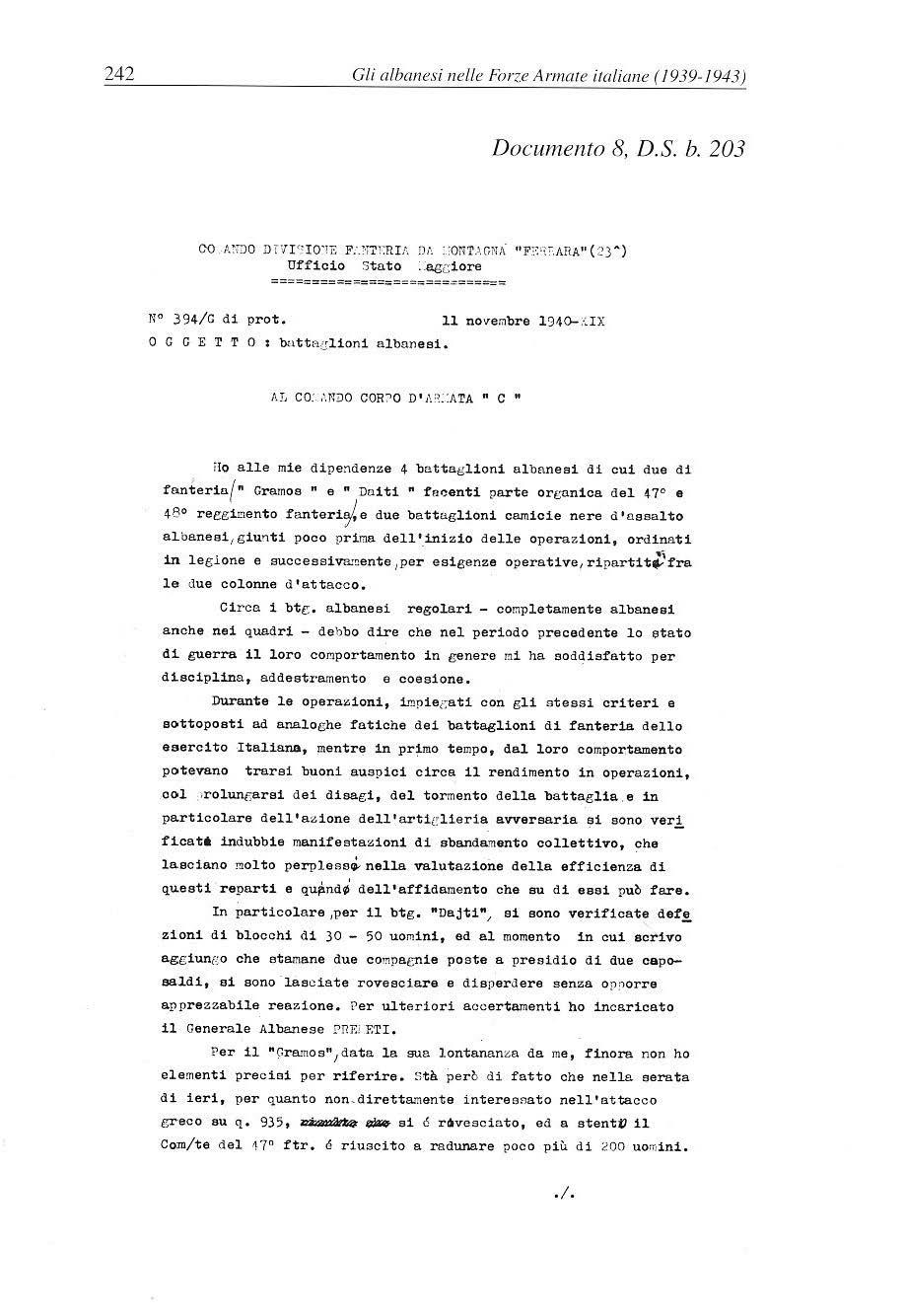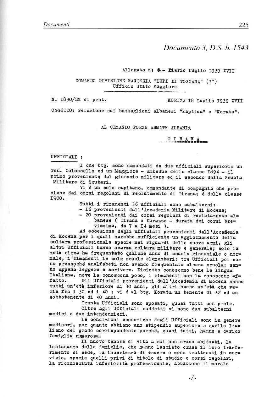 Quali fossero allora le condizion i dei reparti a lb ane s i , con ufficiali poco preparati , con graduat i per una buona metà analfabeti, così come gran parte della truppa - e con una conoscenza, ovviamente, ancora poco diffusa della lingua itali a na - lo possiamo ricavare da un rapporto stilato a luglio dalla Divisione "Lupi di Toscana" sui due battaglioni " Kaptina" e " Korata" appena assegnatile e riportata ne l documento numero 3.