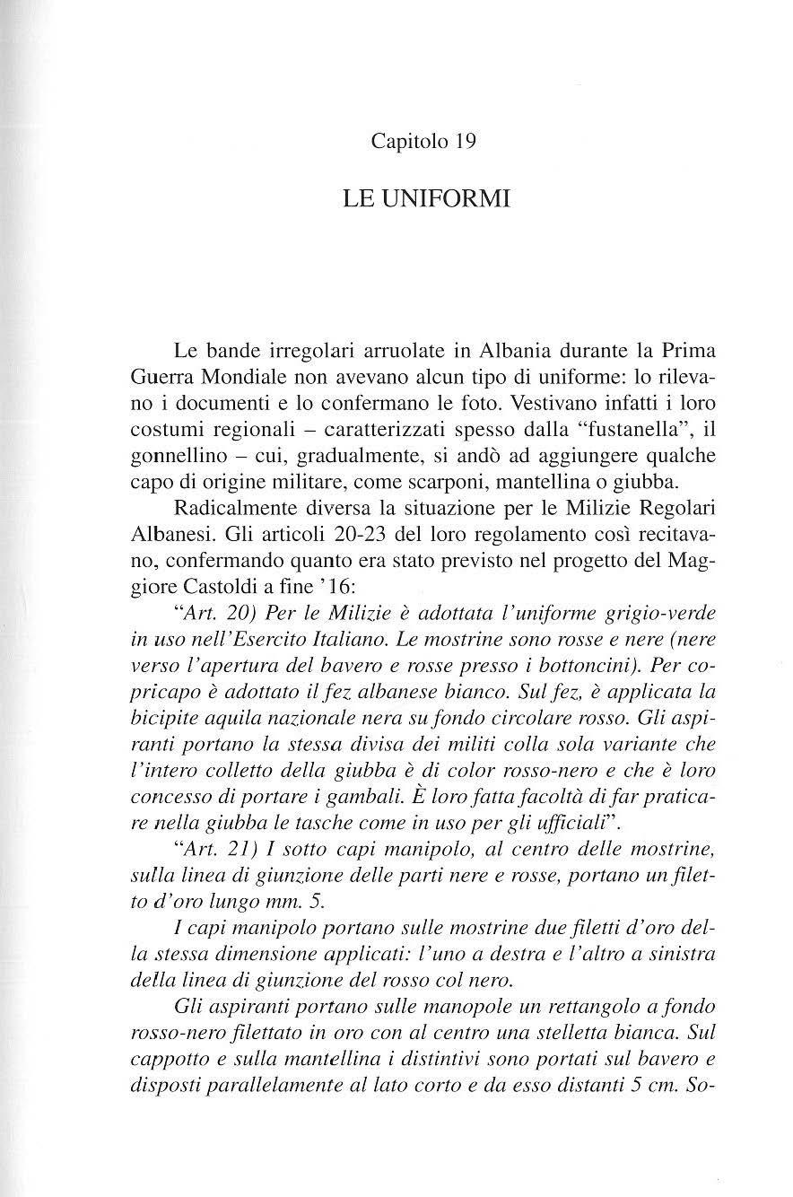La terza componente dell'apporto albanese allo sforzo bellico ital iano, la più interessante dal punto cli vista politico e eia quello militare, era data dalle "Mili z i e Regolari Albanesi" , c he vennero organizzate sia perché le bande irre go lari non davano eccessivo affidamento sia perché - una volta che il 3 giugno 19 17 era sta ta proclamata da parte italiana l'indipendenza cieli' Albania - ci semb rò necessario do tare il paese di proprie forze armate che - come dirà l'articolo l del rego lamento delle Milizie - pur se costituivano " per ora parte integrante delle truppe di occupazione" formavano altresì "il nucleo di base del futuro eserc ito albanese". Il progetto d i costituzione cli que ste milizie era redatto dal maggiore Castolcli alla fine ciel 1916 - per l 'esattezza il 21 dicembre - ed era approvato dal Capo di Stato Maggiore il 2 gennaio successivo 6 Nella relazione che accompagnava il progetto il maggiore Castoldi, fatti presenti i risultati me-