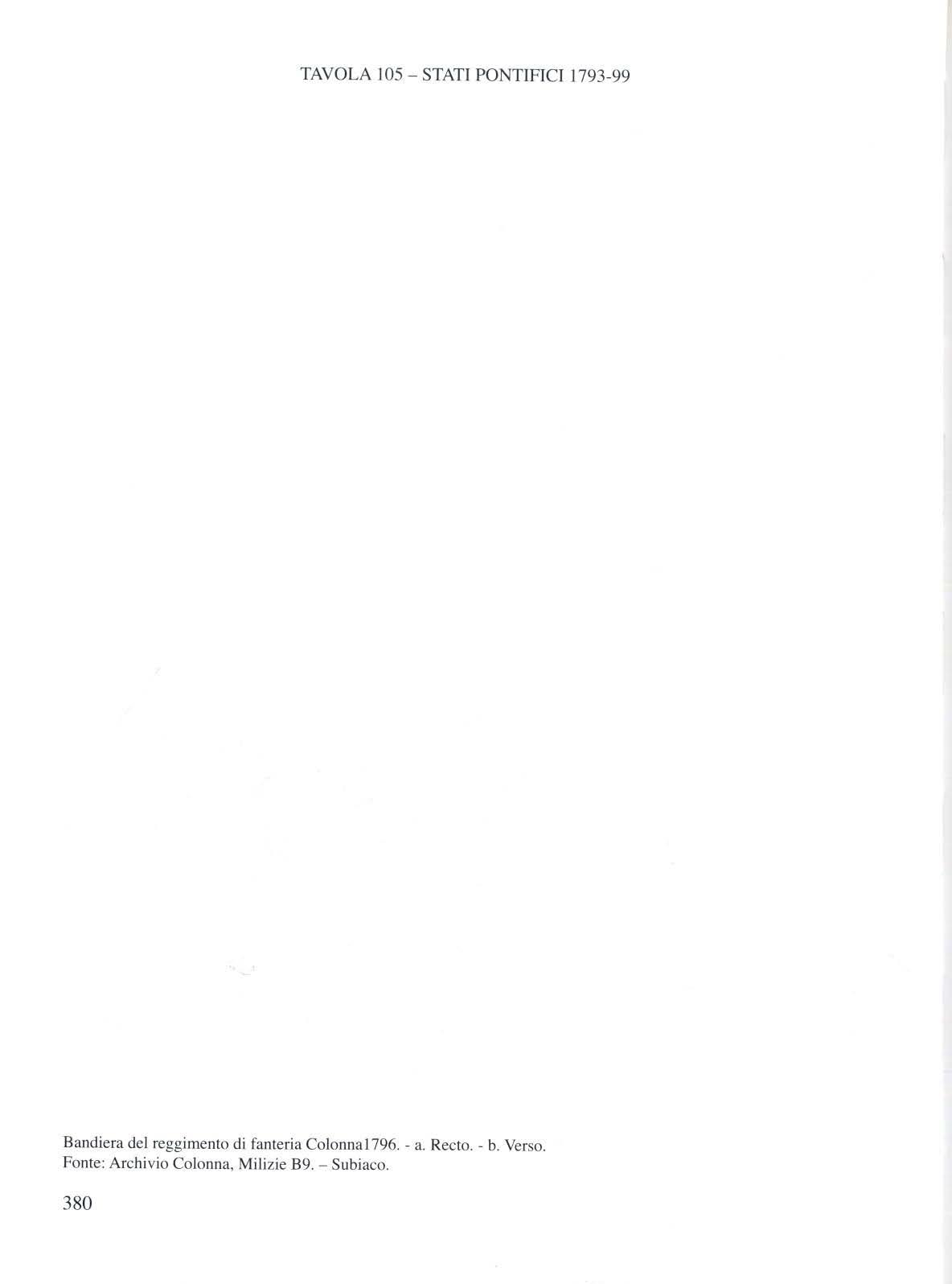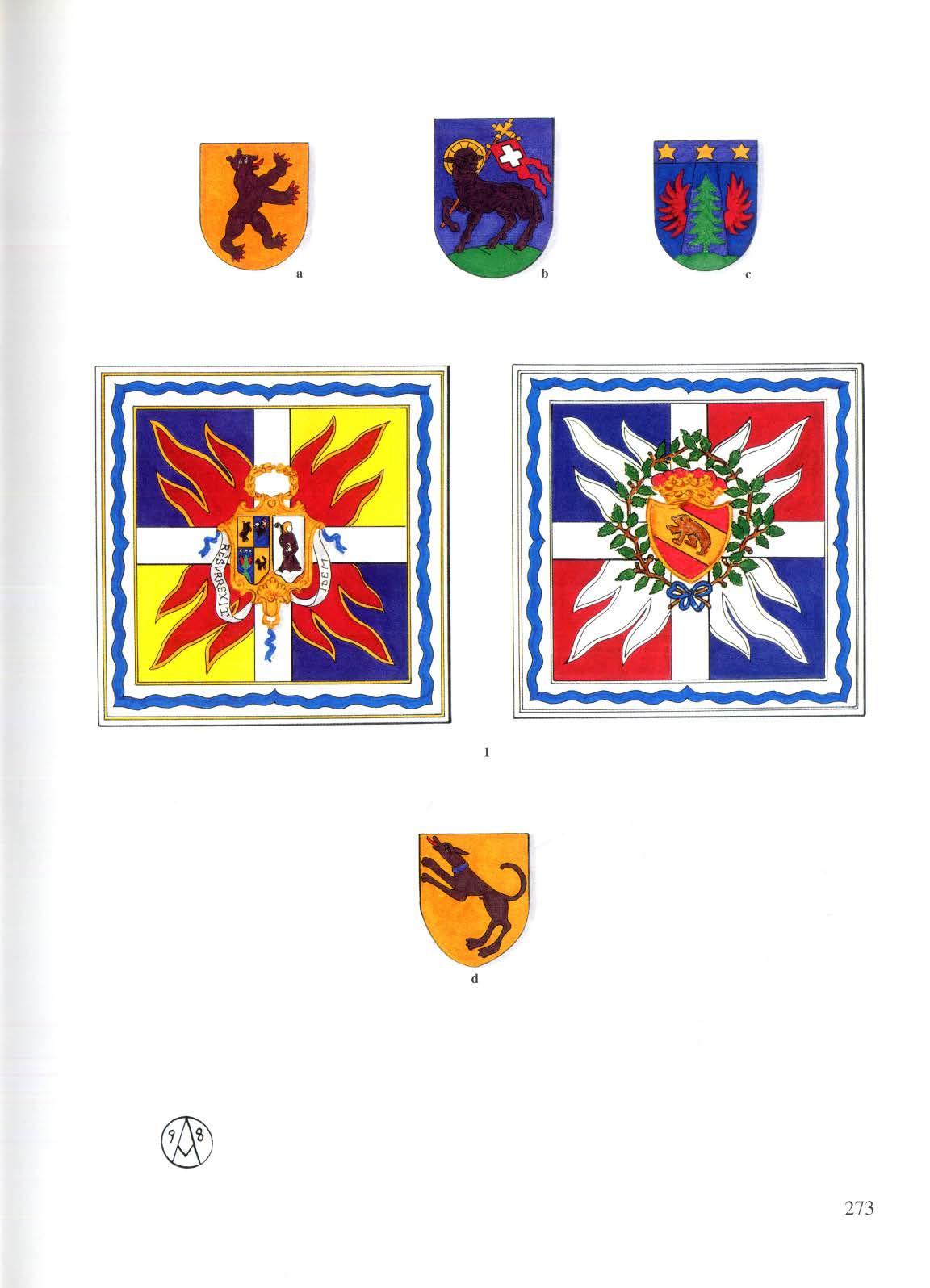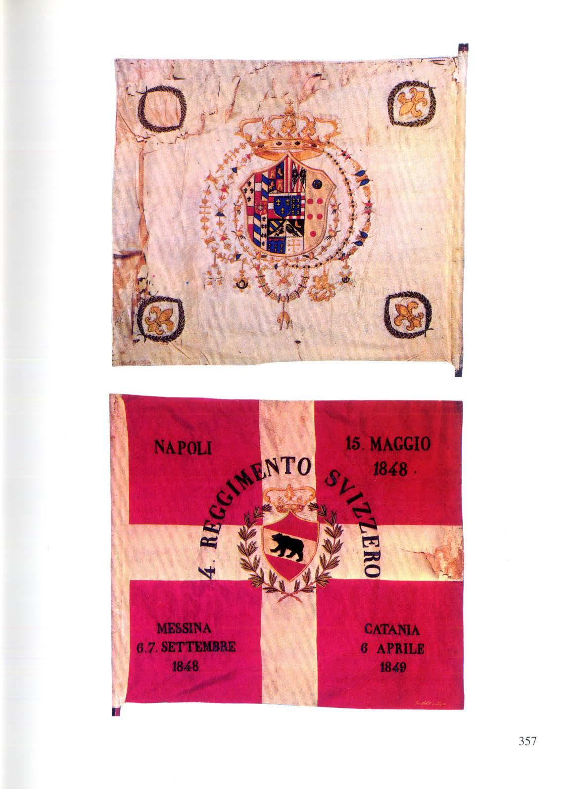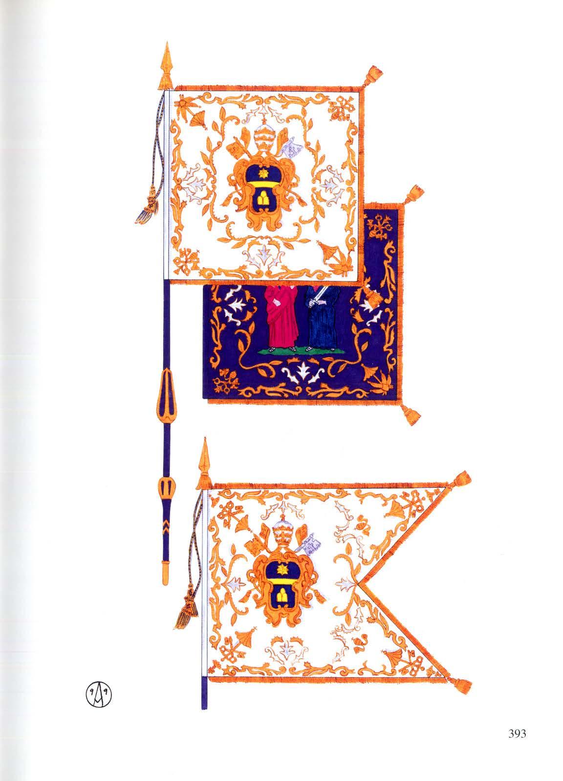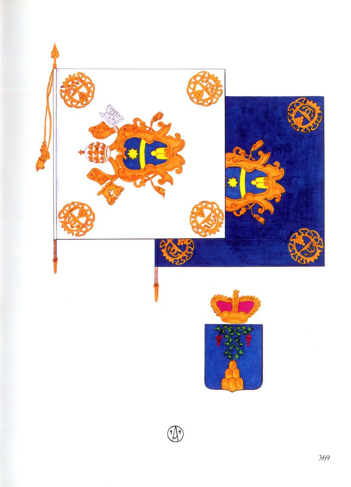 Oltre a queste più importanti, ve ne sono altre, molte delle quali recano - siamo in un paese catto li co - l'effigie della Madonna o dei Santi, come le bandiere pontificie , toscane, parmensi o genovesi Oltre a questi s imb oli riconducib ili alla religione o a ll o stato - ma, ri cordiamolo, nel vol ume appaiono solo le bandiere di reparti militari, non bandiere nazionali - compaiono poi, ricamate e dipinte, le armi delle a ltre dinastie, quelle dei pontefici regnanti, quelle dei «proprietari» dei reggimenti oppure, come già accennato, quelle delle province di reclu t amento: tutte in sieme costituiscono una sorta di enciclopedia su seta, o più sempliceme nte su stoffa, che ci viene offerta dall'impegnativo la voro del dott. Stefano Ales, c ui vanno i più se nt iti ringraziamenti dell 'Uff icio Storico per la bella opera prodotta.