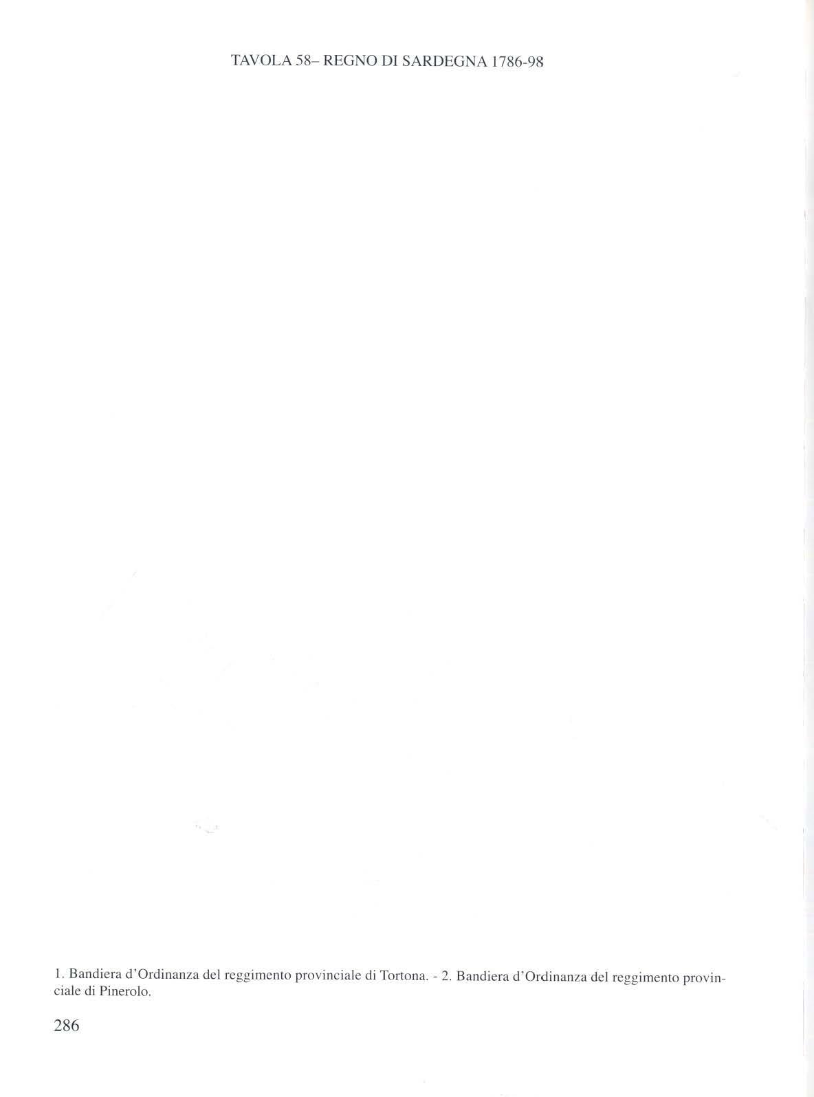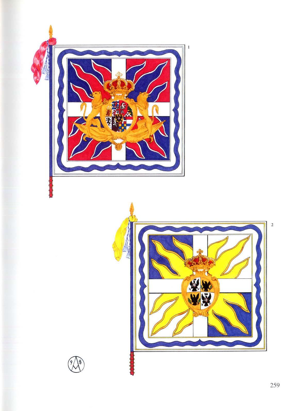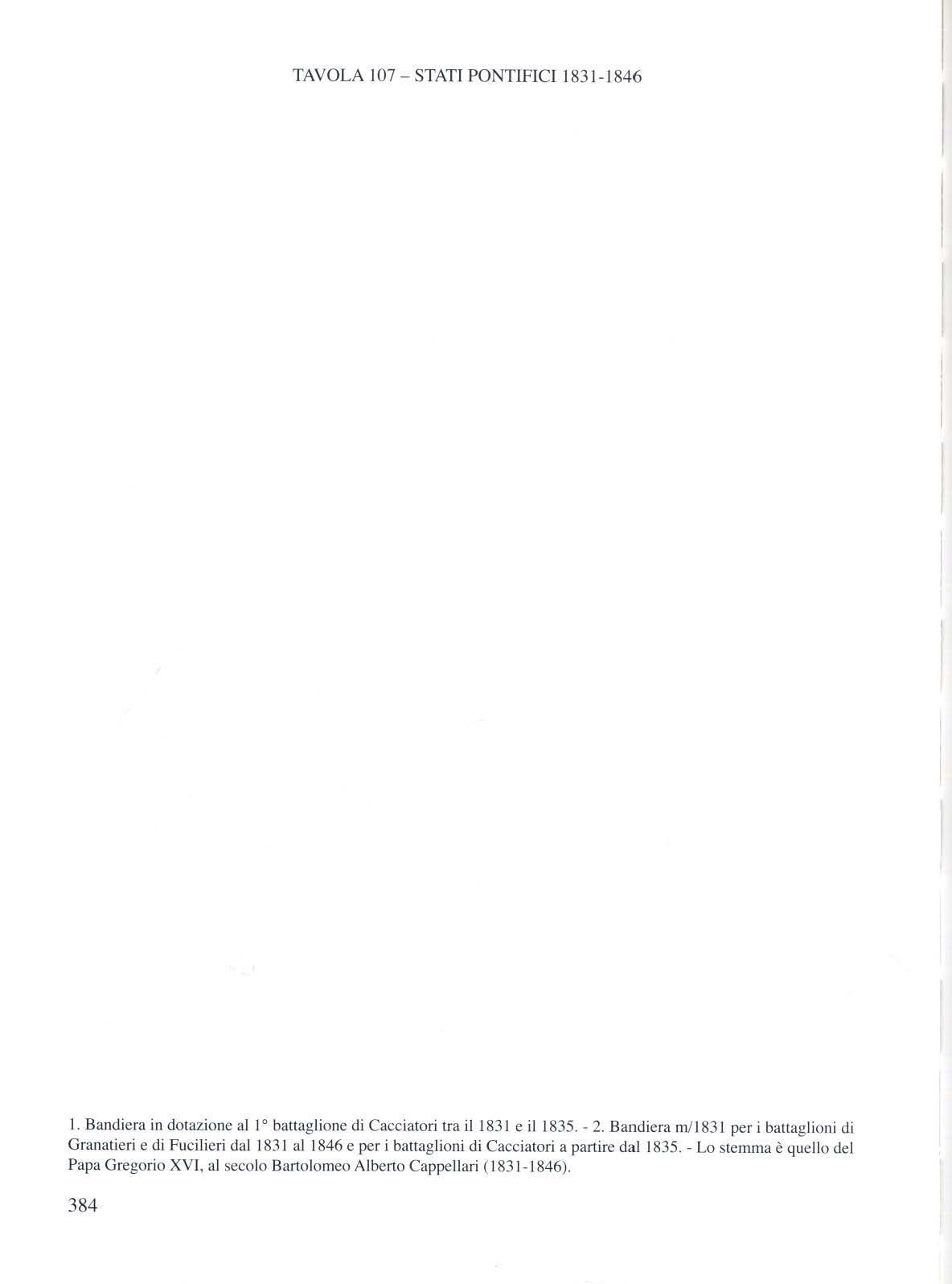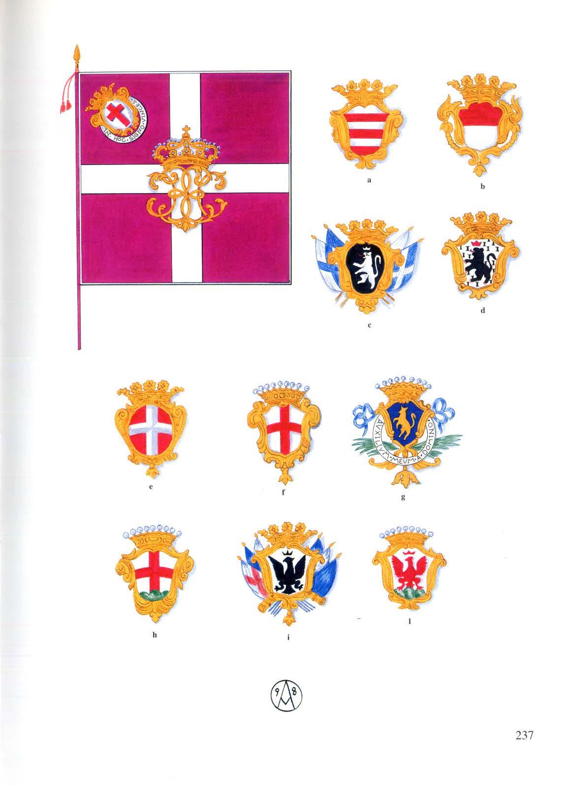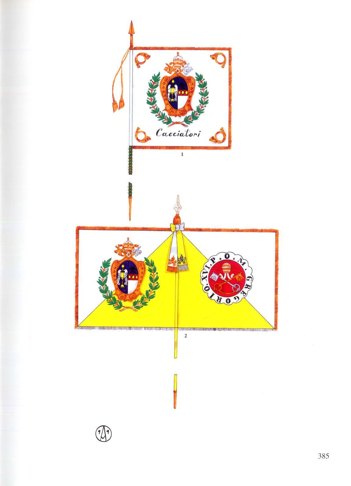 Oltre a queste più importanti, ve ne sono altre, molte delle quali recano - siamo in un paese catto li co - l'effigie della Madonna o dei Santi, come le bandiere pontificie , toscane, parmensi o genovesi Oltre a questi s imb oli riconducib ili alla religione o a ll o stato - ma, ri cordiamolo, nel vol ume appaiono solo le bandiere di reparti militari, non bandiere nazionali - compaiono poi, ricamate e dipinte, le armi delle a ltre dinastie, quelle dei pontefici regnanti, quelle dei «proprietari» dei reggimenti oppure, come già accennato, quelle delle province di reclu t amento: tutte in sieme costituiscono una sorta di enciclopedia su seta, o più sempliceme nte su stoffa, che ci viene offerta dall'impegnativo la voro del dott. Stefano Ales, c ui vanno i più se nt iti ringraziamenti dell 'Uff icio Storico per la bella opera prodotta.