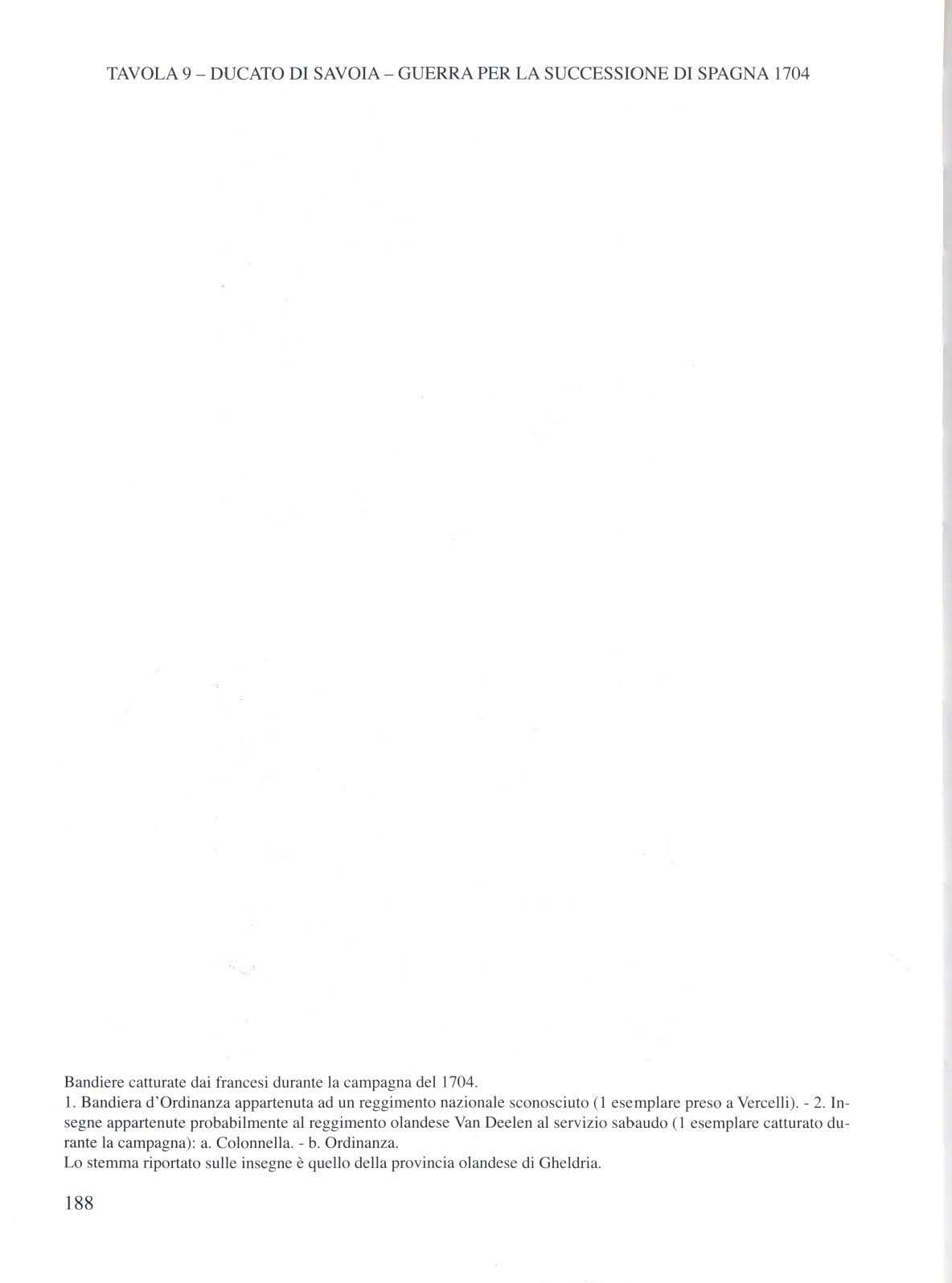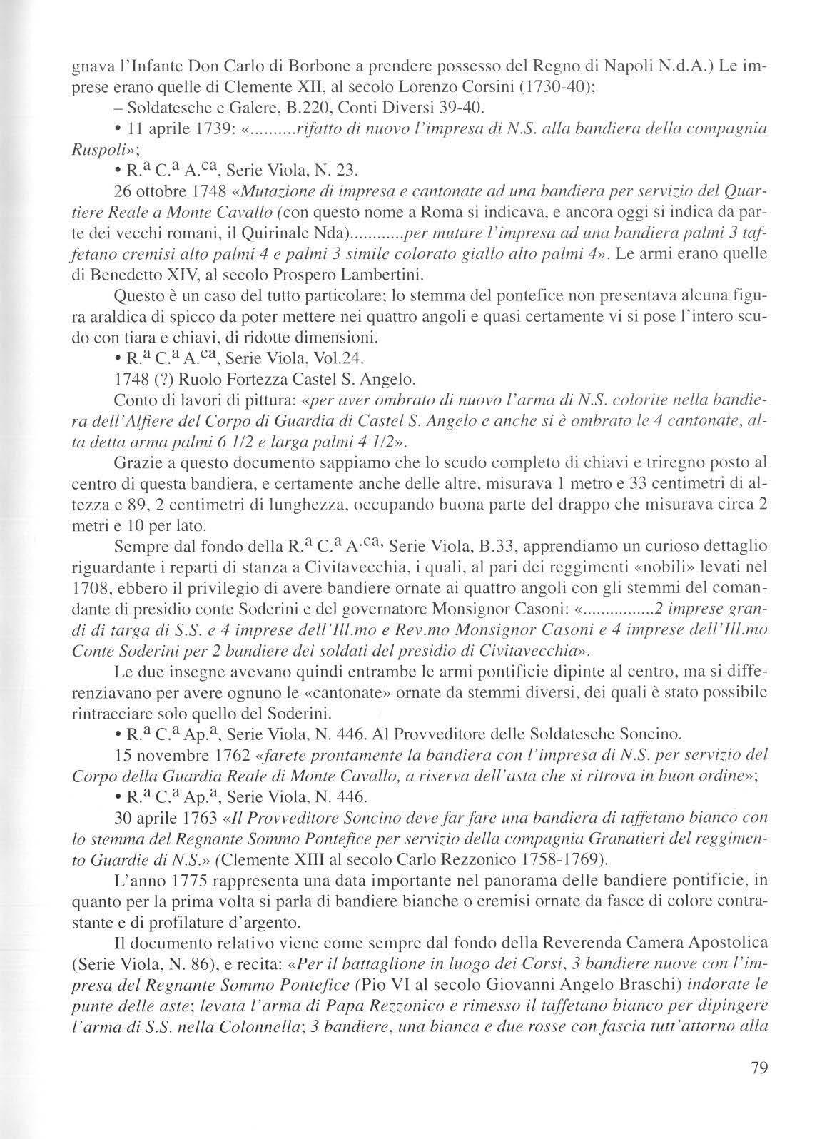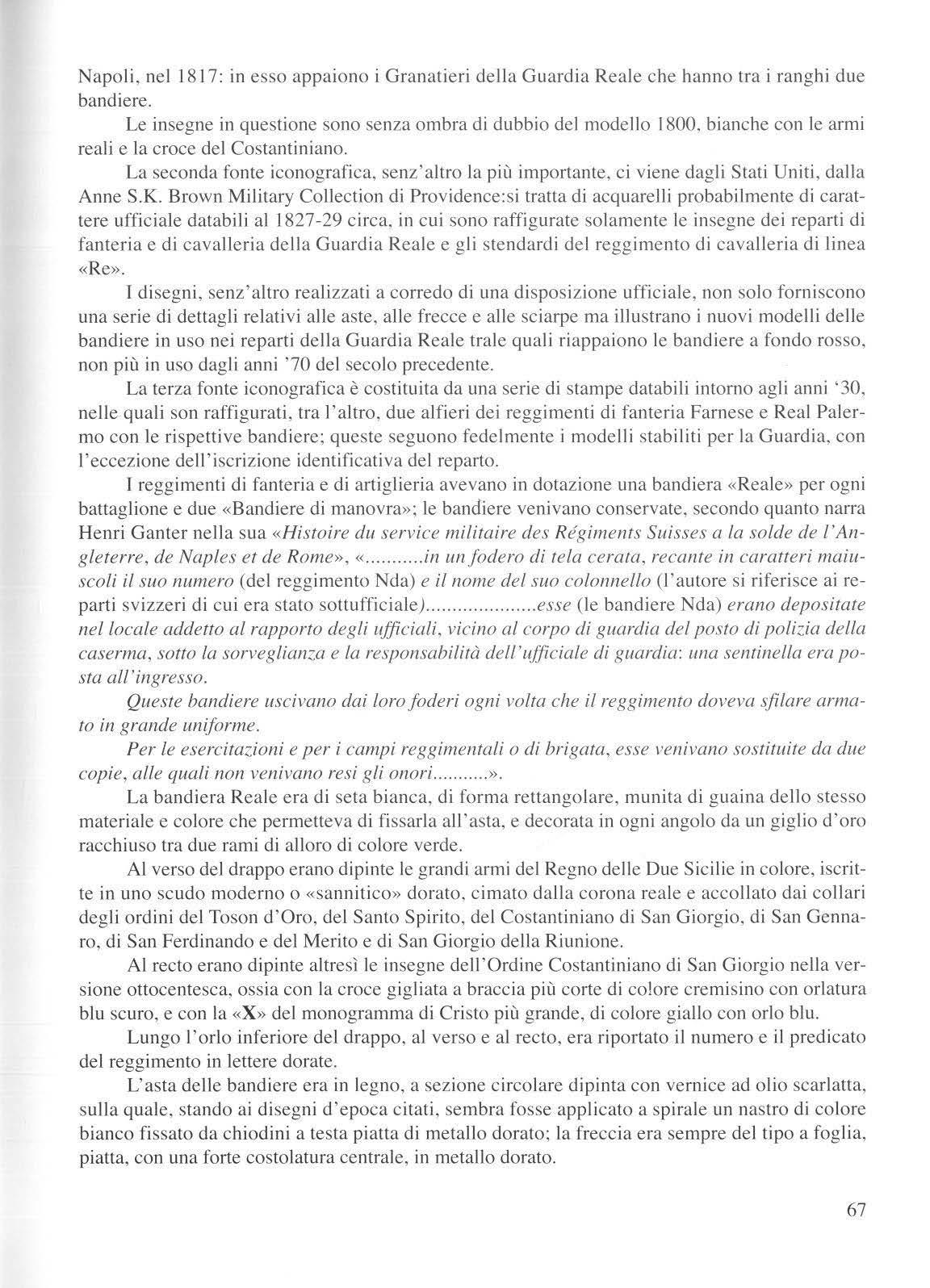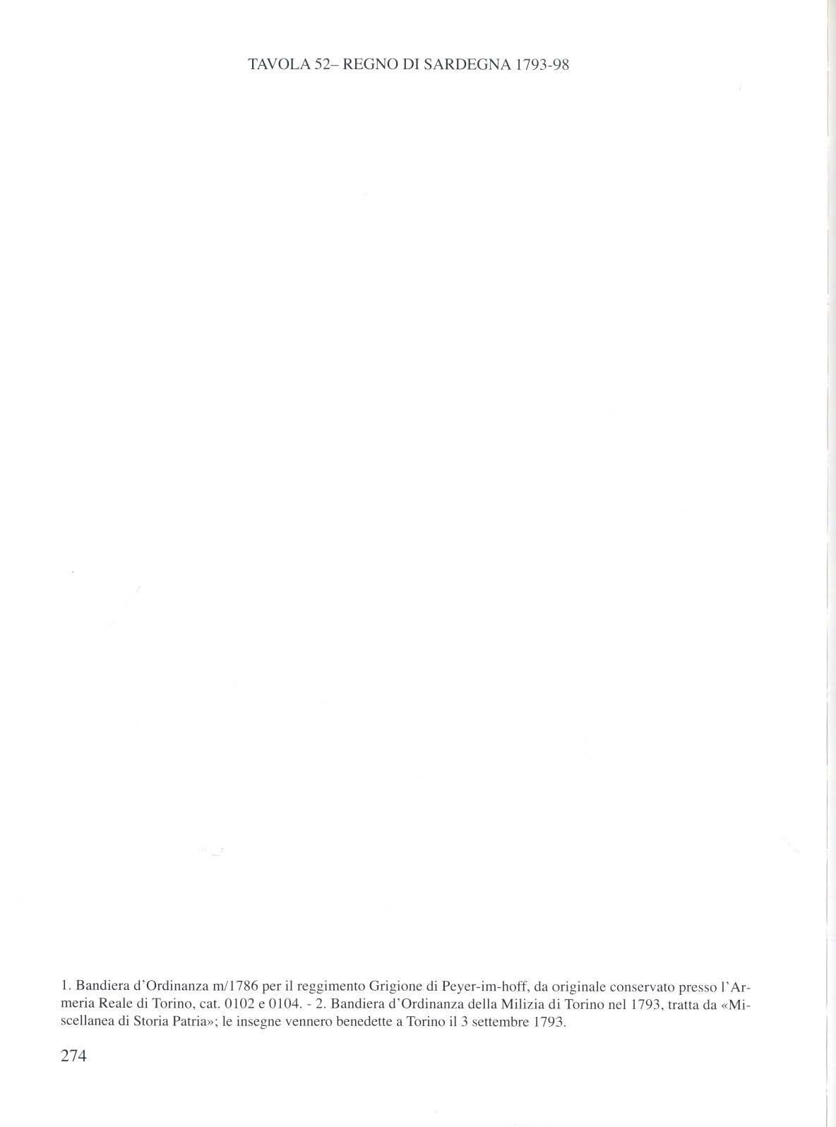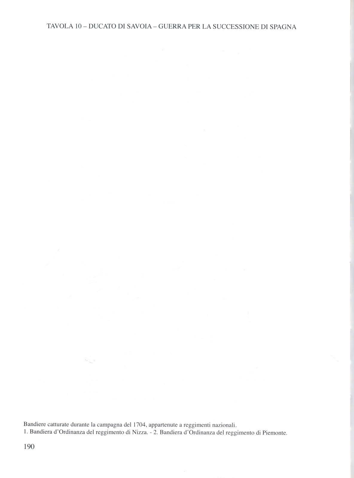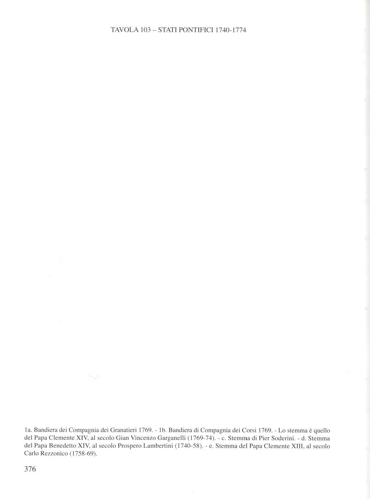 Oltre a queste più importanti, ve ne sono altre, molte delle quali recano - siamo in un paese catto li co - l'effigie della Madonna o dei Santi, come le bandiere pontificie , toscane, parmensi o genovesi Oltre a questi s imb oli riconducib ili alla religione o a ll o stato - ma, ri cordiamolo, nel vol ume appaiono solo le bandiere di reparti militari, non bandiere nazionali - compaiono poi, ricamate e dipinte, le armi delle a ltre dinastie, quelle dei pontefici regnanti, quelle dei «proprietari» dei reggimenti oppure, come già accennato, quelle delle province di reclu t amento: tutte in sieme costituiscono una sorta di enciclopedia su seta, o più sempliceme nte su stoffa, che ci viene offerta dall'impegnativo la voro del dott. Stefano Ales, c ui vanno i più se nt iti ringraziamenti dell 'Uff icio Storico per la bella opera prodotta.