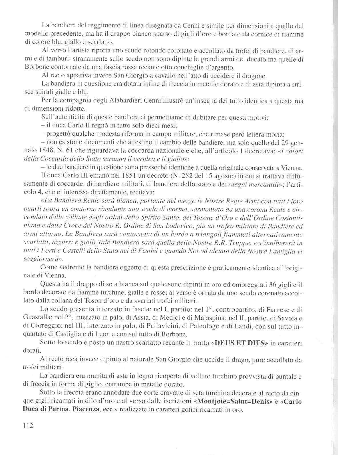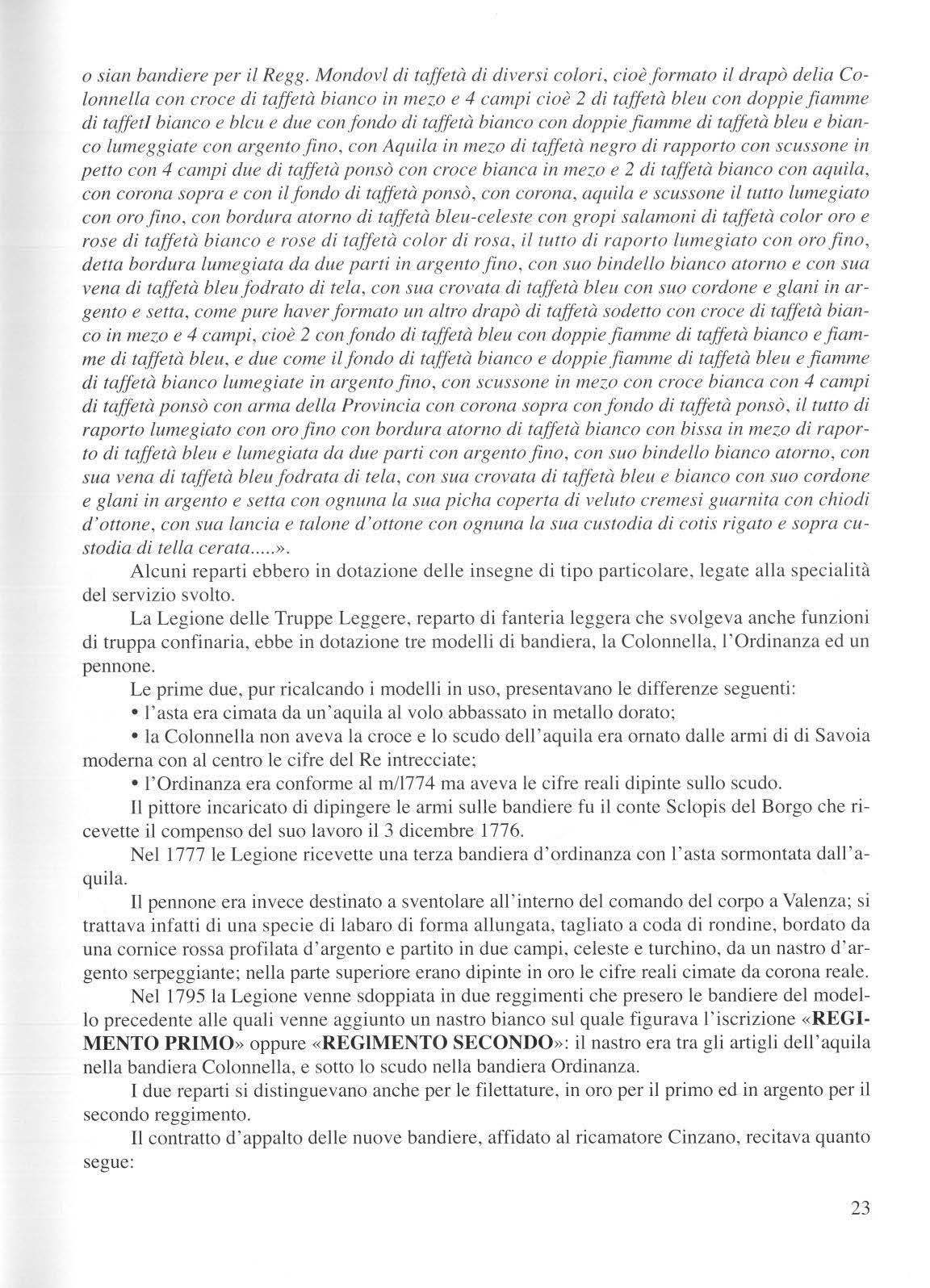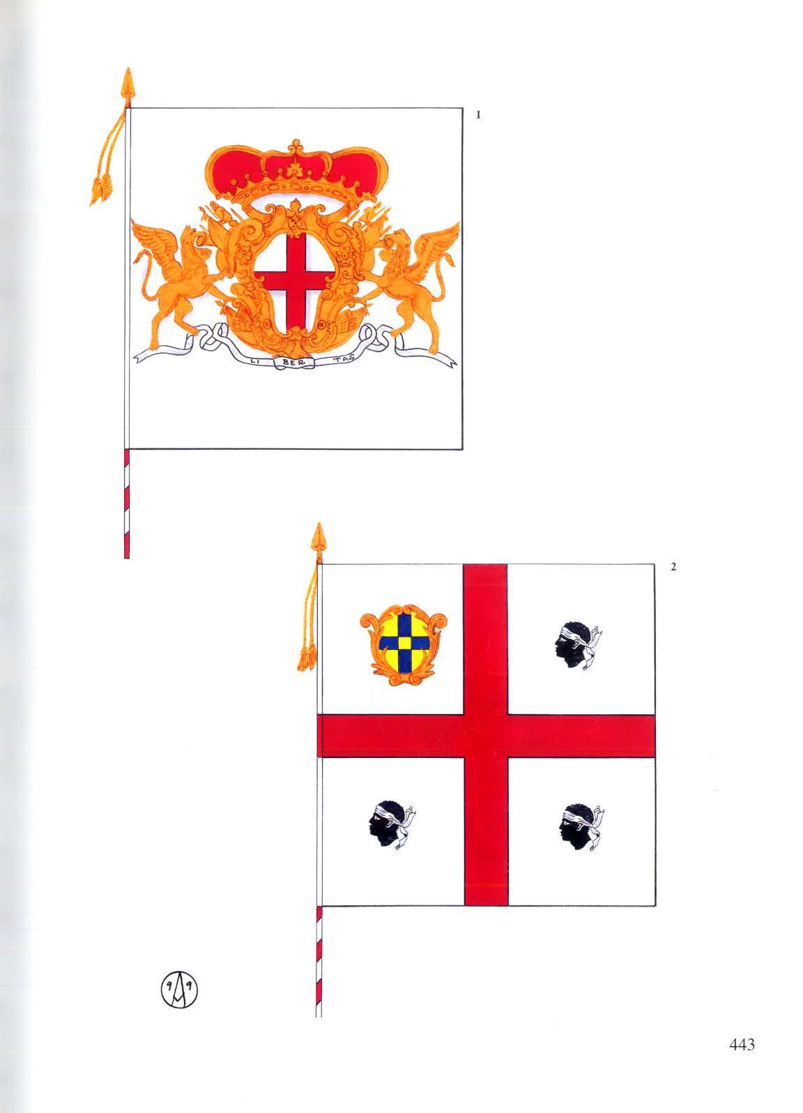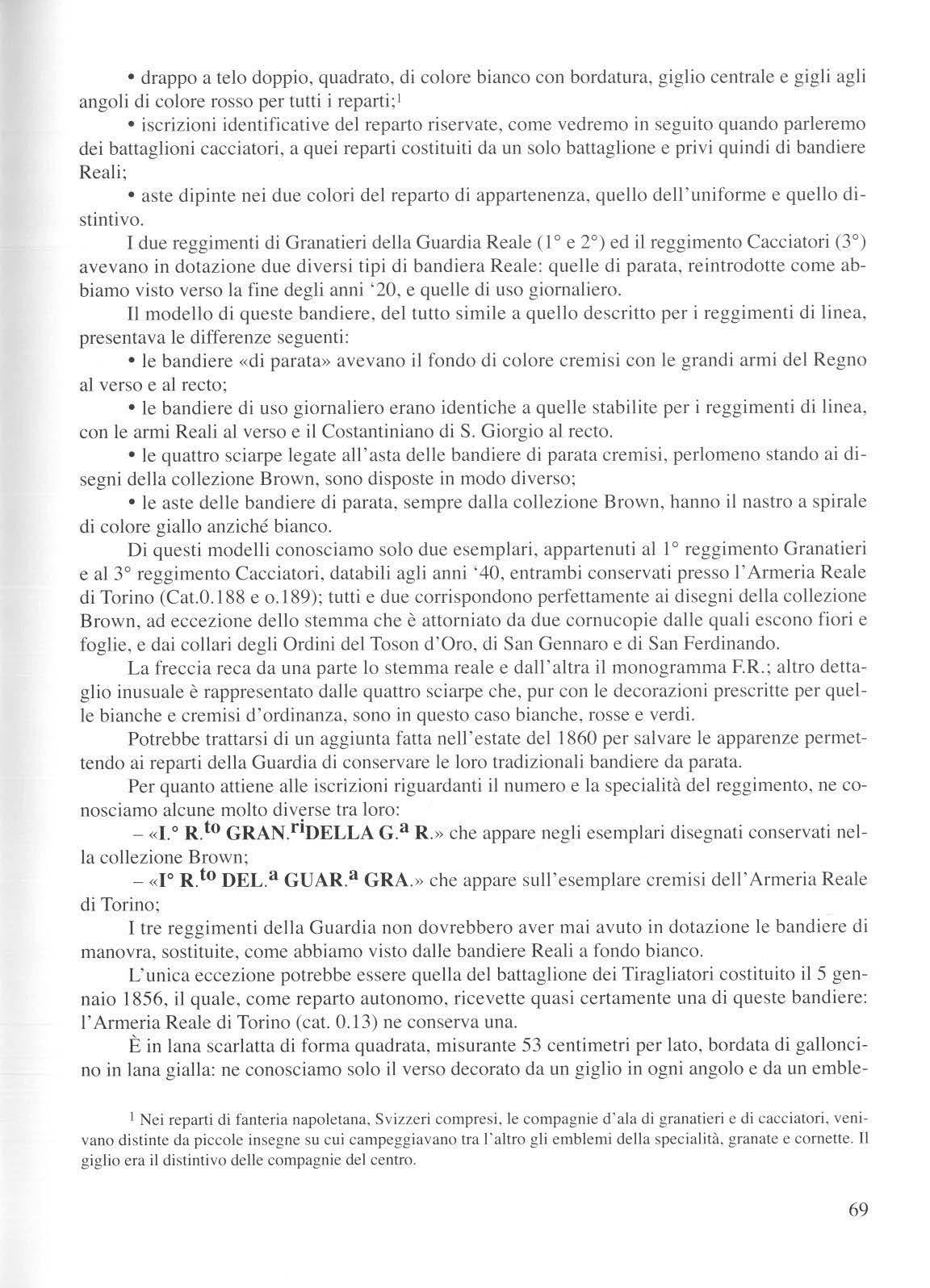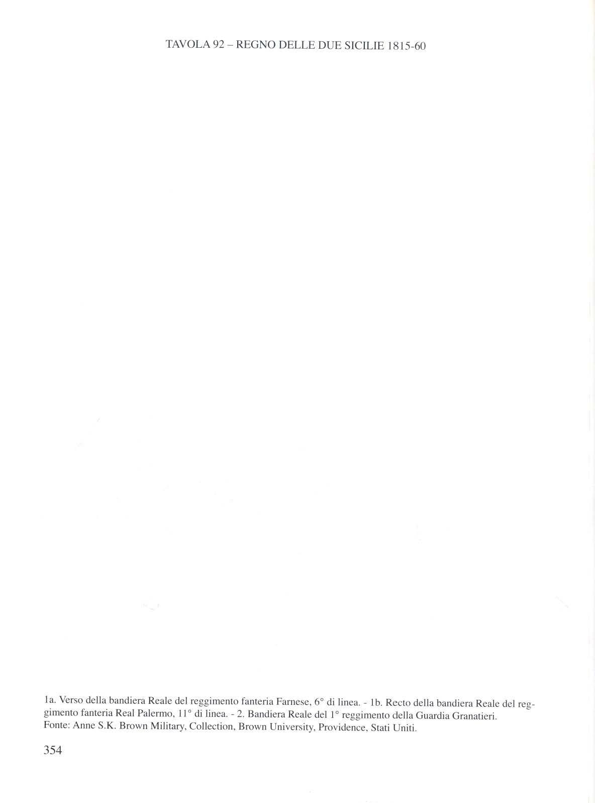 Oltre a queste più importanti, ve ne sono altre, molte delle quali recano - siamo in un paese catto li co - l'effigie della Madonna o dei Santi, come le bandiere pontificie , toscane, parmensi o genovesi Oltre a questi s imb oli riconducib ili alla religione o a ll o stato - ma, ri cordiamolo, nel vol ume appaiono solo le bandiere di reparti militari, non bandiere nazionali - compaiono poi, ricamate e dipinte, le armi delle a ltre dinastie, quelle dei pontefici regnanti, quelle dei «proprietari» dei reggimenti oppure, come già accennato, quelle delle province di reclu t amento: tutte in sieme costituiscono una sorta di enciclopedia su seta, o più sempliceme nte su stoffa, che ci viene offerta dall'impegnativo la voro del dott. Stefano Ales, c ui vanno i più se nt iti ringraziamenti dell 'Uff icio Storico per la bella opera prodotta.