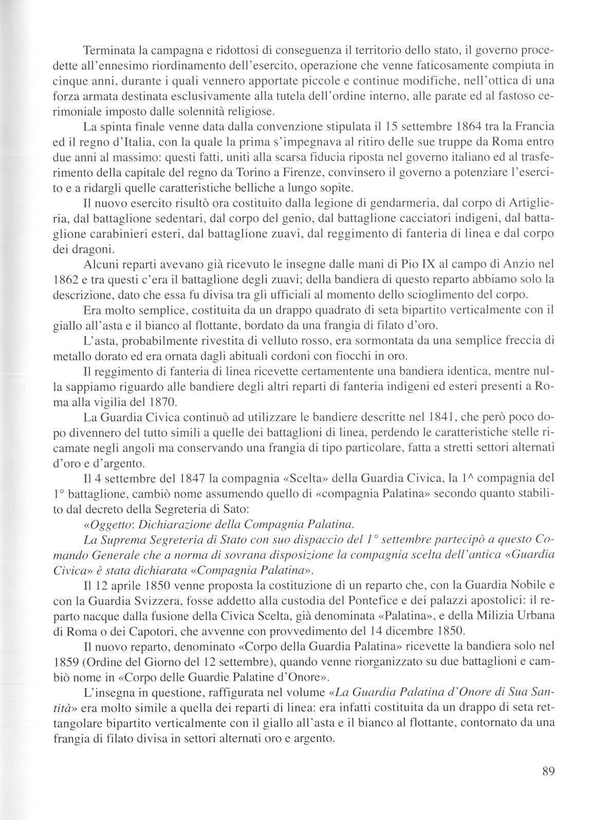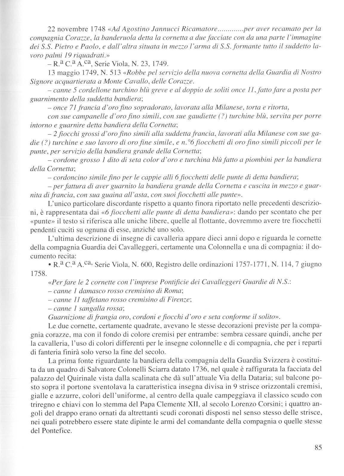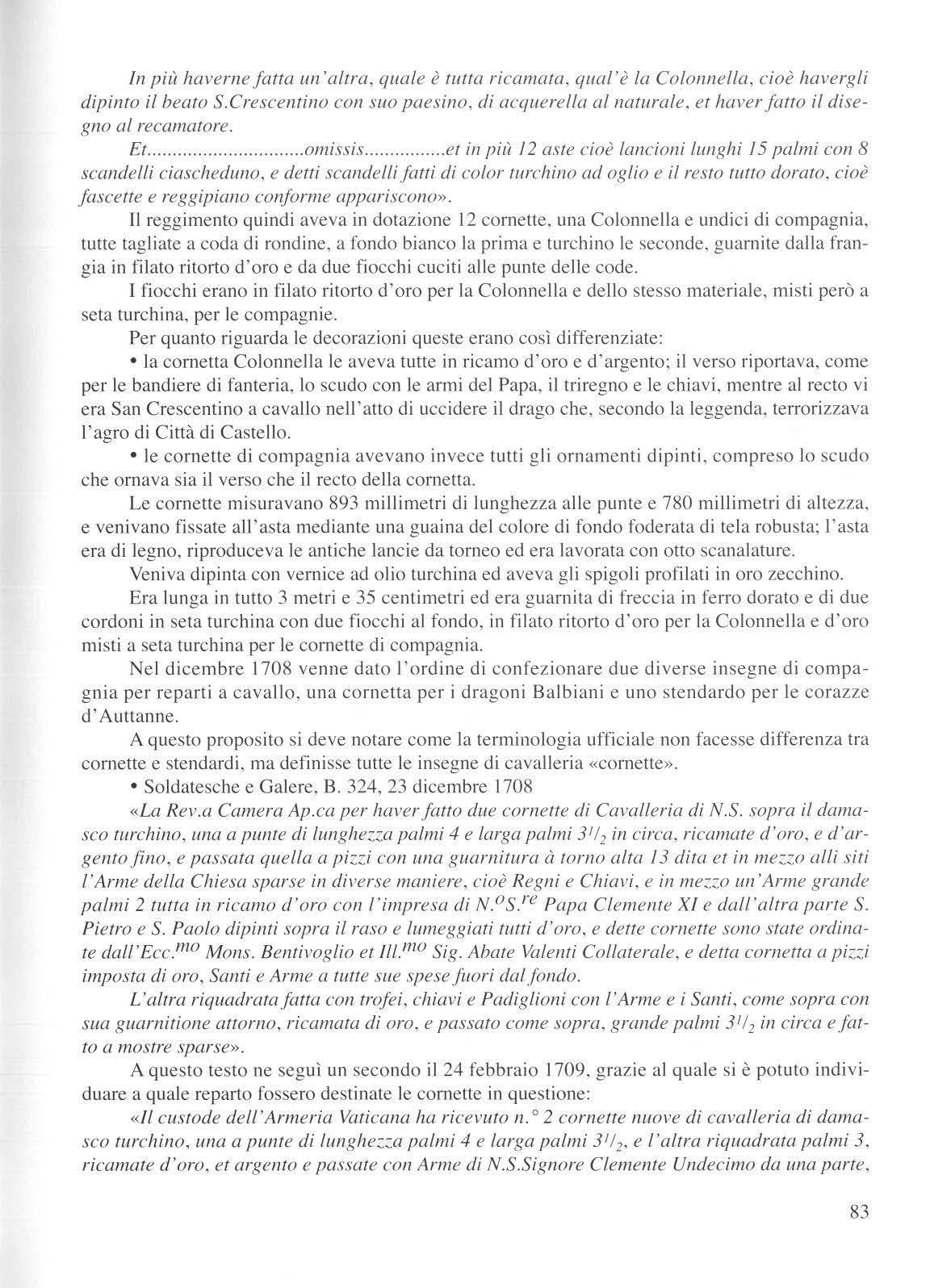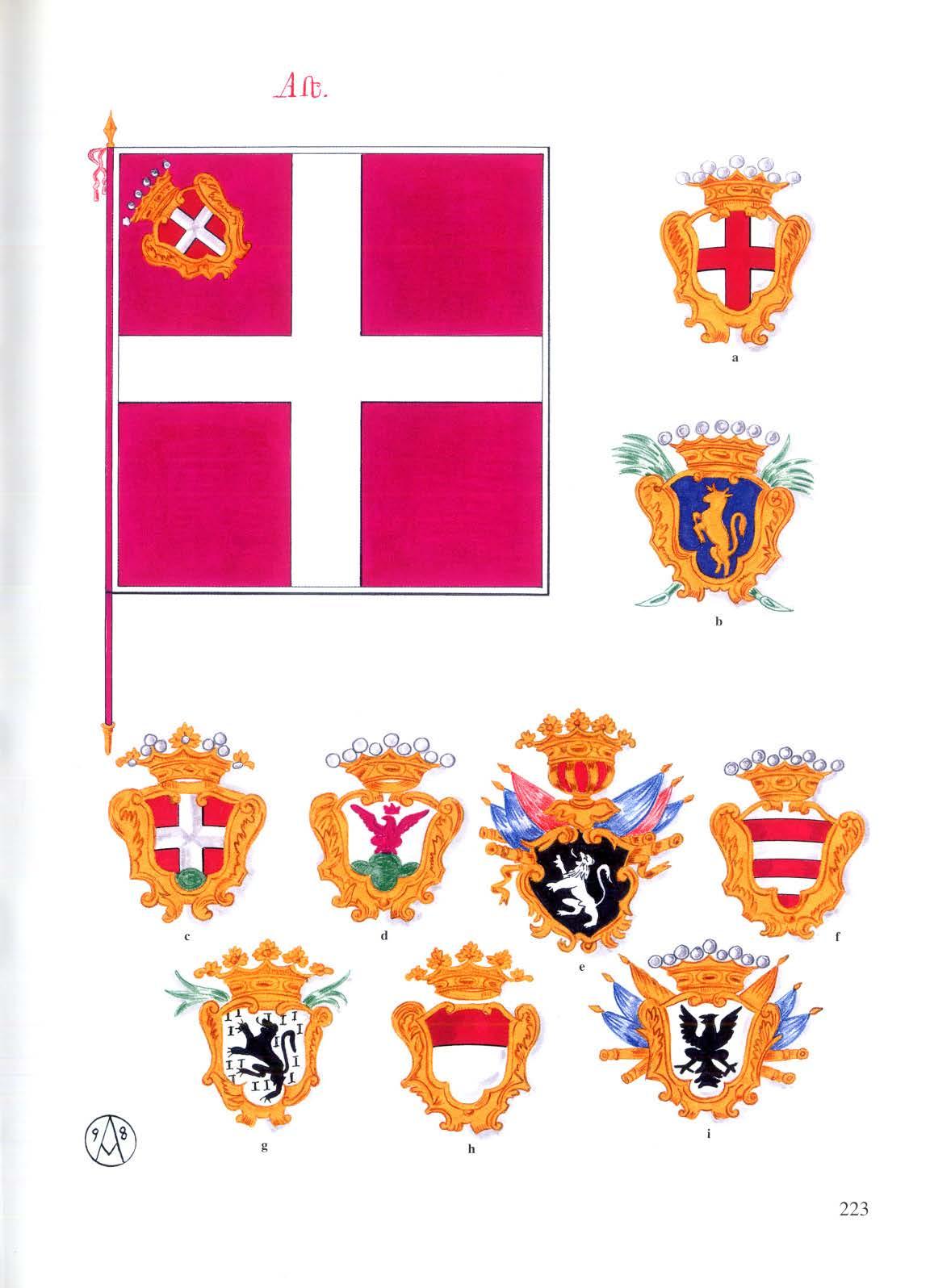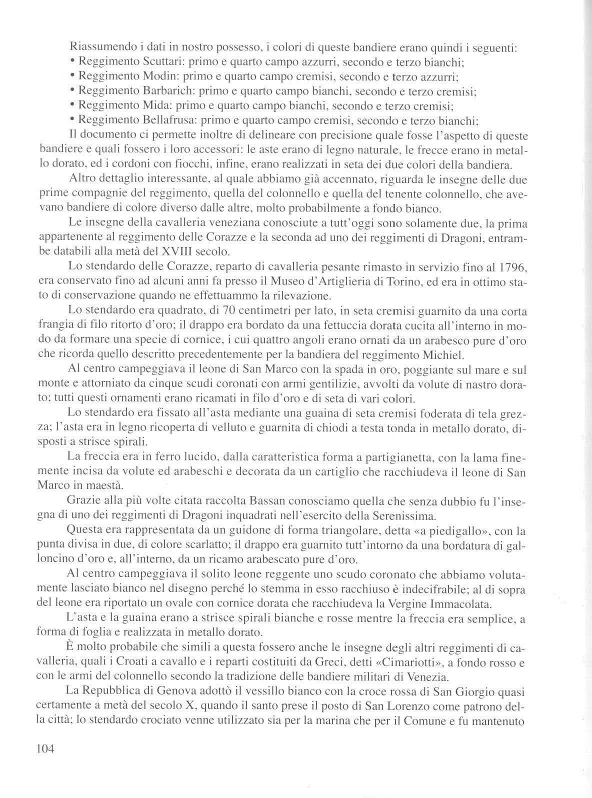 Oltre a queste più importanti, ve ne sono altre, molte delle quali recano - siamo in un paese catto li co - l'effigie della Madonna o dei Santi, come le bandiere pontificie , toscane, parmensi o genovesi Oltre a questi s imb oli riconducib ili alla religione o a ll o stato - ma, ri cordiamolo, nel vol ume appaiono solo le bandiere di reparti militari, non bandiere nazionali - compaiono poi, ricamate e dipinte, le armi delle a ltre dinastie, quelle dei pontefici regnanti, quelle dei «proprietari» dei reggimenti oppure, come già accennato, quelle delle province di reclu t amento: tutte in sieme costituiscono una sorta di enciclopedia su seta, o più sempliceme nte su stoffa, che ci viene offerta dall'impegnativo la voro del dott. Stefano Ales, c ui vanno i più se nt iti ringraziamenti dell 'Uff icio Storico per la bella opera prodotta.