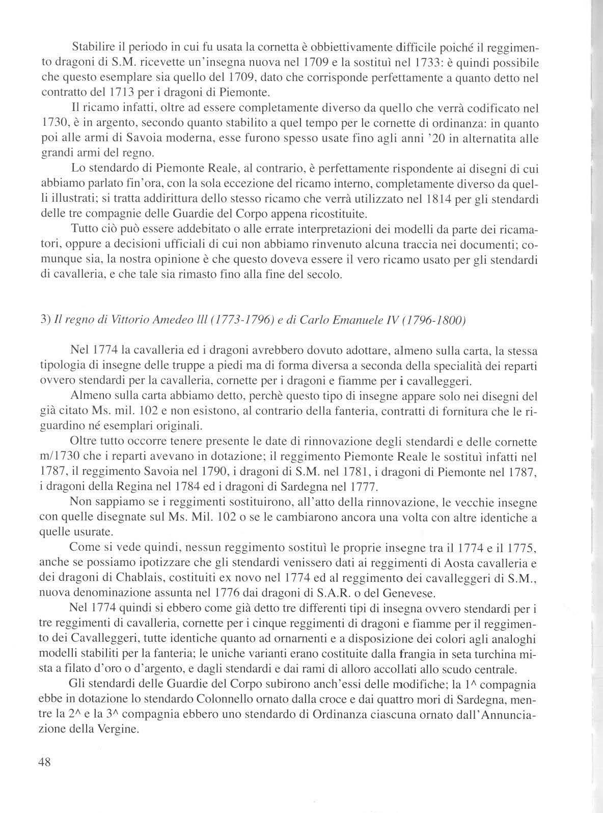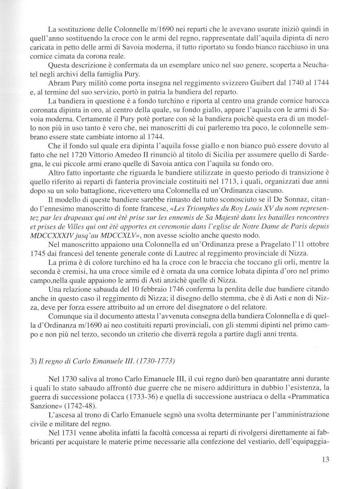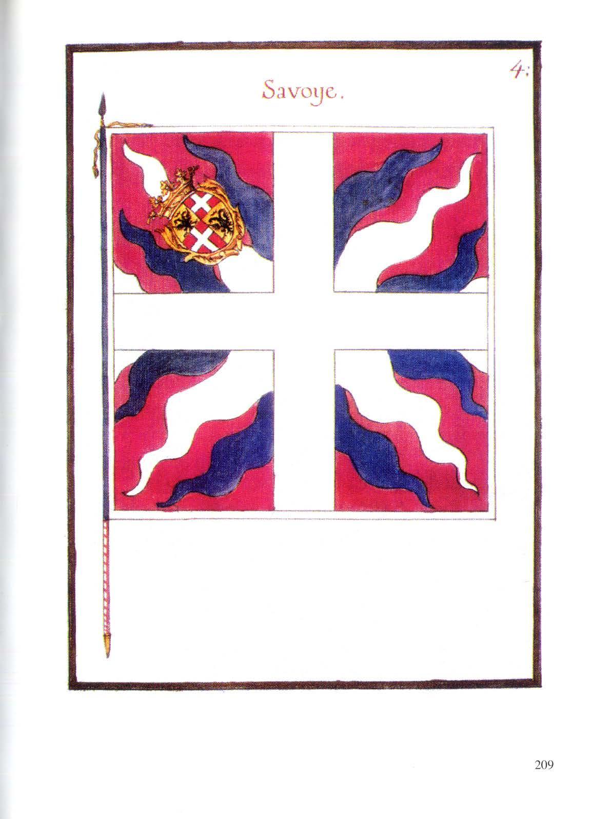 Durant e questo periodo appare il primo documento finora conosciuto sulle bandiere della fanteria sabauda, una dettagliata nota contabile necessaria al pagamento della bandiera Colonnella e delle due Ordinanze assegnate al reggimento delle Guardie, contenuta iffe1 volume «1673» del .X fondo « Patenti Controllo Finanze» custodito presso l'Archivio dj Stato di Torino, Sezione III".
