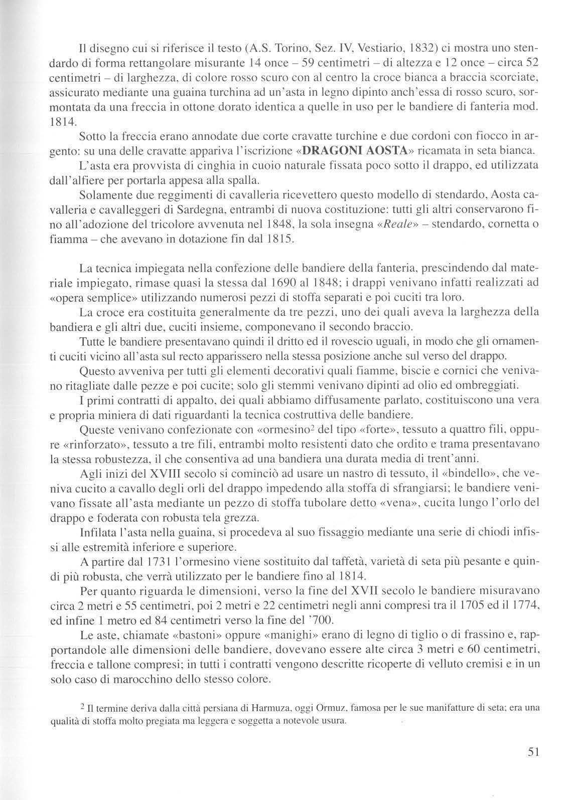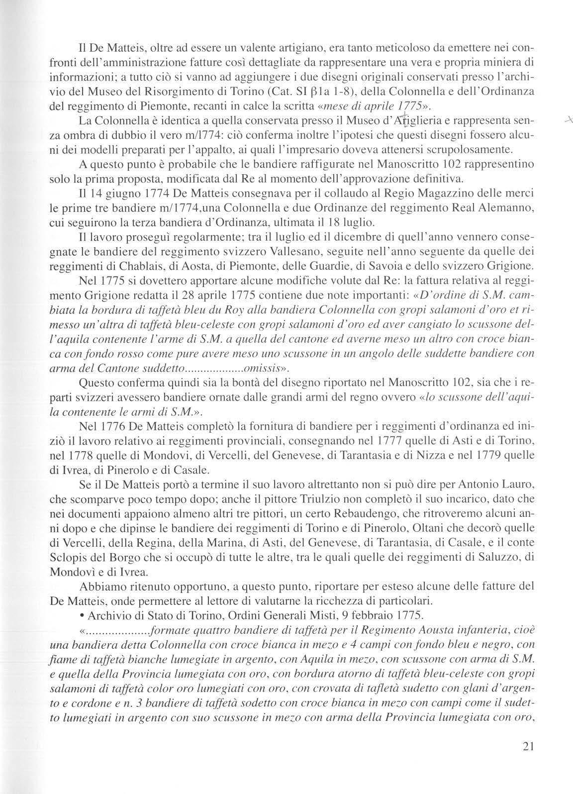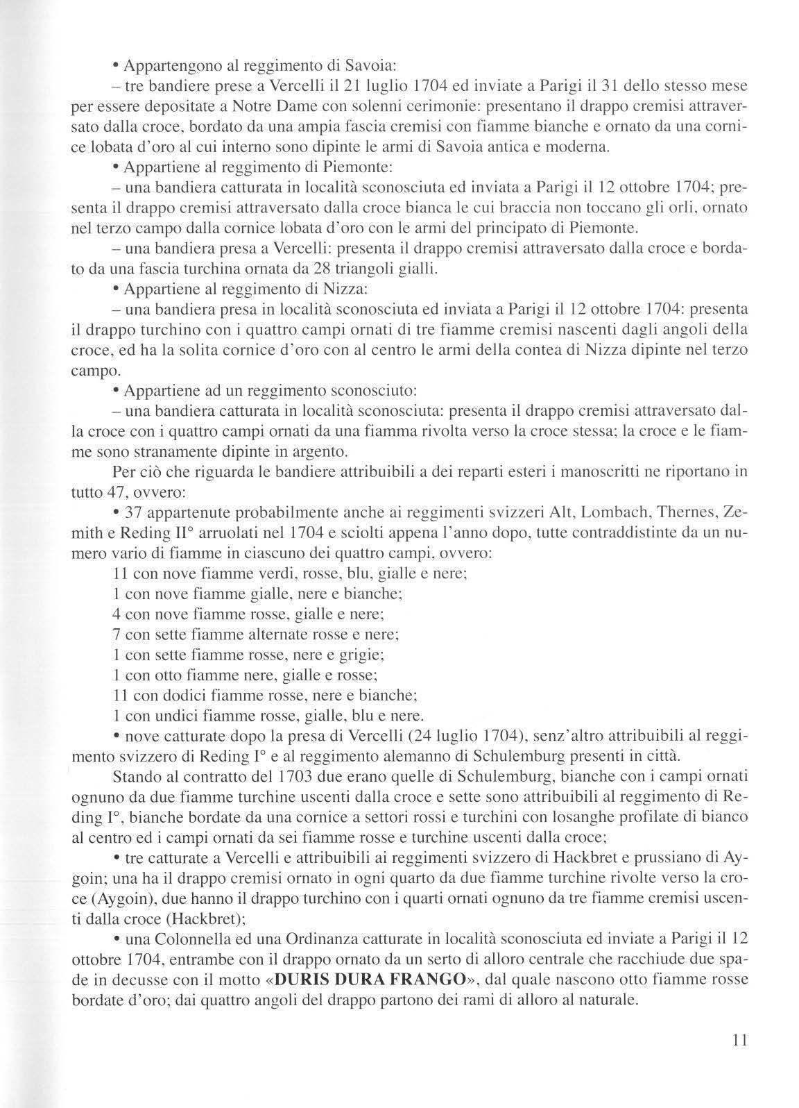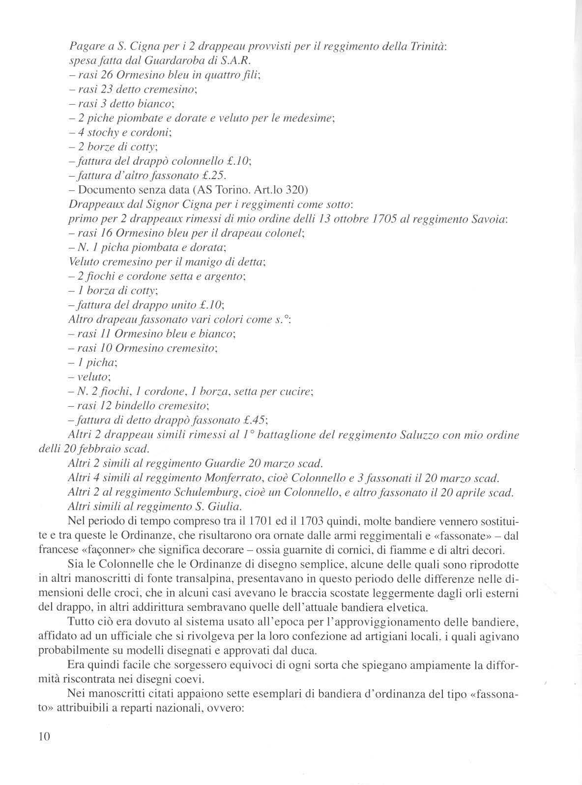 Il 25 maggio 170 I appare la prima di queste memorie firmata da Sigismondo Cigna, aiutante di campo del duca di Savoia , relativa alla fornitura di quattordici bandiere , sei delle quali destinate al reggimento delle Guardie e due a ciascuno dei reggimenti di Saluzzo, dei Fucilieri , di Monferrato e di Chiablese : per la loro confezione furono necessari «111 rasi di Ormesino bleu e bianco in quattroftliforte, 76 rasi di detto Ormesino cremesiforte, 113 rasi di detto bleu in tre fili rinforzato, 14 piche piombate con ponta dorata, 5 rasi di vellutto cremesi per li manighi , brache d'ottone,fiochi e cordoni oro e setta, 14 hor-::,e di cotty. Fattura di 5 drappò bleu cad. a i. IO, fattura di 9 jaswnati a f.60 cad. totale i.2049: 10. S. Cigna». A questo primo documento ne seguirono altri dello stesso tenore , che si riportano in dettaglio:
