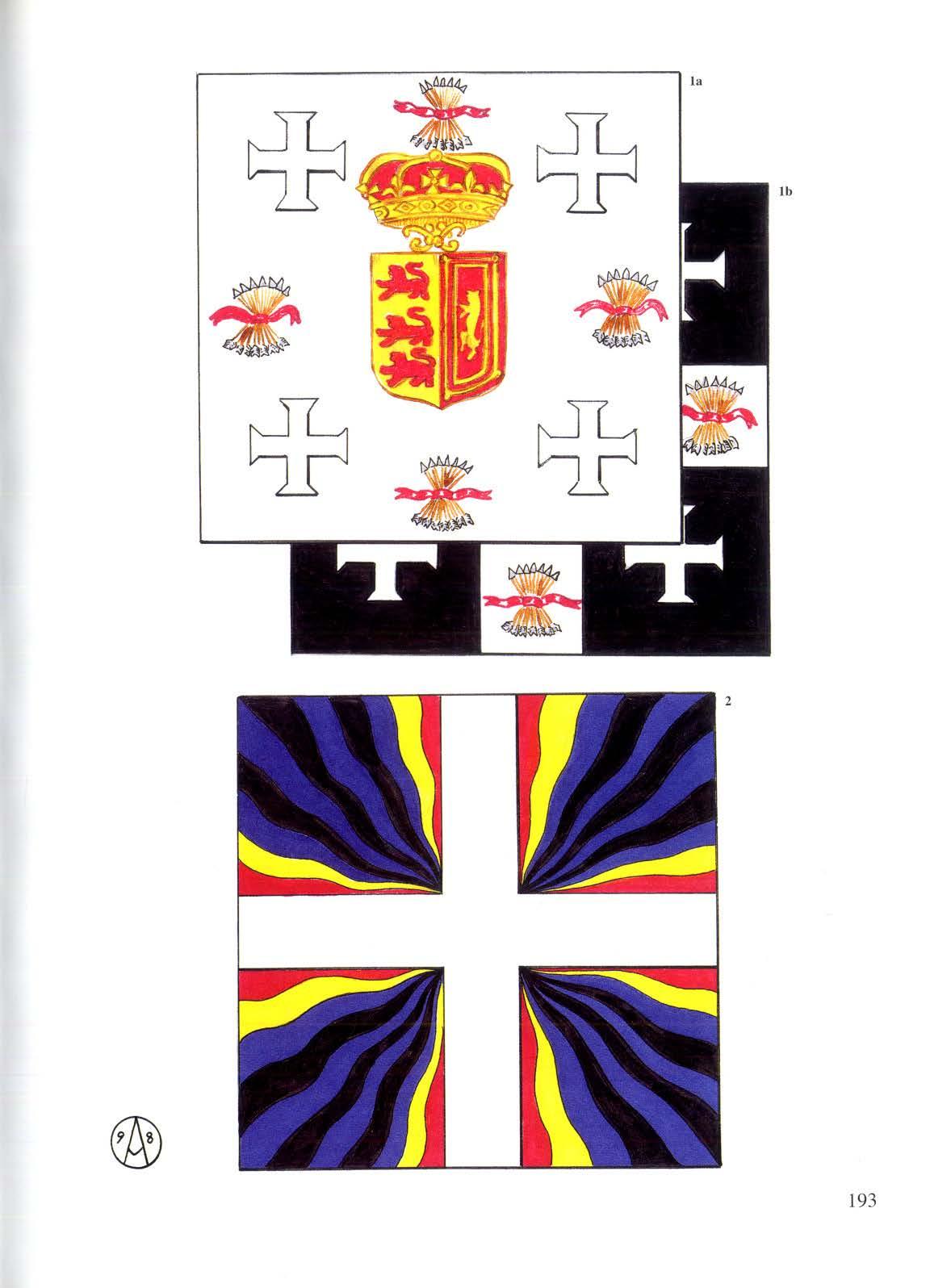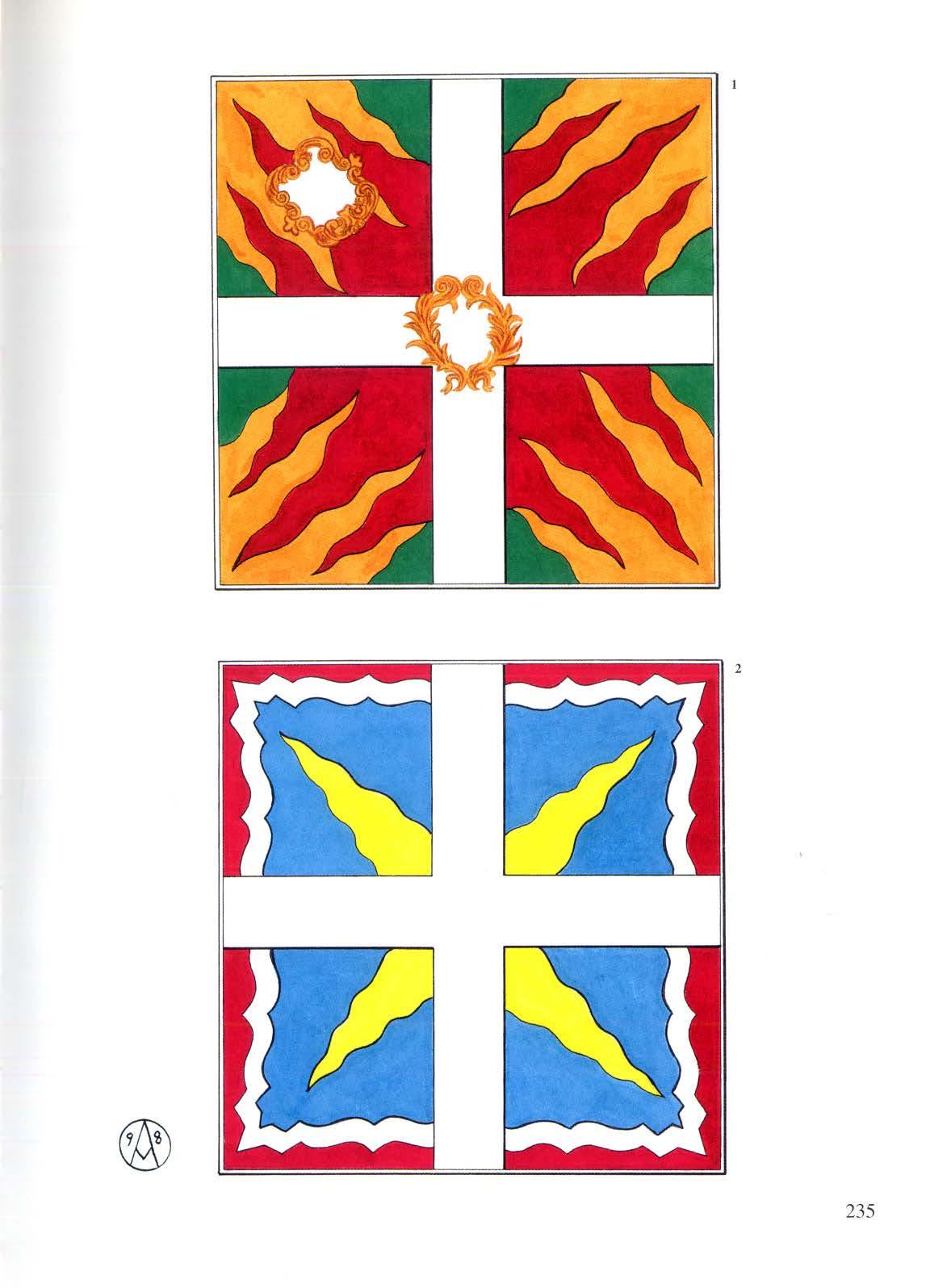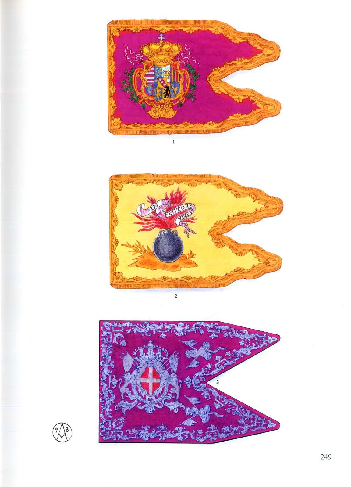 Le bandiere crociate a fondo turchino e c remi si appaiono d'altronde, pur se in bianco e nero, nel <<Regolamento Militare per il Servi::.io ed Evolu::.ioni di campagna», compilato tra il 1690 ed il 1693. In esso sono raffigurate due bandiere per ogni battaglione: il primo battaglione aveva la Colonnella ed un'Ordinanza, il secondo solamente due Ordinanze.