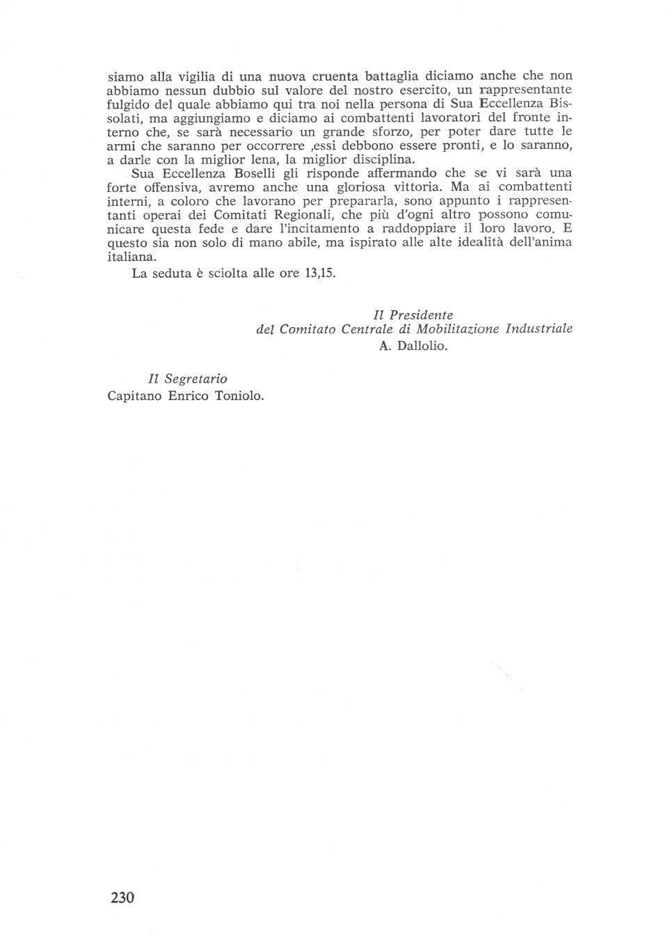 Il PRESIDENTE prega il Capitano Toniolo di leggere la sua relazione sul capo 4° del programa dei lavori e cioè sulla Mobilitazione Industriale, rimandando la discussione sul progetto all'indomani.