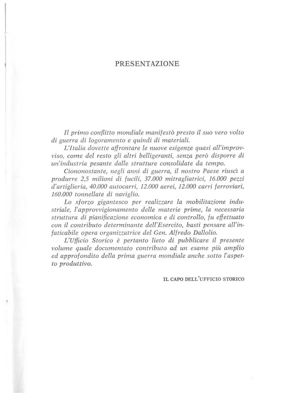 L'Ufficio Storico è pertanto lieto di pubblicare il presente volume quale documentato contributo ad un esame più amplio ed approfondito della prima guerra mondiale anche sotto l'aspetto produttivo.