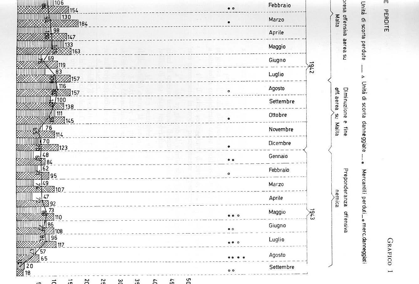 Il grafico n. 1 prospetta, mese per me se, l'intensità del traffico e l'entità delle perdite, sia di navi mercantili sia di unità di scorta .