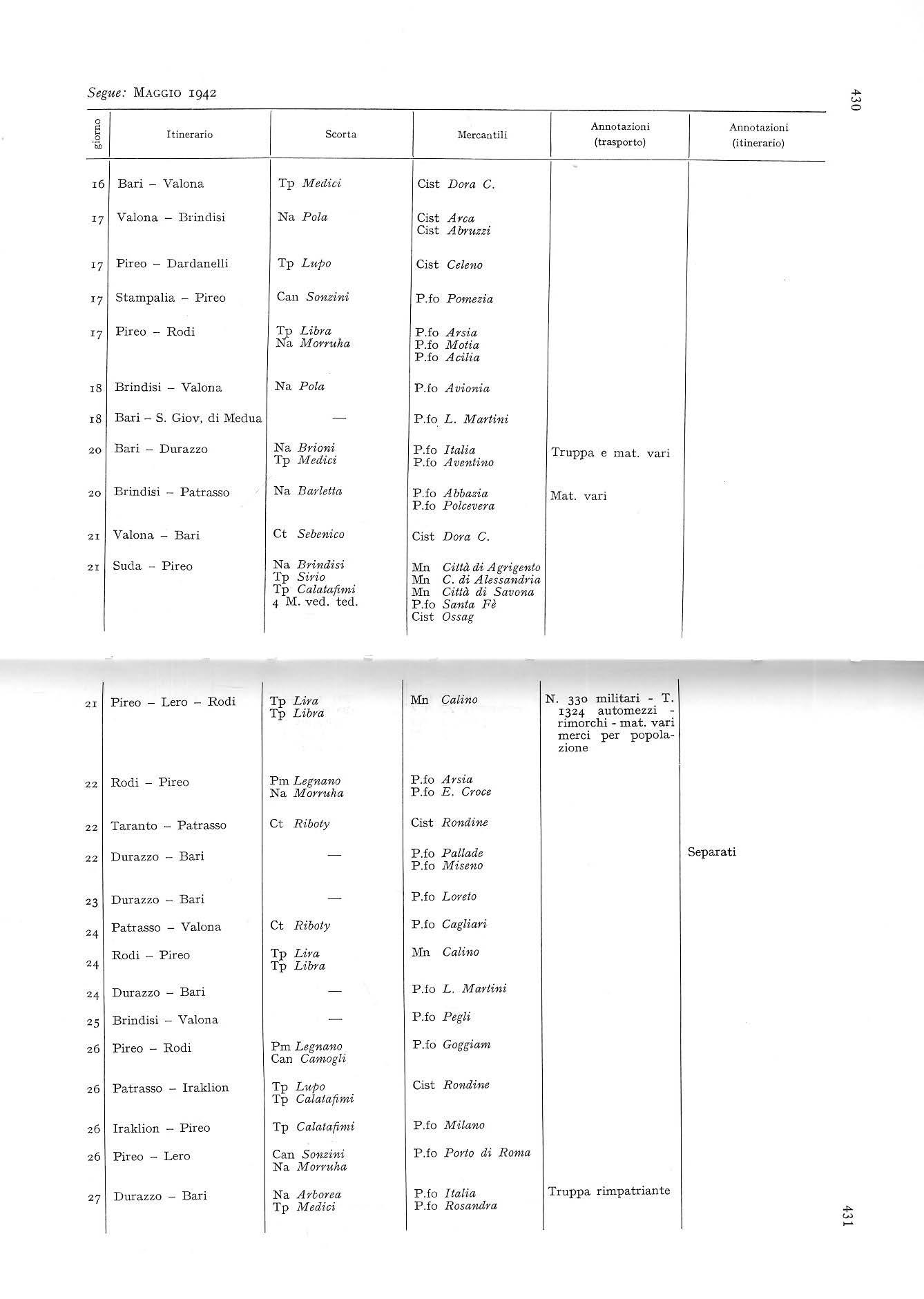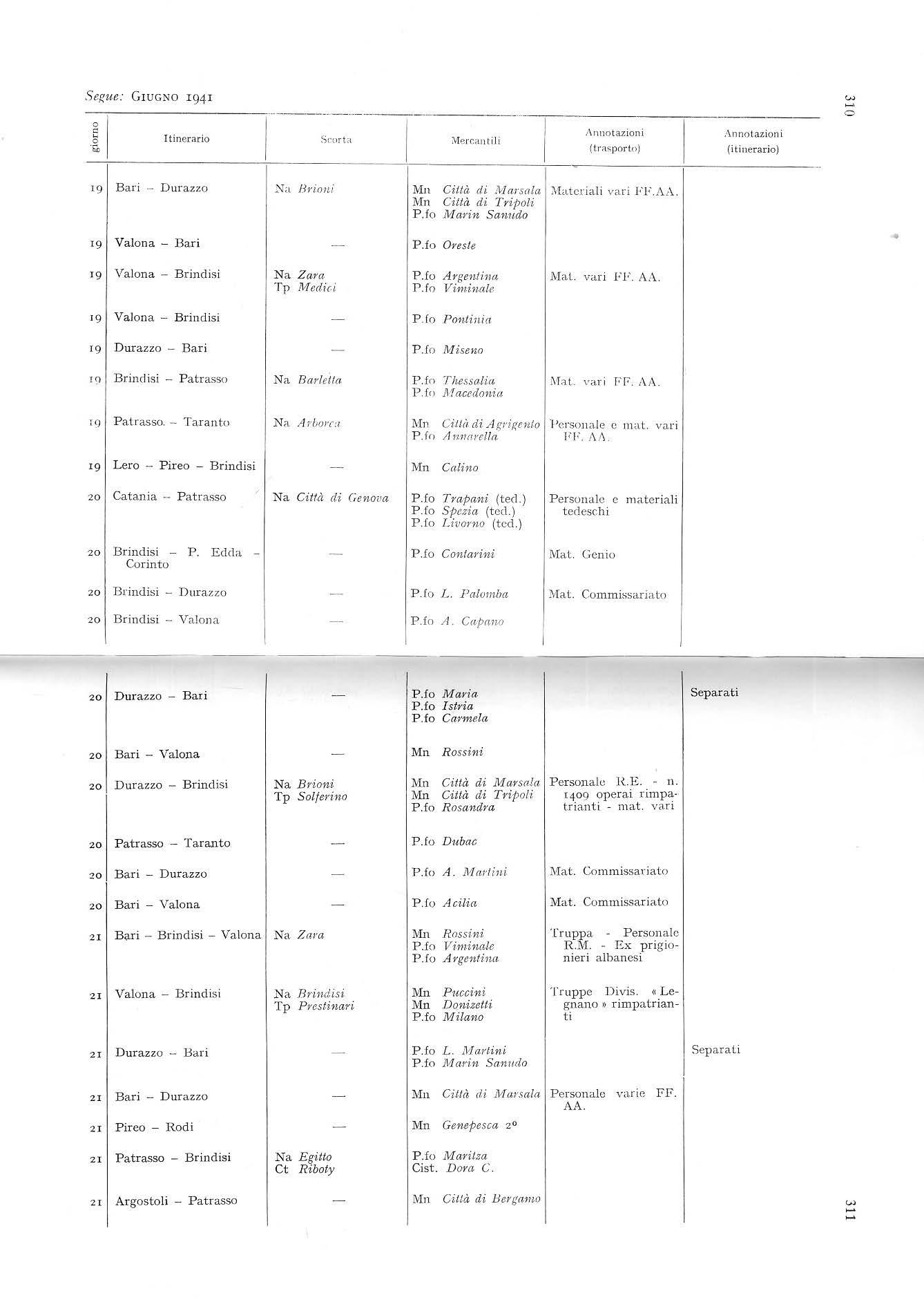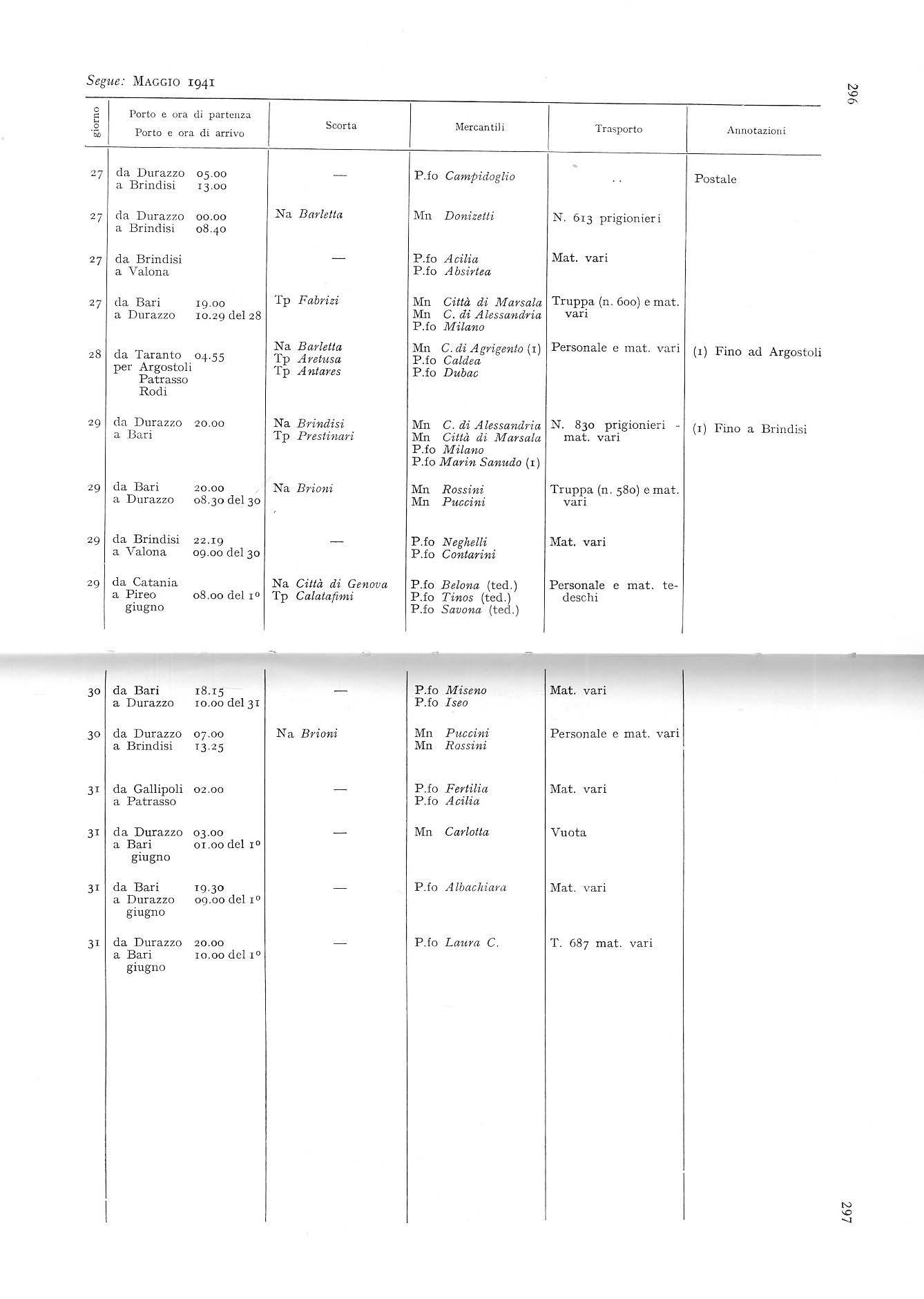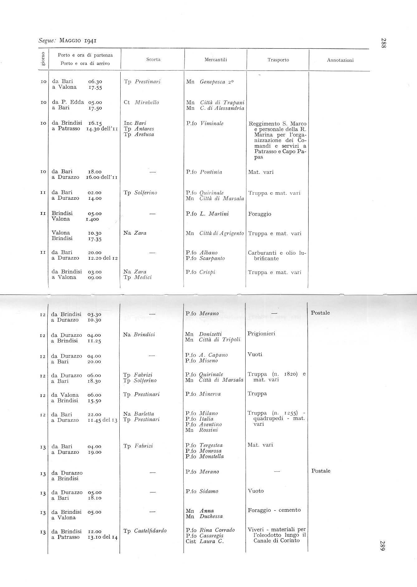 5. Specchio del traffico effettuato tra Italia ed Albania, Grecia ed Egeo dal 1° al 31 maggio 1941 ( omesso il traffico costiero relativo alla costa pugliese, a quella albanese e greca e nell'in tern o dei golfi di Patrasso e di Corinto, ad eccezione di alcuni importanti convogli scortati . Omesso alt r esì il traffico interno tra le Isole Italiane dell'Egeo)