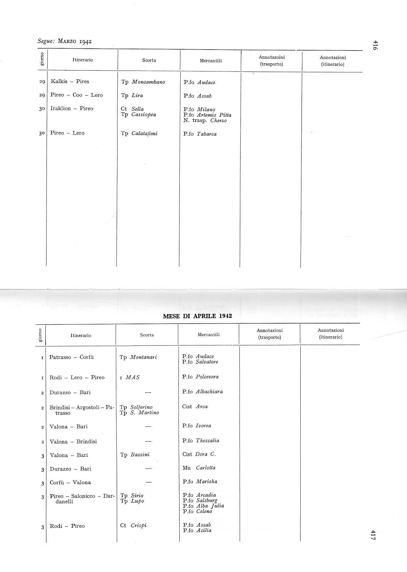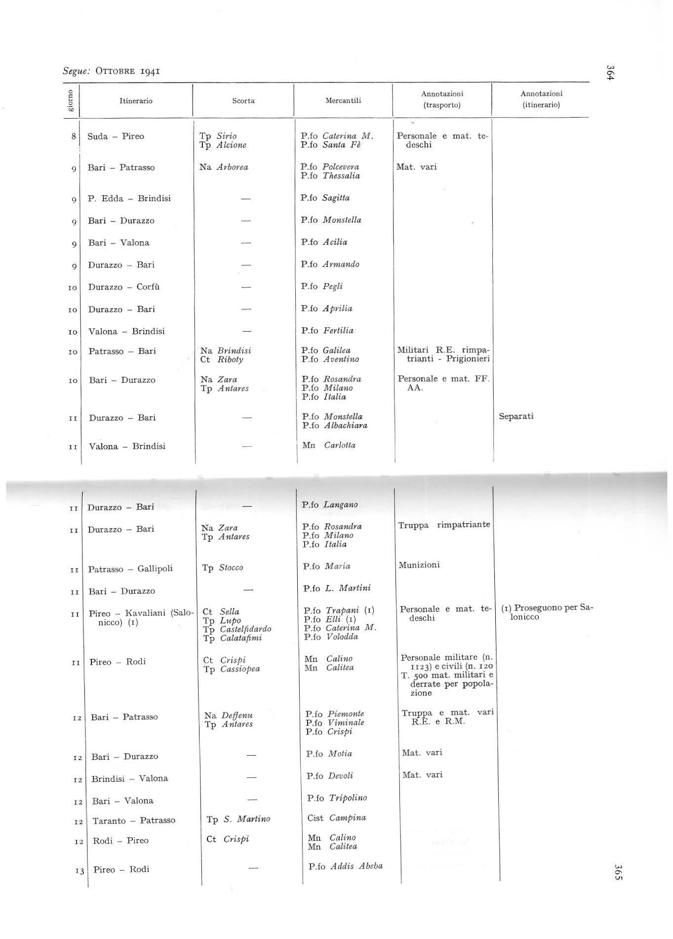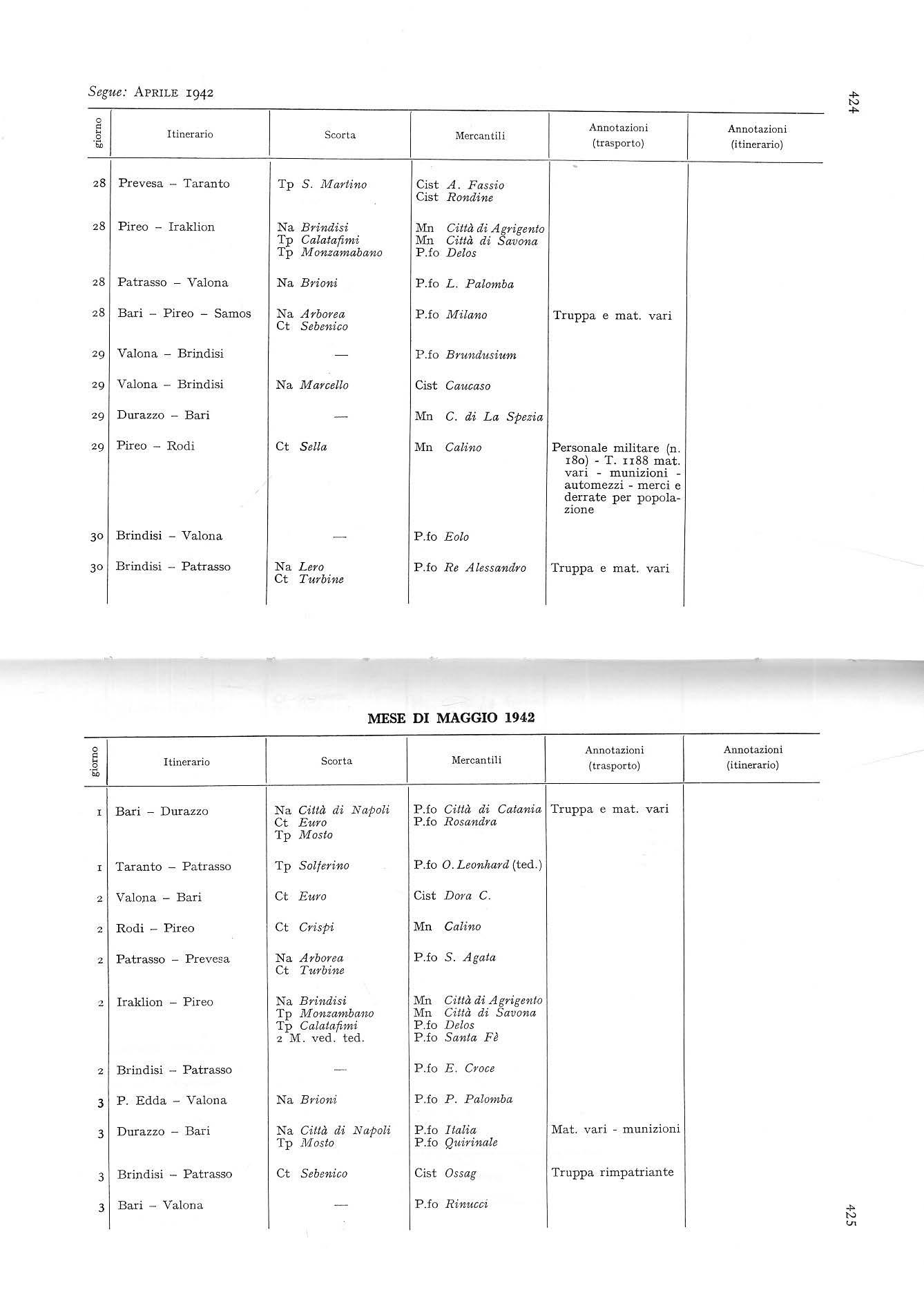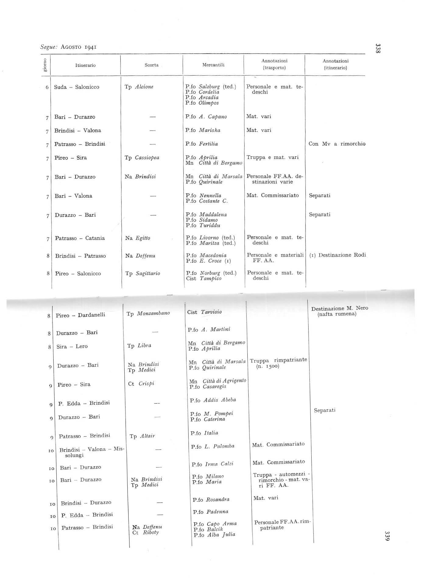 5. Specchio del traffico effettuato tra Italia ed Albania, Grecia ed Egeo dal 1° al 31 maggio 1941 ( omesso il traffico costiero relativo alla costa pugliese, a quella albanese e greca e nell'in tern o dei golfi di Patrasso e di Corinto, ad eccezione di alcuni importanti convogli scortati . Omesso alt r esì il traffico interno tra le Isole Italiane dell'Egeo)