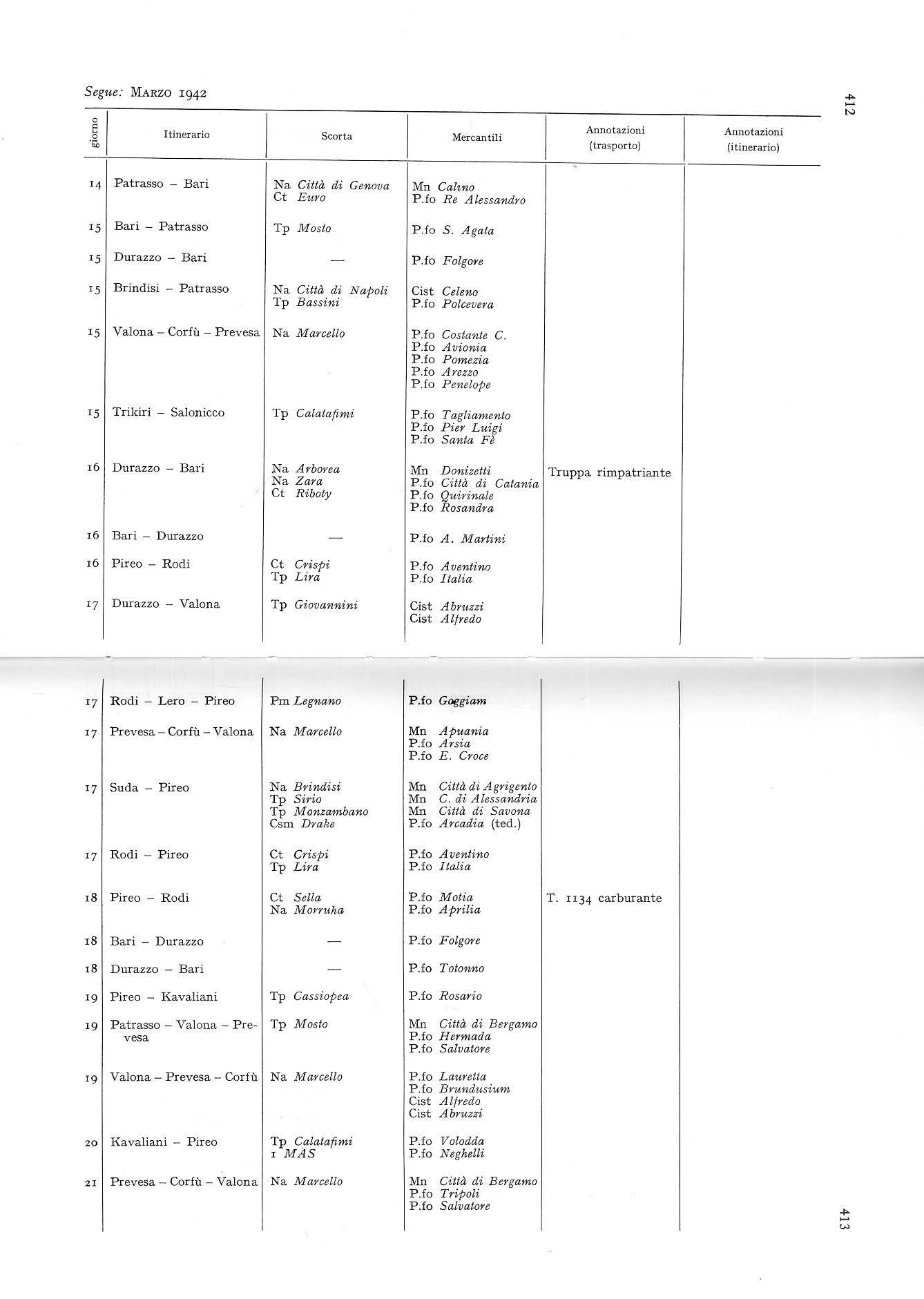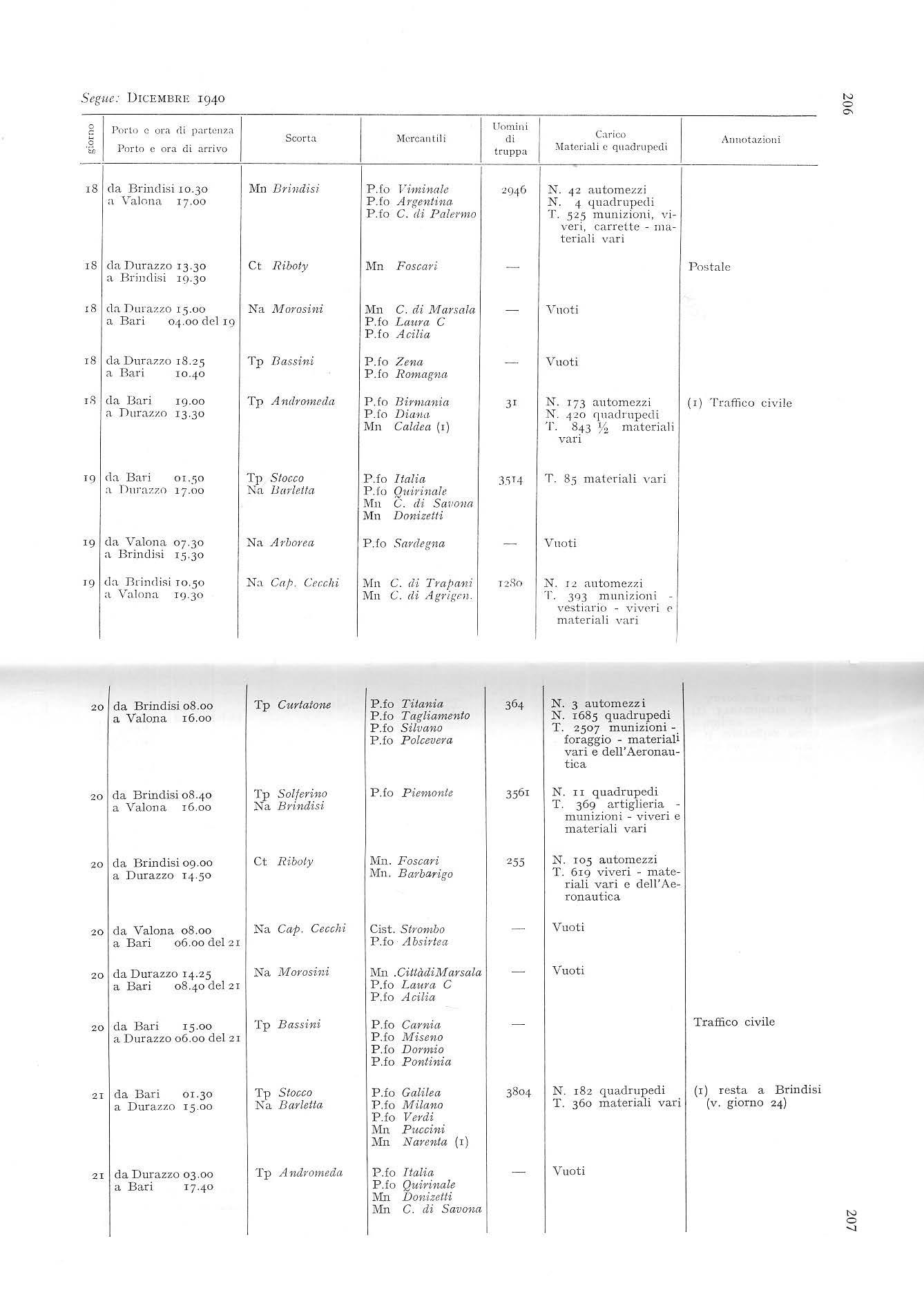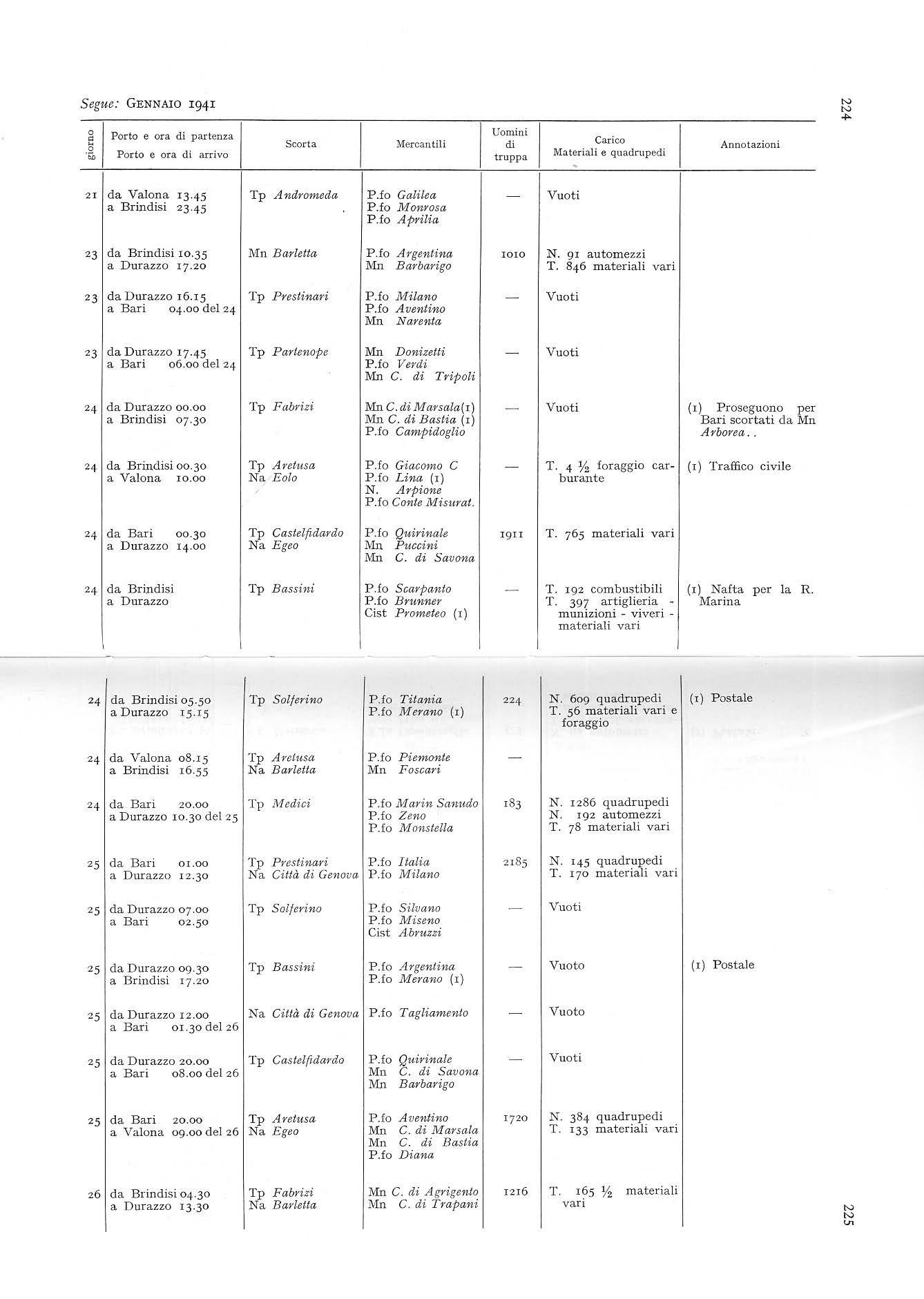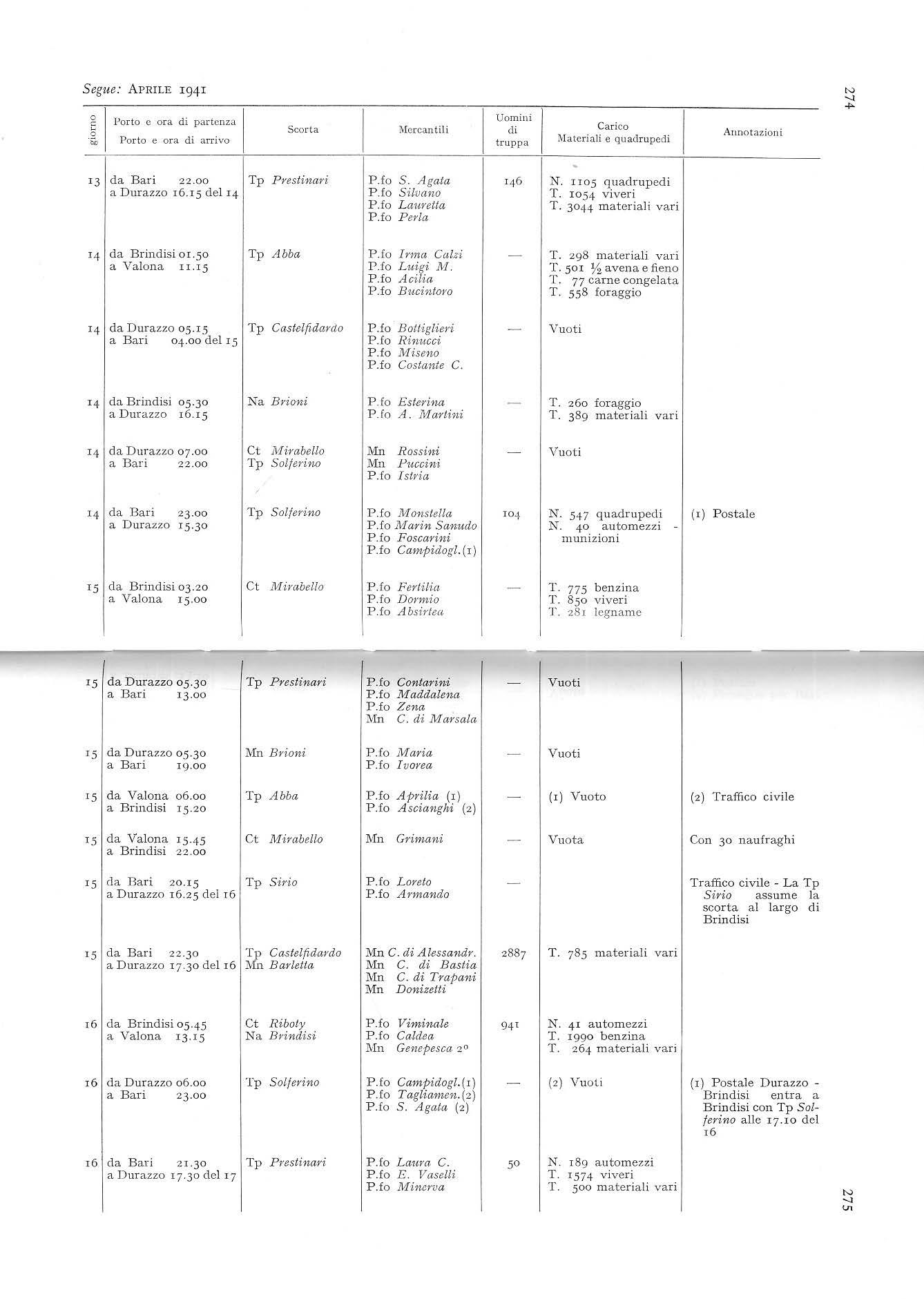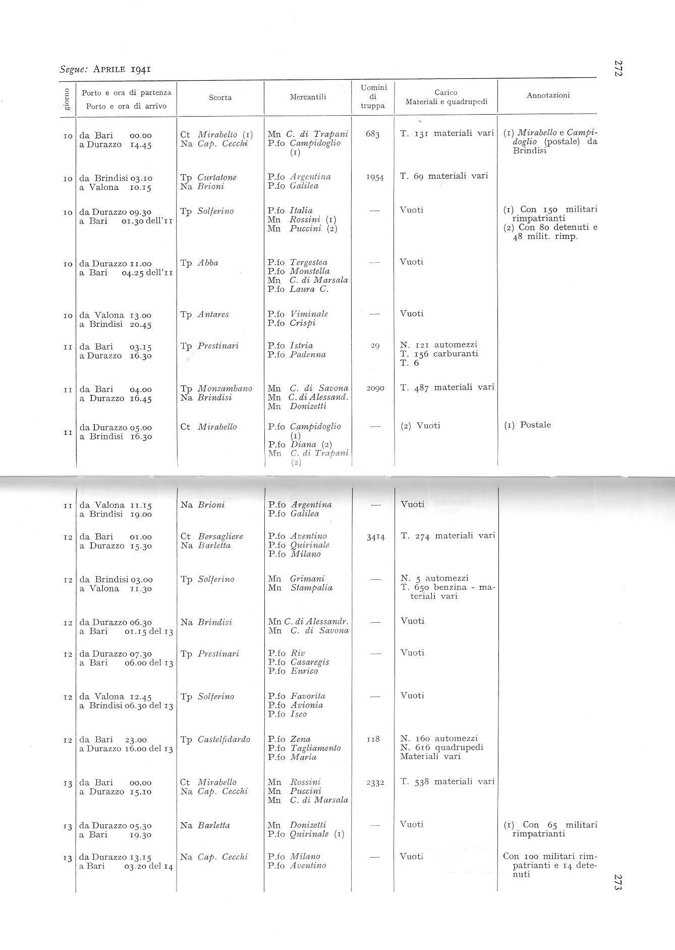 Dopo una breve interruzione iniziale di tre giorni dovuta ad esigenze belliche di carattere generale, ed en trati in funzione i servizi di protezione e dragaggio delle rotte di accesso ai porti, il tra ffico con l'Albania andò svolgendosi per un certo tempo in modo del tutto normale. Tutte le navi mercantili navigarono senza scorta fra i porti pugliesi e quelli alba nesi , effe ttu ando i seguenti trasporti: