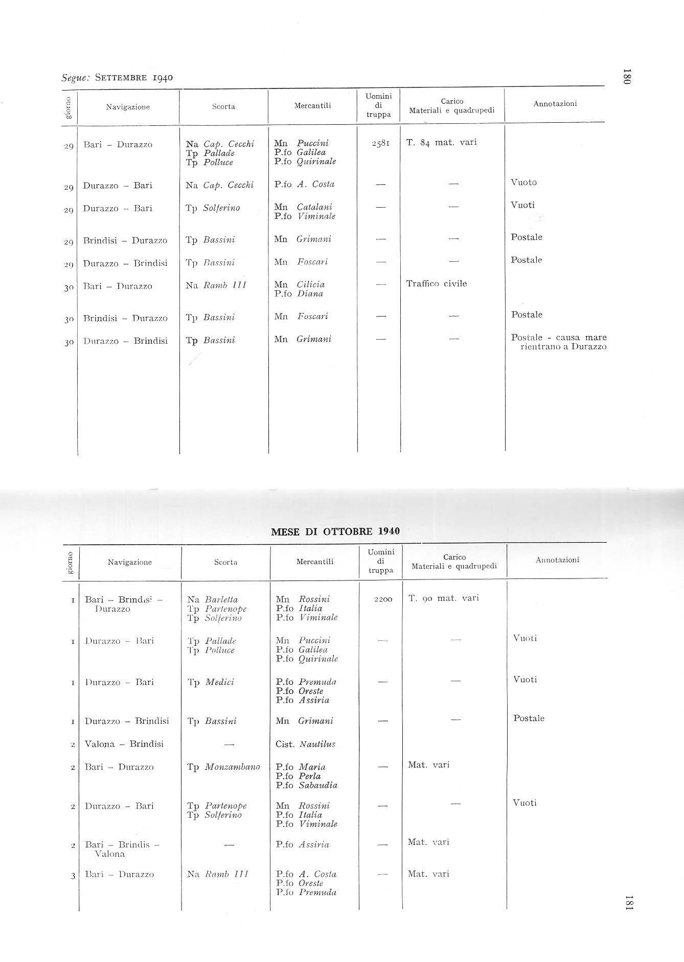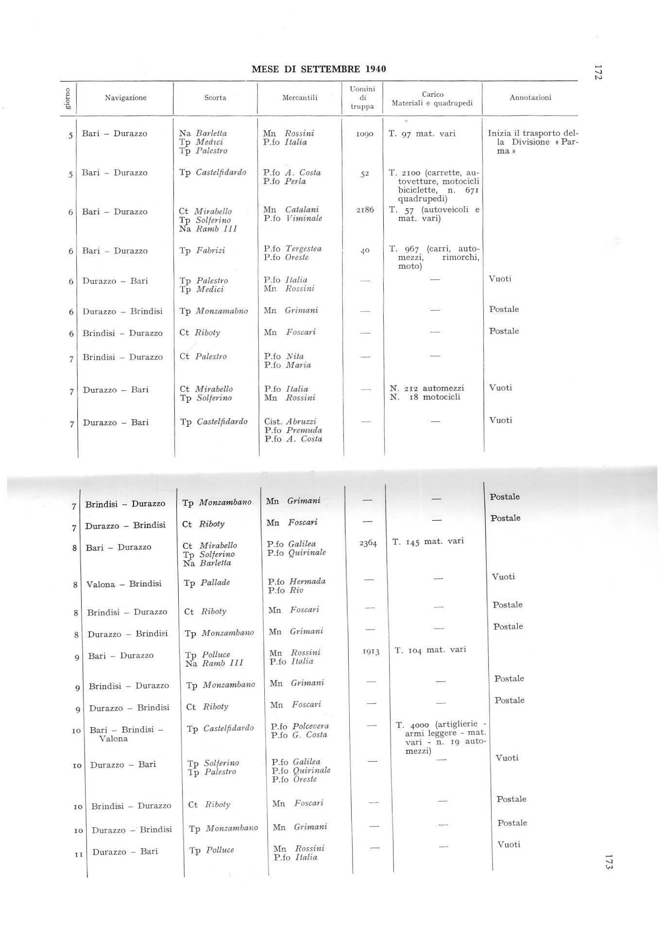 3. Specchio del tra ffico fra Italia ed Albania dur a nte il periodo di trasfer imento delle Divisioni Parma, Siena e Piemonte (5 settembre-5 ottobre 1940)