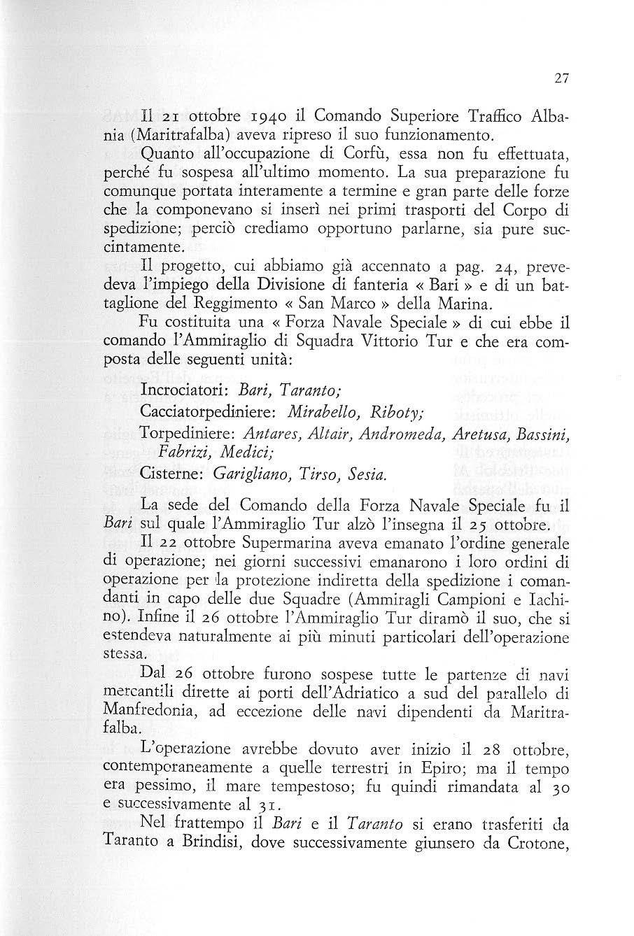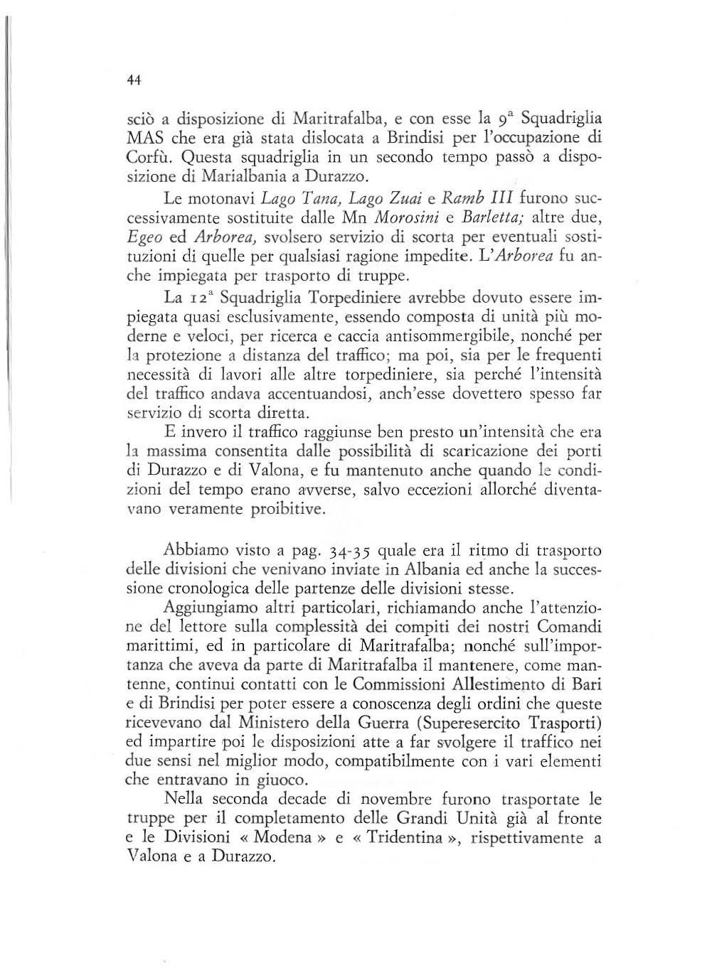 I. Inizio del traffico e provvedimenti per la sua difesa 2 Trasporti da l 2 7 giugno al 5 settembre 1940 3. Primi sentori di operazioni con t ro la Grecia 4. Istituzione del Comando Superiore T raffico Albania (Maritrafalba) - Trasporto delle Divisioni « Parma», « Siena » e « Piemonte » 5. I primi episodi di rilievo 6 La situazione fino all'i n izio delle ostilità contro la Grecia 7 . Ultimi preparativi per il confli t to co n la Grecia - Vicende del progetto per l'occupazione di Corfù - L'ORGANIZZAZIONE DEL TRAFFICO DURANTE IL CONFLITTO CON LA GREC I A