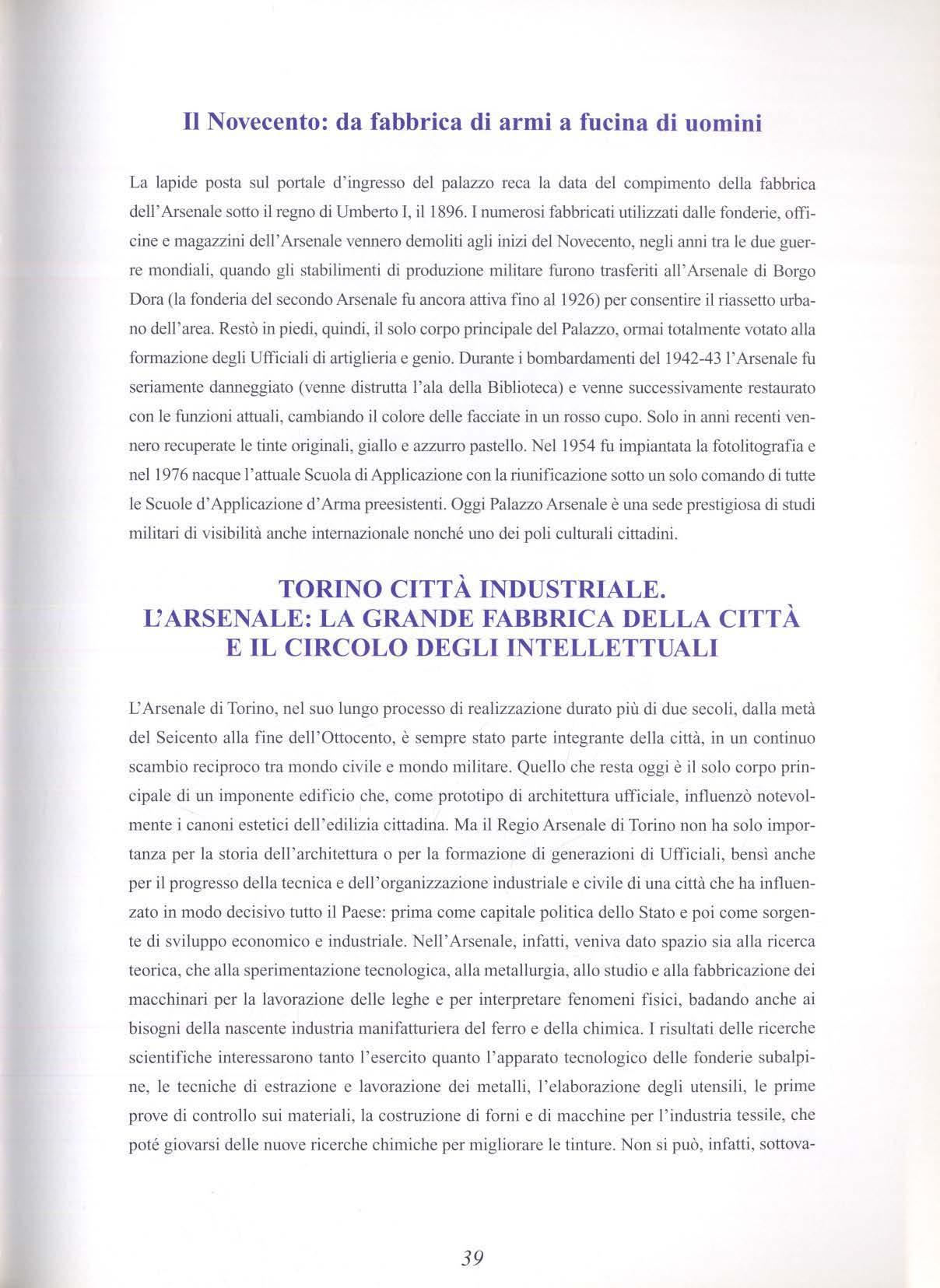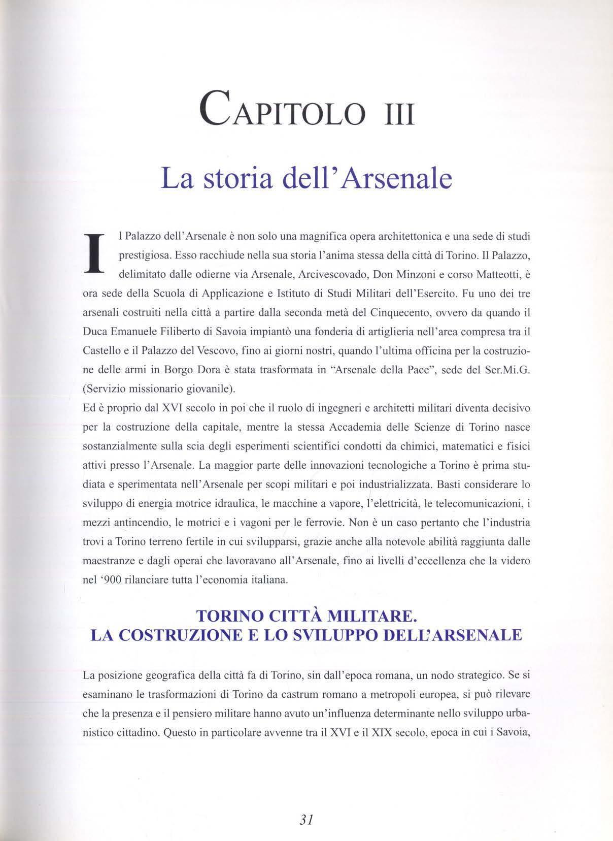 Non si può guardare al futuro senza aver presente con chiarezza il nostro passato, specie in un 'era di eccezionali mutamenti come quella attuale, sospesa tra un millennio e l 'altro. E ciò che siamo diventati oggi, grazie alla nostra storia e alla nostra vocazione alla modernità, lo vogliamo far conoscere a più persone possibili. Queste riflessioni stanno alla base della mia iniziativa di pubblicare un nuovo volume dedicato alla Scuola di Applicazione e Istituto di Studi Militari dell'Esercito di cui ho l'onore di essere stato il Comandante. In questi anni alla guida del più alto Istituto di Formazione dell'Esercito Italiano, ho vissuto con tutto il personale, il corpo docente e gli Ufficiali frequentatori, la rapida evoluzione della nostra Forza Armata ed il suo sfo rzo per adeguarsi ai mutati scenari internazionali. Dall'apertura al personale femminile alla fine della leva, dall ' impegno dell'Italia nelle missioni ali 'estero agli studi sempre più specializzati nel peacekeeping, il nostro Istituto ha saputo prontamente rispondere in modo propositivo alle esigenze dei tempi. E, più di tutto, la Scuola ha recepito la volontà della Forza Armata di aprirsi maggiormente verso il mondo civile e farsi meglio conoscere a!l'esterno. Già da alcuni anni i nostri corsi di Laurea in Scienze Strategiche sono frequentati anche da studenti civili, mentre i saloni del Palazzo di via Arsenale ospitano spesso convegni, cerimonie pubbliche e conferenze di alto livello. Personalmente ho inoltre voluto l 'apertura alle visite gujdate della splendida s trurtma realizzata dall'architetto De Vincenti, su un primo progetto dello Juvarra, per inserire Palazzo Arsenale nel percorso tmistico museale torinese. Dispiace infatti constatare che una realtà così importante per la città di Torino, con cui ha vissuto in simbiosi per oltre due secoli, e per il nostro stesso Paese, sia ancora poco conosciuta. Fortunatamente, però, da più parti arrivano forti e frequenti segnali di un rinnovato interesse per un reciproco scambio.
