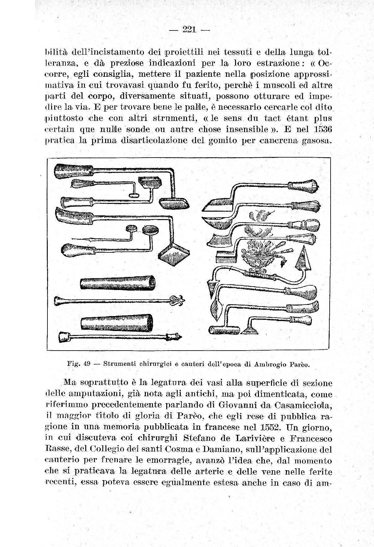 Nellle amputazioni il moncone non è ipiù cauterizzato, ma ricoperto oon lombi formati da parti molli sui quali viene praticata l'emosta:sia e dopo sono 1n·otetti con vescica umida ùi animale. Lo studio dell'estrazione dei proiettili è trattata, con buone eono.~,cenze anatomiche e con esatta descrizione dei cauteri e deg1i strumenti · (fig. 49), fra cui un tira palle a tJ,c punte, un cava,.f.reccie, ed un apparecchio per ridu;r,ionc delle lussazioni, da, lui id,eati.