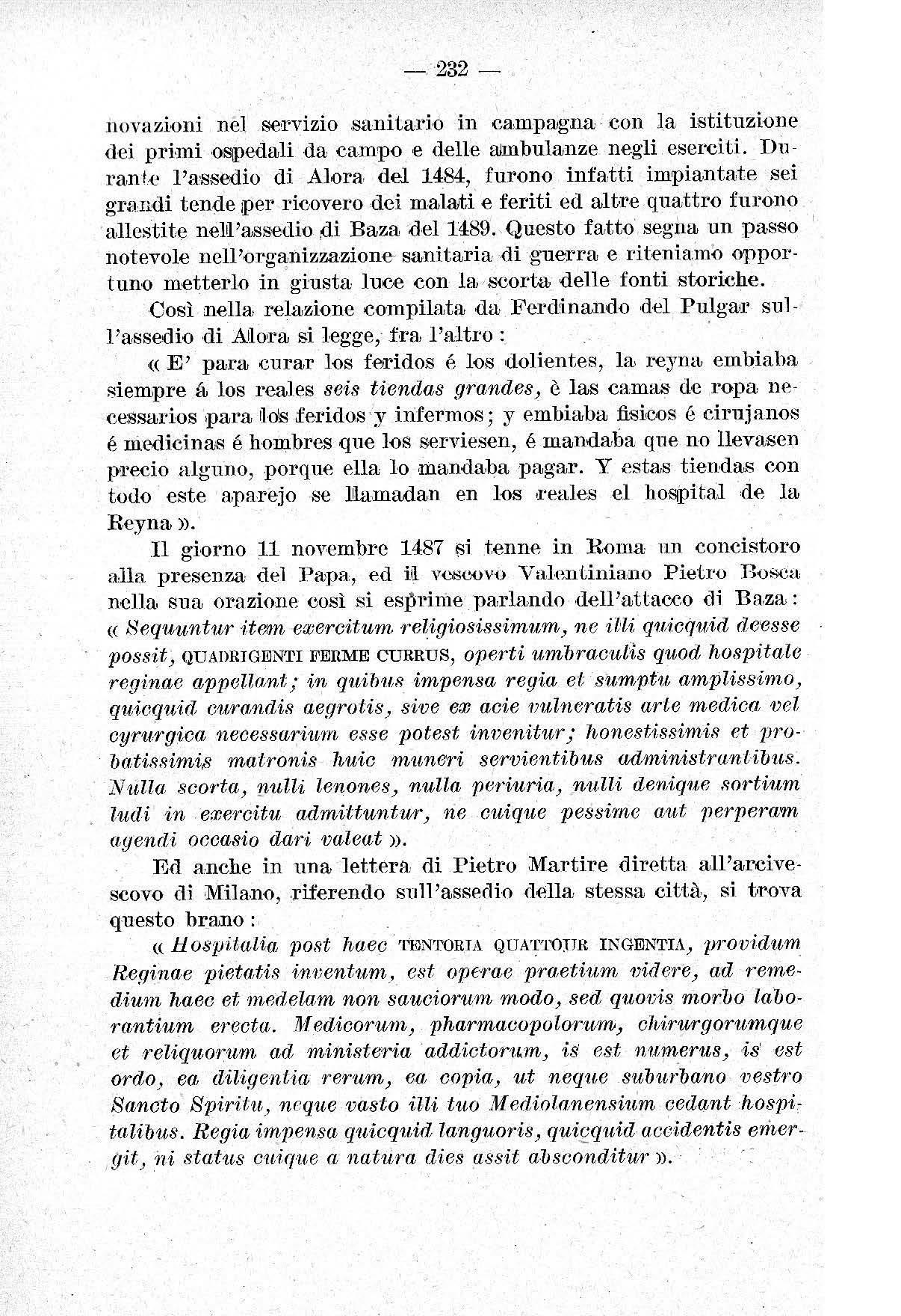 11ovazioni nel serv1z10 sanitario in campagna con Ja istituzione dei primi ostpedali da campo e delle rumbulanze negli eserciti. Di1ra.nt.e l'assedio di Alora del 1484, furono infatti impiantate sei grandi ten9-e :per ricovero dei malaiti e feriti ed altre quattro furono ·a,llcstite nelil'assedìo p.i Baza ,del 1489. Questo fatto· segiia un passo notevole nell'organizzazione- sanitaria di guerra e riteniamo opportuno metterlo in giusta luce con la,,.scorta. delle fonti storiche.