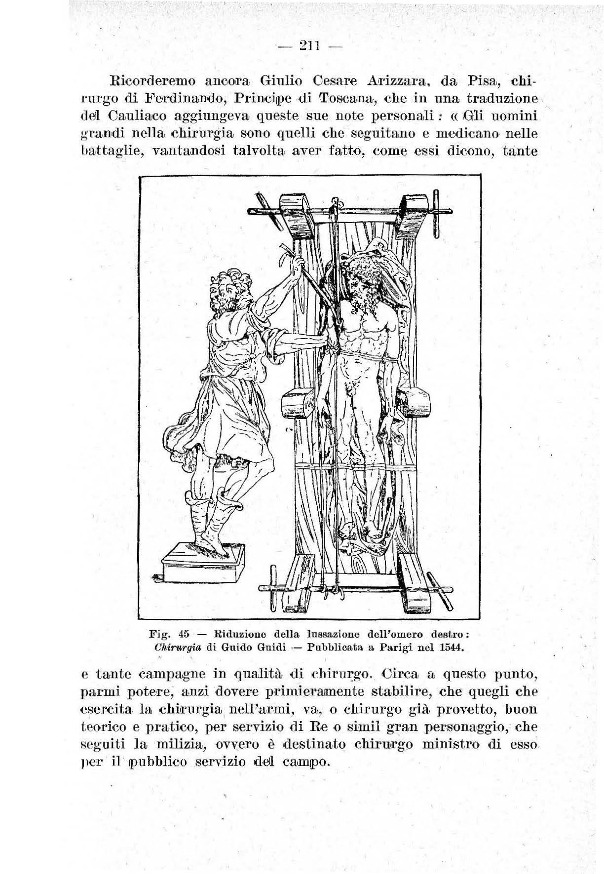 Ricorderemo ancora Giulio Cesare A,rizza.ra, da Pisa, chi1·urgo di Ferdinando, Princi1pe di Toscana,, che in una traduzione deil Cauliaco aggiungeva queste sue note personali: « Gli uomini gTandi nella chirurgja sono quelli che seguitano e mc<lkano-nelle hattaglie, vantandosi talvolta aver fatto, come cssi dicono: ta.nte