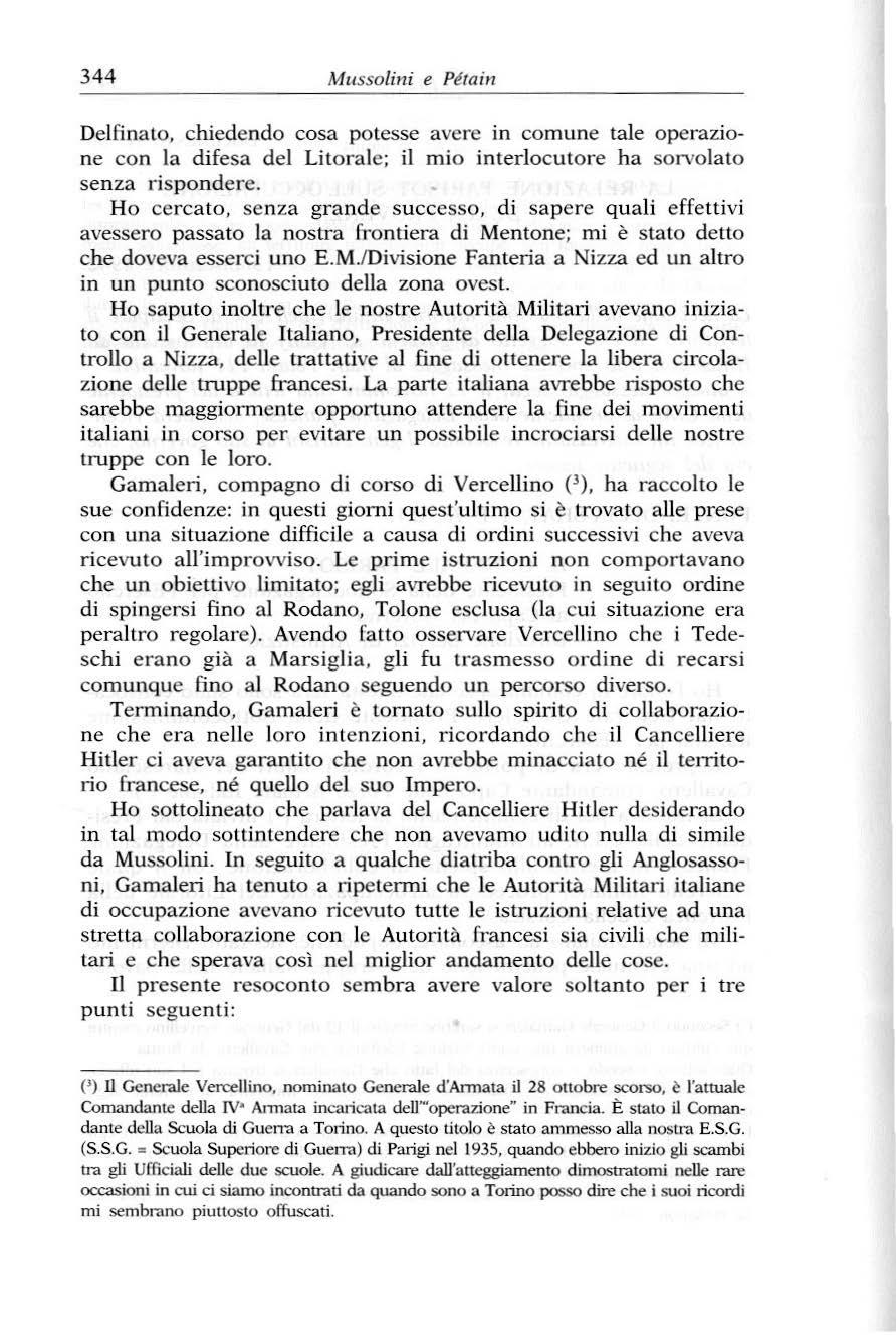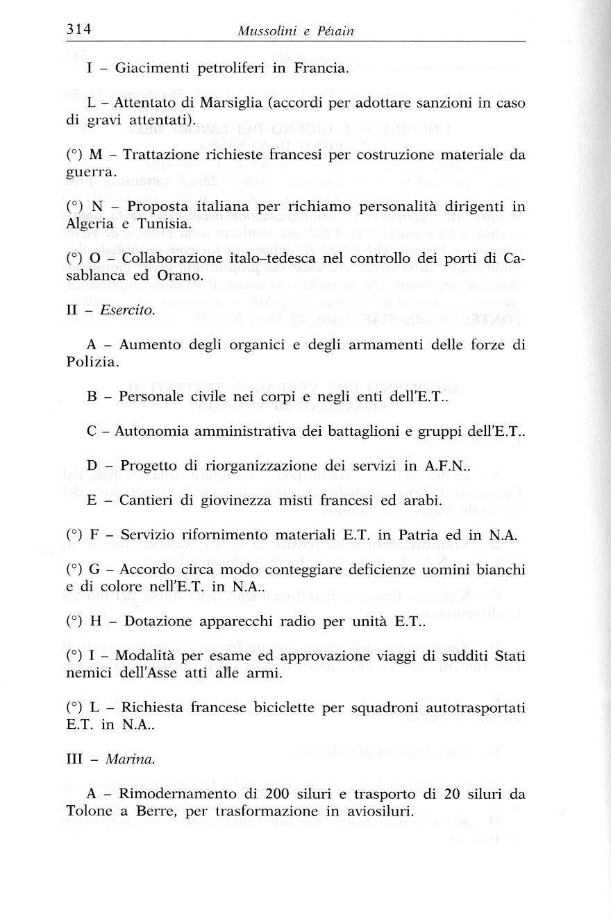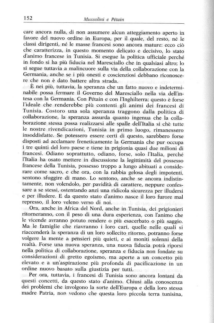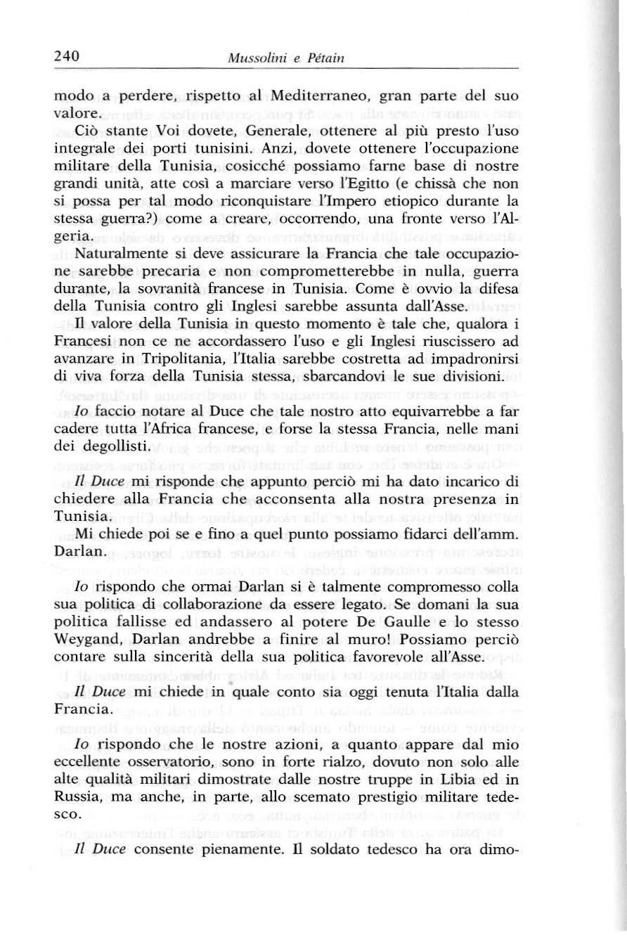 1° novembre 1940), P arigi, Plon, 1949; A. Fabre-Luce, Joumal de France, 1939-1944, ed. ital. Un francese risponde (Giornale di Francia) 1939-1944, Milano, Longanesi, 1948; M. Weygand, Mémoires vol. III: Rappelé en seroice, Parigi, Flammarion, 1950; P. Baudo uin, Neuf mois au gouvemement (avril-décembre 1940), Parigi, Table Ronde, 1948; Y. Bouthillier, Le drame de Vichy. Pace à l'ennemi, face à l'allié, Parigi, Plon, 1950; P. Paillole, Seroices spéciaux 1935-1945, 2 tomi, Parigi, Famot, 1978. Non mancano studi sulla situazione politica di Vichy che toccano, quasi sempre di sfuggita i rapporti con l'Italia, preferendo la maggior parte degli storici dedicarsi alla parte polemica interna francese o ai rapporti con i tedeschi. Tra i più importanti vanno segnalati: J.B. Duroselle, L'abfme. Politique étrangère de la France 1939-1949, Parigi, Imprimerle Nationa l e, 1983; R . Aron, Histoire de Vichy 1940-1944, Parigi, Fayard 1954; R.O. Paxton, La France de Vichy 1940-1944, Parigi, Seuil, 1950; M. Serra, Una cultura dell'autorità: la Francia di Vichy, Bari, Laterza, 1980; O. Abetz, Histoire d'une politique franco-allemande (1930-1950). Mémoires d'un ambassadeur, Parigi, Stock, 195 3; L.D. Girard, Montoire, Verdun diplomatique, Parigi, A. Bonne, 1948; H. Cras, L'armistice de juin 1940 et la crise franco-britannique, Parigi, Service Historique de la Marine Nationale, 1959; A. Dainville, L 'ORA, la résistance de l'armée 1939-1945, Parigi, Lavauzelle 1974; J.M . Vemet, L'Armée d'Armistice 1940-42. Une petite armée pour une grande revanche?, Vincennes, SHAT, 1983 ; A. Truchet, L'armistice de 1940 et l'Afrique du Nord, Parigi, PUF, 1955; Les juifs d'Afrique du Nord sous Vich y, Parigi, Maisonneuve et Larose, 1983 ; A. Cavaglion, Nella notte straniera. Gli ebrei di St. Martin Vésubie, Cuneo, L'Arciere, 1981; L. Poliakov, La condition des Juifs en France sous l'occupation italienne, Parigi, Centre de Documentation Juive contemporaine, 1946; L. Poliakov e J Sabille, Jews under the Italian occupation, Parigi, 1bid. 1955