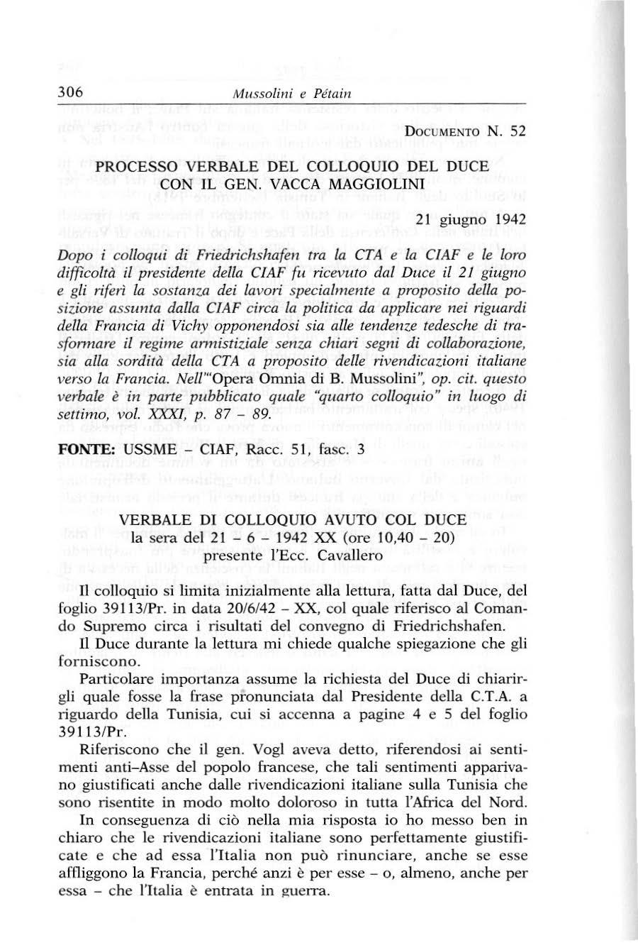 52. P rocesso verba le del colloqui o del Du ce con il gen . Vacca Maggiolini (21 gi u gno) ..... .. ... .. ... .. .