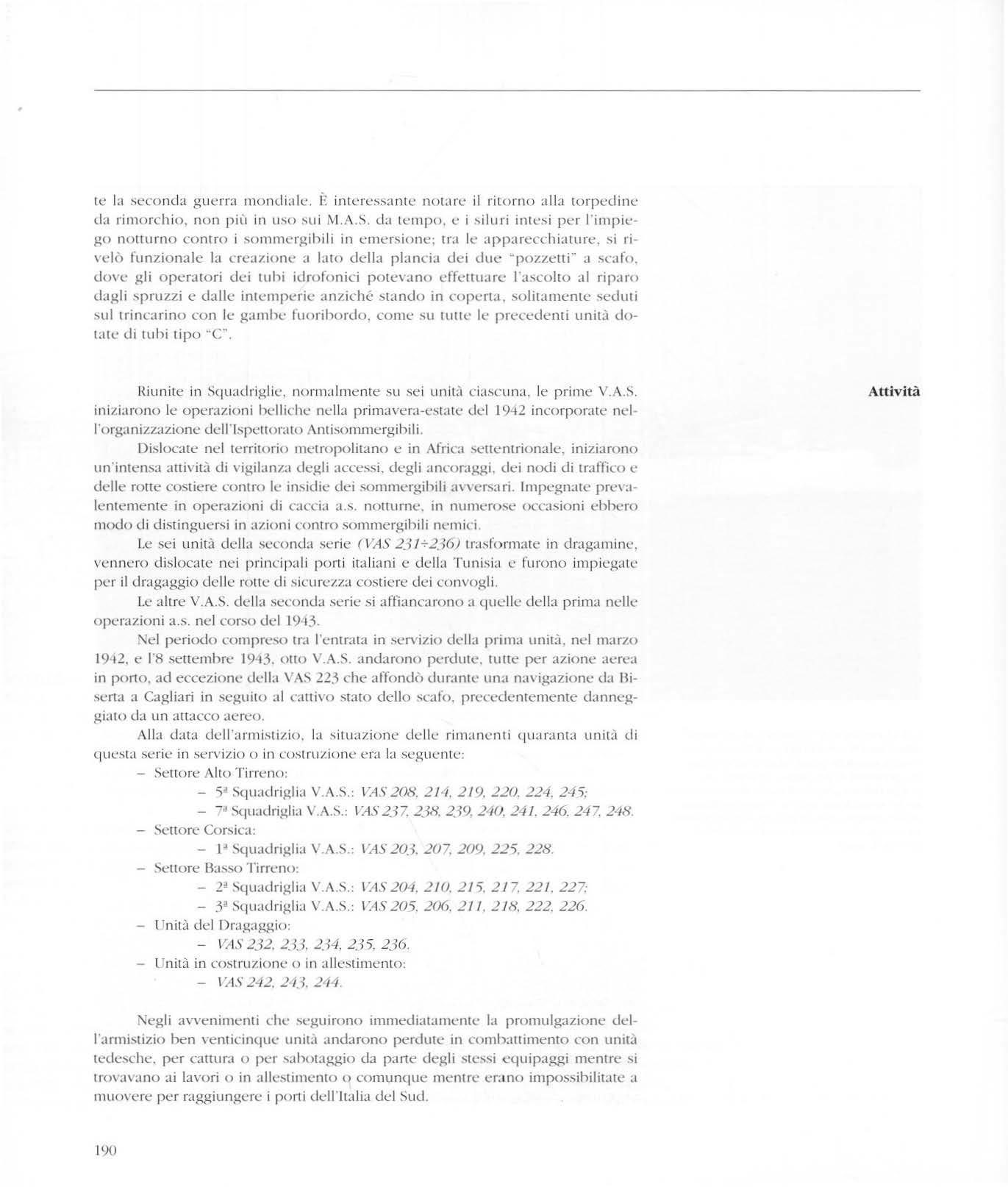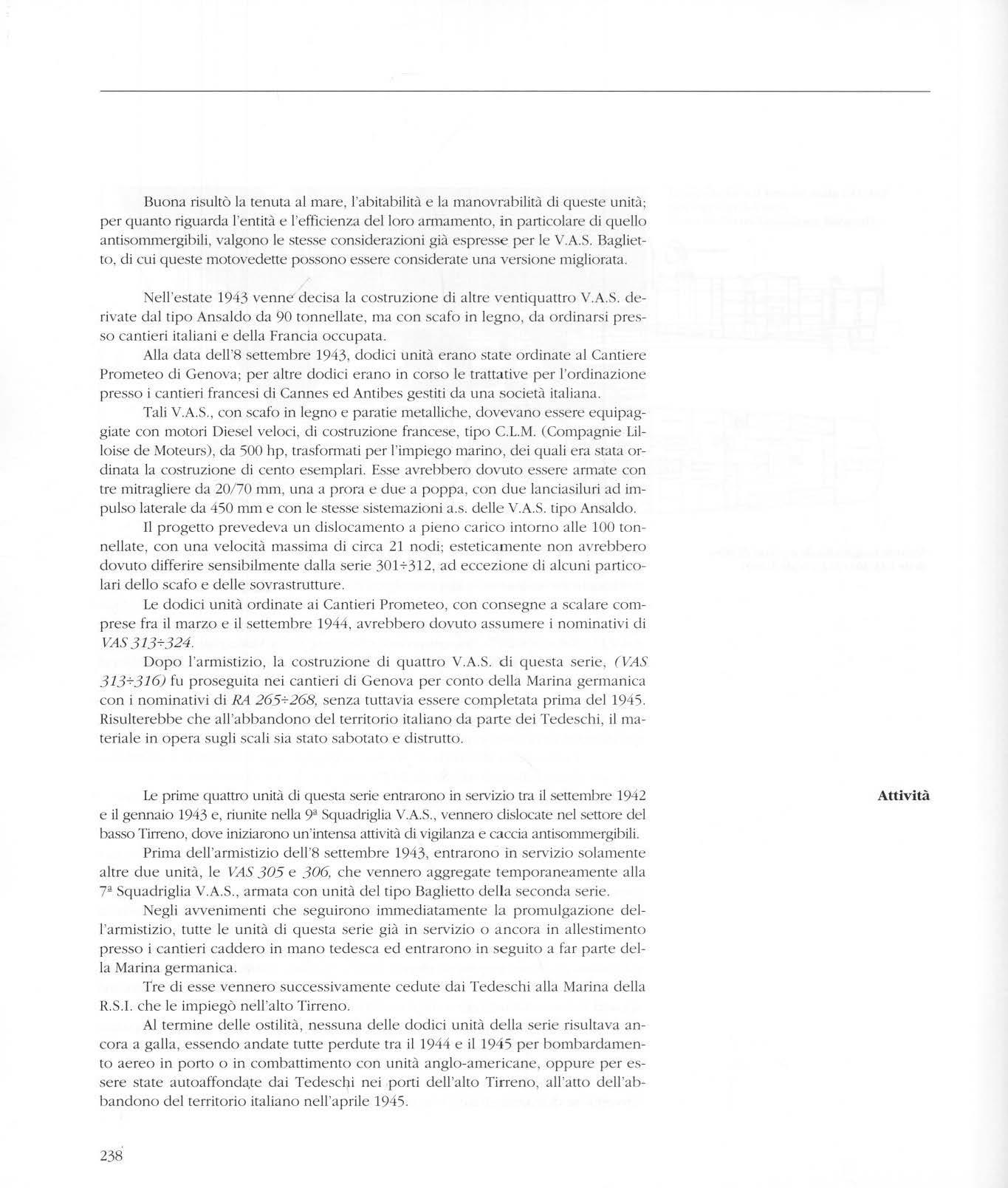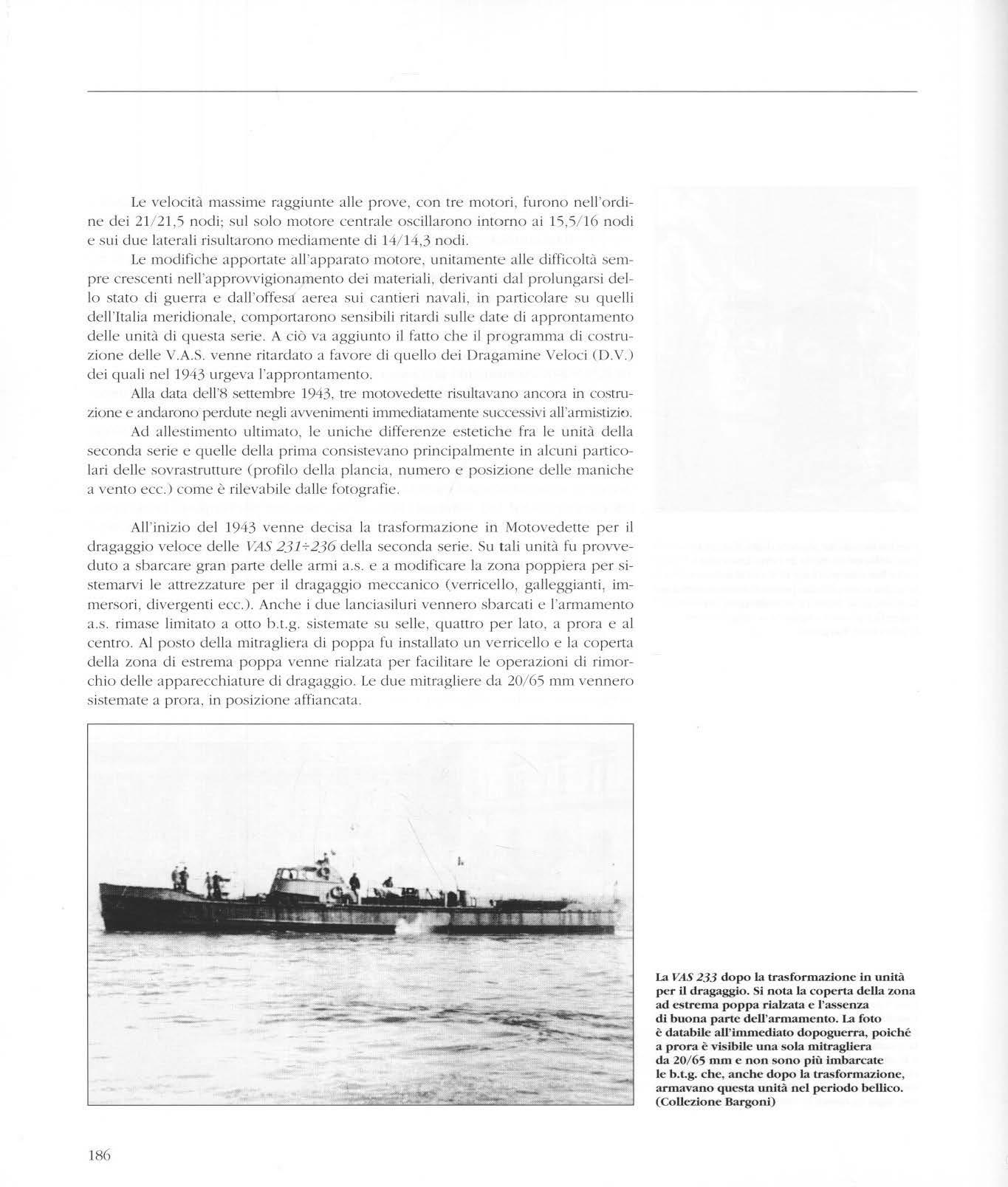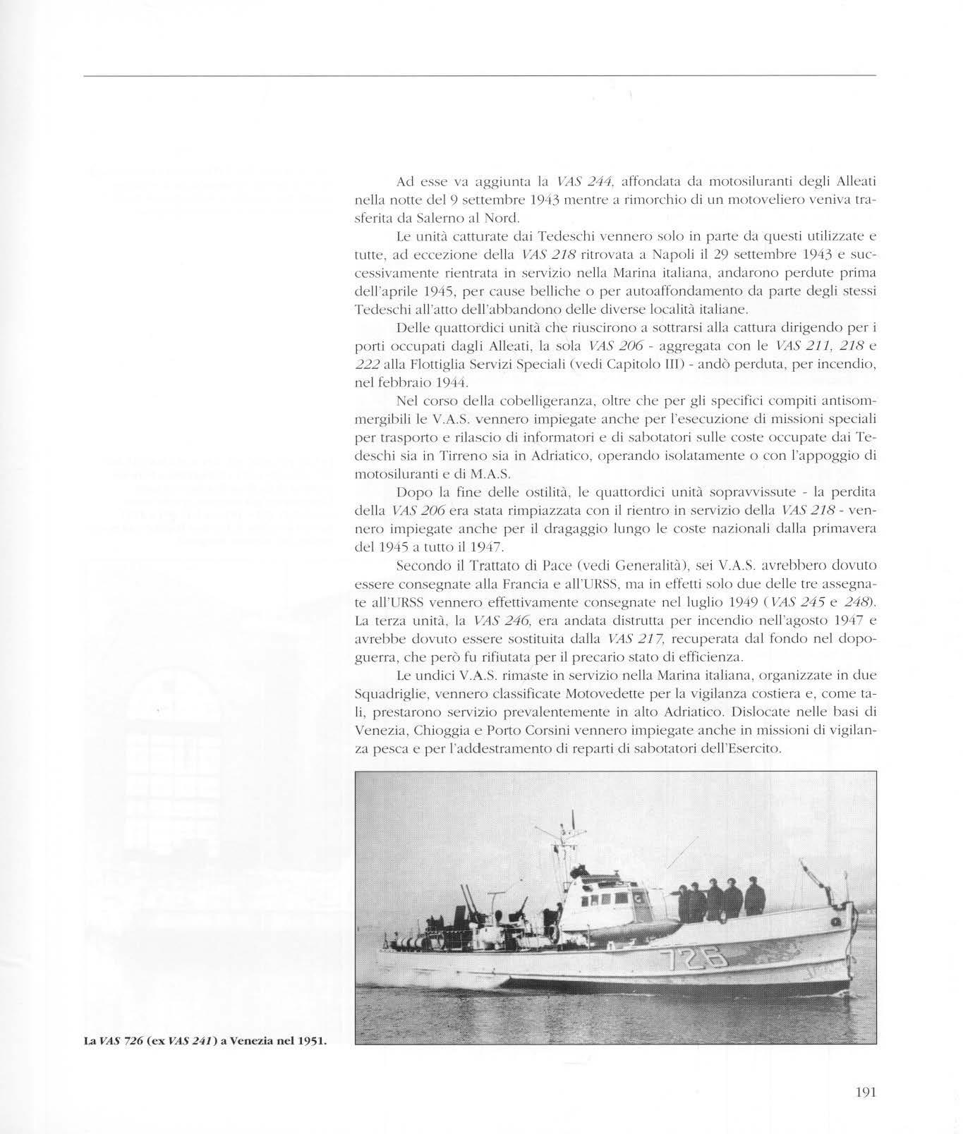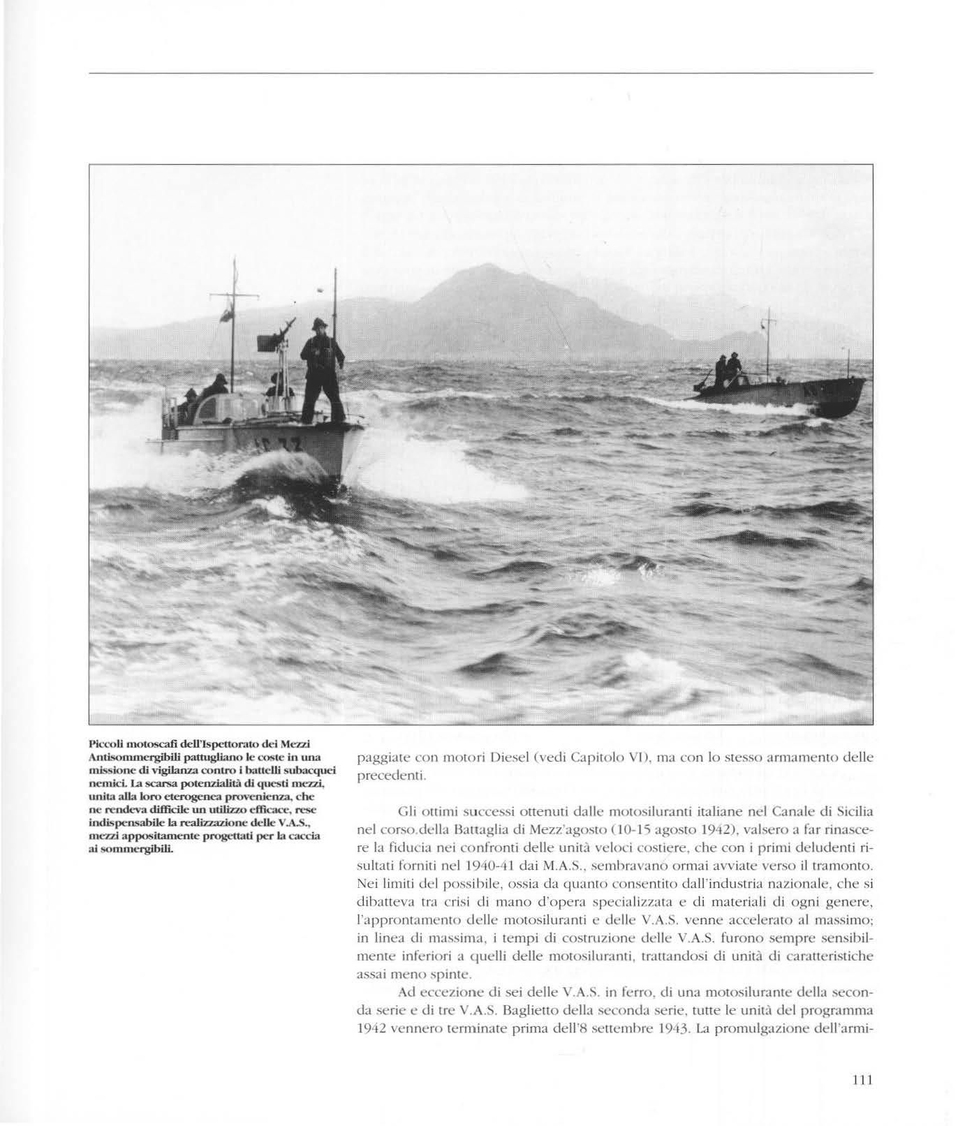 Nel periodo hellico ed in quello immediatamente s uccessivo, infani , le unità veloci costiere italiane subirono una netta division e della loro linea di sviluppo, determinata da ll e esigen7:e o perative che l 'a ndam e nto della g uerra faceva emergere scmpr<: p iù chiaramente; da una parte conrinuò lo svi luppo dei M.A.S. - unità peculiari della Marina italiana -c dei mezzi d 'assal to che ri spo ndevano al concetto operativo del rapido colpo di mano, condono da mezzi ve locissimi e di ridottissimo dislocamento; dall'altra si originarono le motosiluranti c le motocannoniere - concepite inizialmente da mezzi di origine t edesca - che dovevano sfruttare le loro maggiori dimensioni e il loro supe ri ore armamento per avere una maggiore flessibilità d'impiego e che, nel dopoguerra, conobbero un'ulteriore sviluppo, con mezzi realizzati dalla cantieristica nazionale c con l'adozione dell'arma missilistica. Dallo stesso ceppo si originarono le V.A.S. che però ebbero un 'utilizzo del tutto particolare.