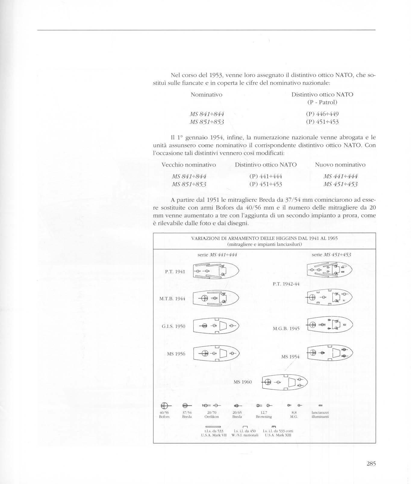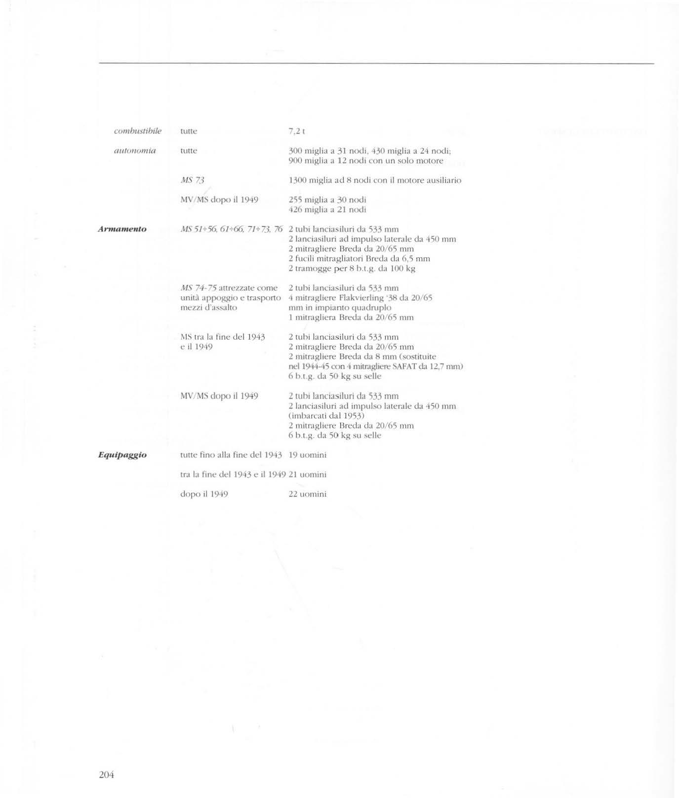 A rm a m en t o.· per i cannoni e l e ar mi automa ti c h e è gene ra lme n te i nd i ca t o i l n u me ro de lle ar mi, il ti p o c la casa cos tr utt ri ce (acl es. mitrag li cra Breda). i l c alibro i n mi llimet ri ( m m) e, per le mitrag li ere pesan ti ed i ca nn oni la l ungh ezza de ll 'anima espressa in calibri (ad es. 40/56); per i l ançias i luri, ol t re al numero comp l essivo, è indica t o il ti po (acl impulso laterale ecc.) ed i l ca l ibro de ll e armi impiegabili (ad es. 450 mm); per le bombe antisommergibi li , l e torpedini da rimorchio ecc., oltre alla dotazione complcs!>iva, è indicato il peso delle singole armi in chilogrammi Ckgl; in linea di massima sono indicate le principali variazioni dell'armamento an·cnute nel tempo; le variazioni minori sono imece riportate nella !>ezione "Ge neralità"; per le unità per cui erano prc'>iste di,·erse versioni eli armamento sonoriportate le dota7ioni.