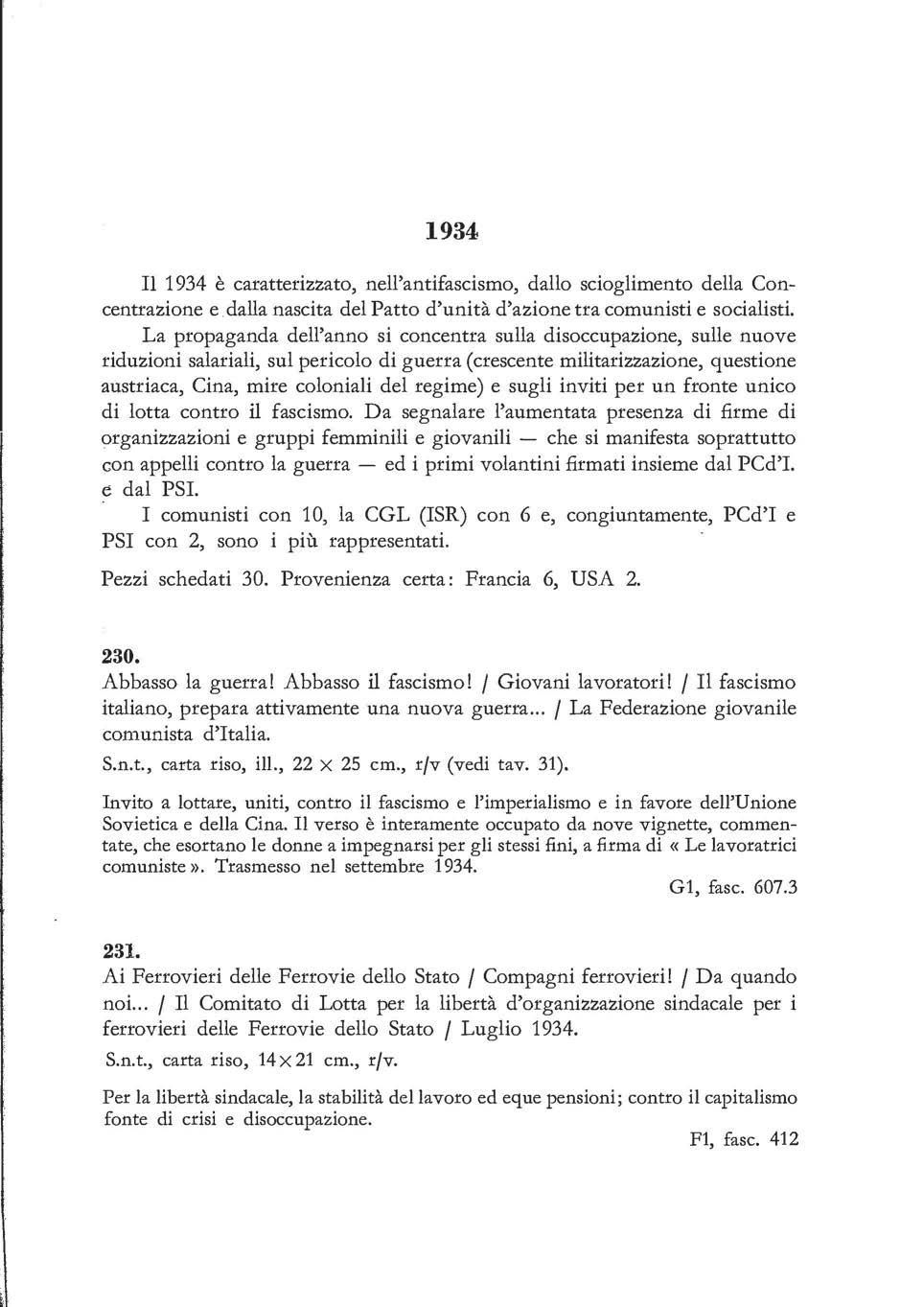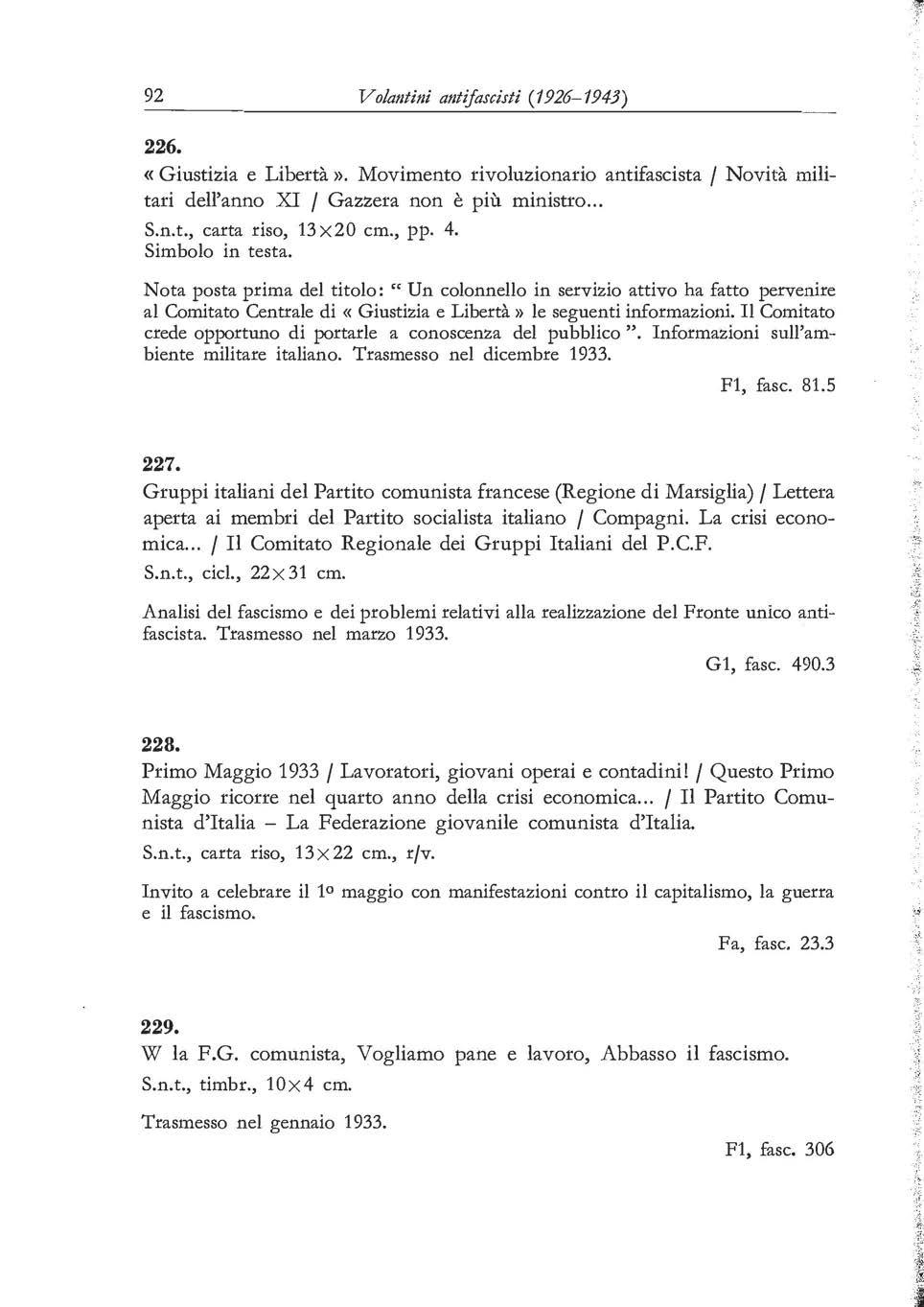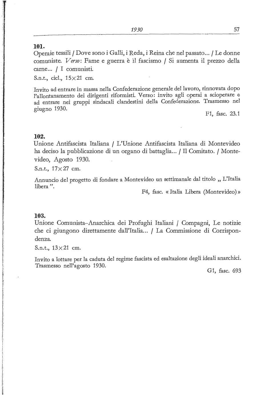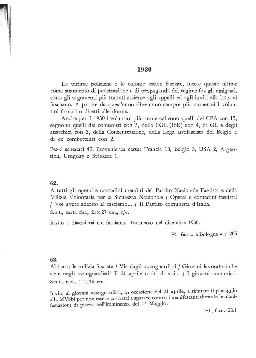 Il primo materiale a stampa clandestino reperito è del marzo 1927 e riguarda soprattutto la costituzione all'estero delle organizzazioni antifasciste. La Concentrazione, con tre volantini, è la più rappresentata.