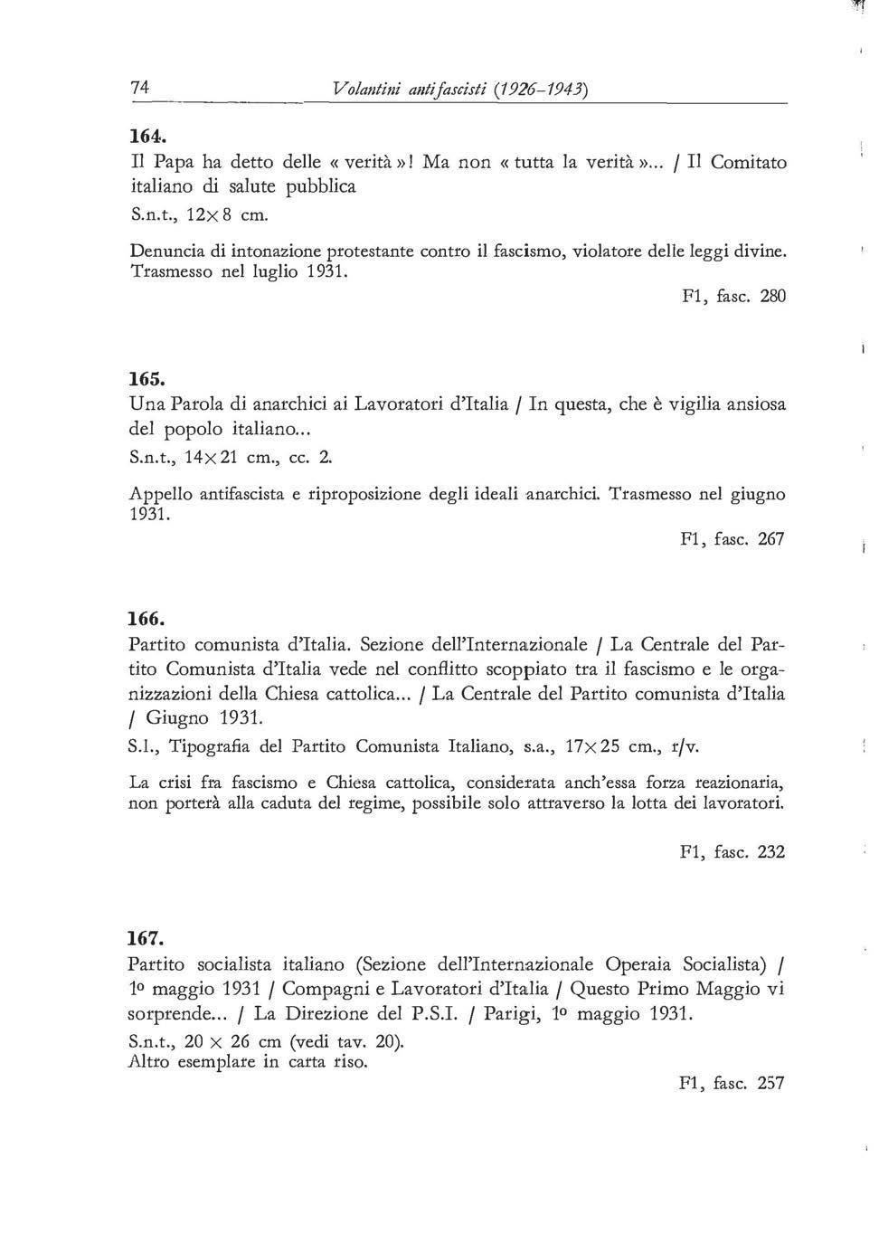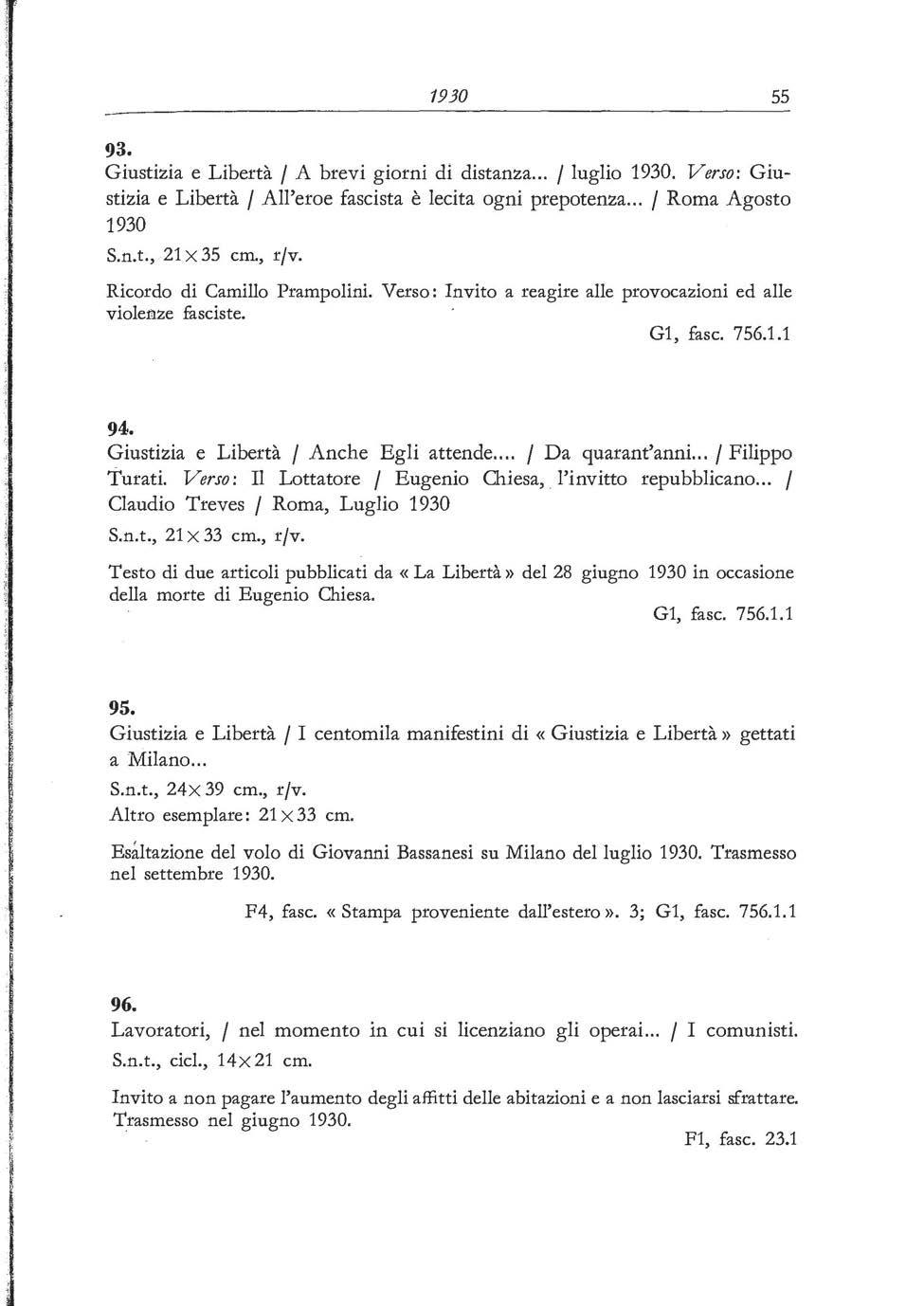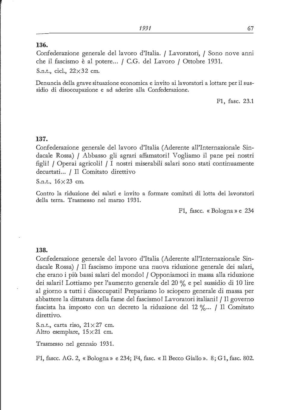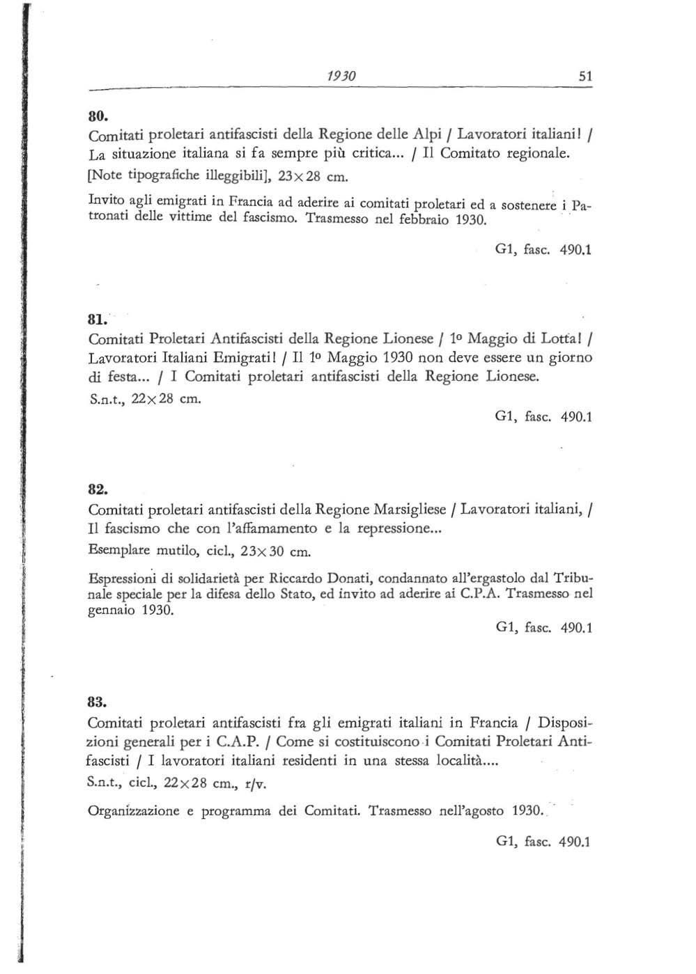 Il primo materiale a stampa clandestino reperito è del marzo 1927 e riguarda soprattutto la costituzione all'estero delle organizzazioni antifasciste. La Concentrazione, con tre volantini, è la più rappresentata.
