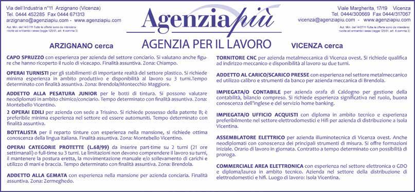 bilità e flessibilità nell’orario, full o part-time, a chiamata o sostituzione (anche serale e festivo). Zona Valchiampo-Agno. Tel. 3286662595, anche WhatsApp.