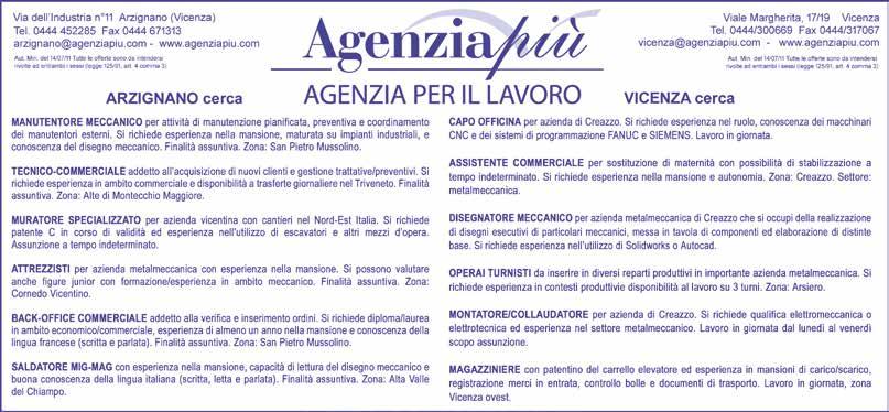 • Azienda metalmeccanica di Montecchio Maggiore cerca persona di responsabilità con mansioni varie nel settore di CNC continuo, attrezzaggio presse meccaniche e oleodinamiche, nonché altre mansioni di assemblaggio e puntatura divari articoli di nostra produzione. Pregasi esperienza. Tel. 0444696991, chiedere di Gilberto.