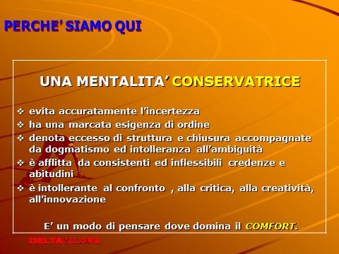 Conservatore: chi si è autocondannato a vivere per sempre nel passato. L’attaccamento al passato è manifestazione di paura che a sua volta produce e diffonde comportamenti rigidi, contratti, difensivi, conflittuali.
