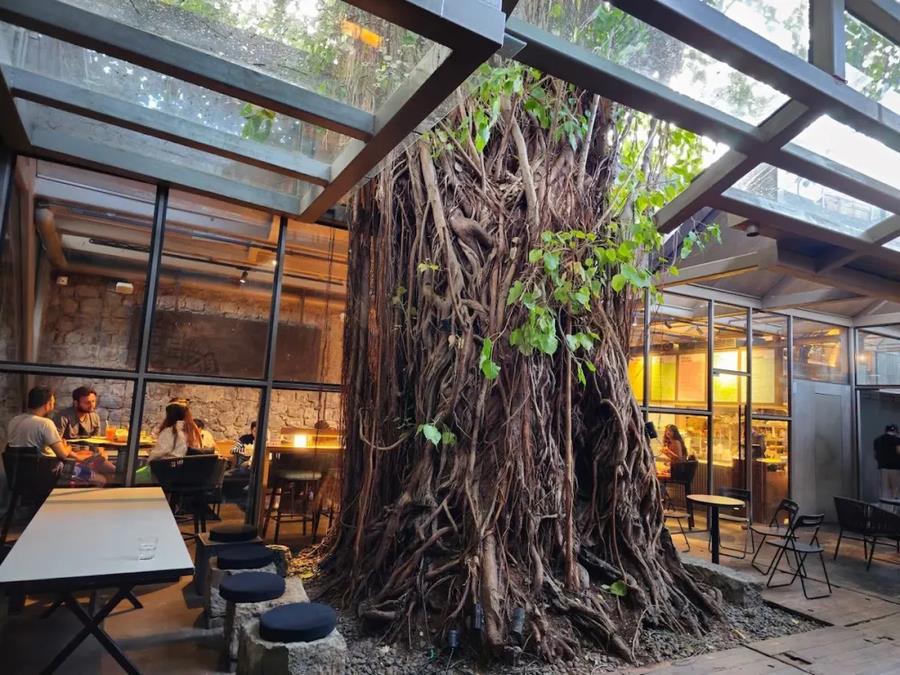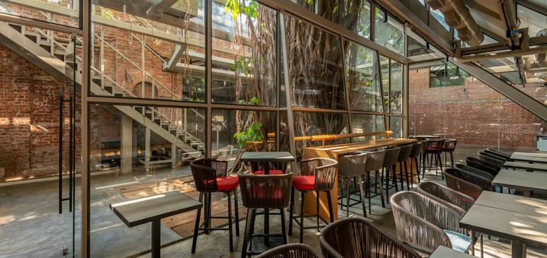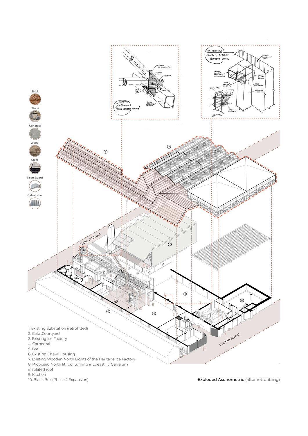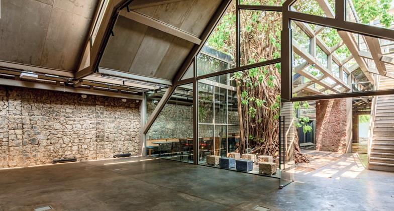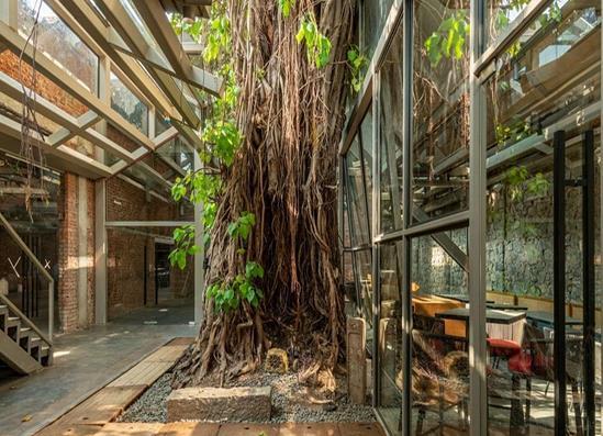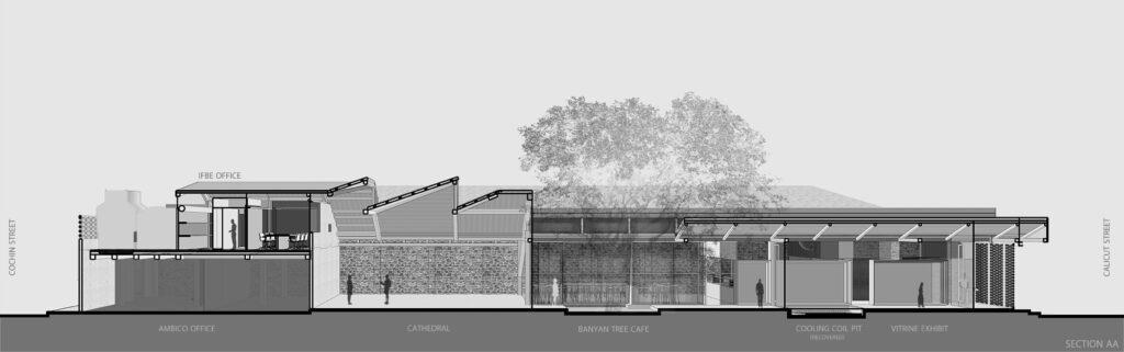 Within the courtyard, an old banyan tree sits alongside the chimney of the factory. The recovery of the courtyard, restoring clarity to the original structure, allowing the Banyan tree to breathe and finding a way to shelter the new/additional cultural spaces through a dialogue with the original structures was critical.