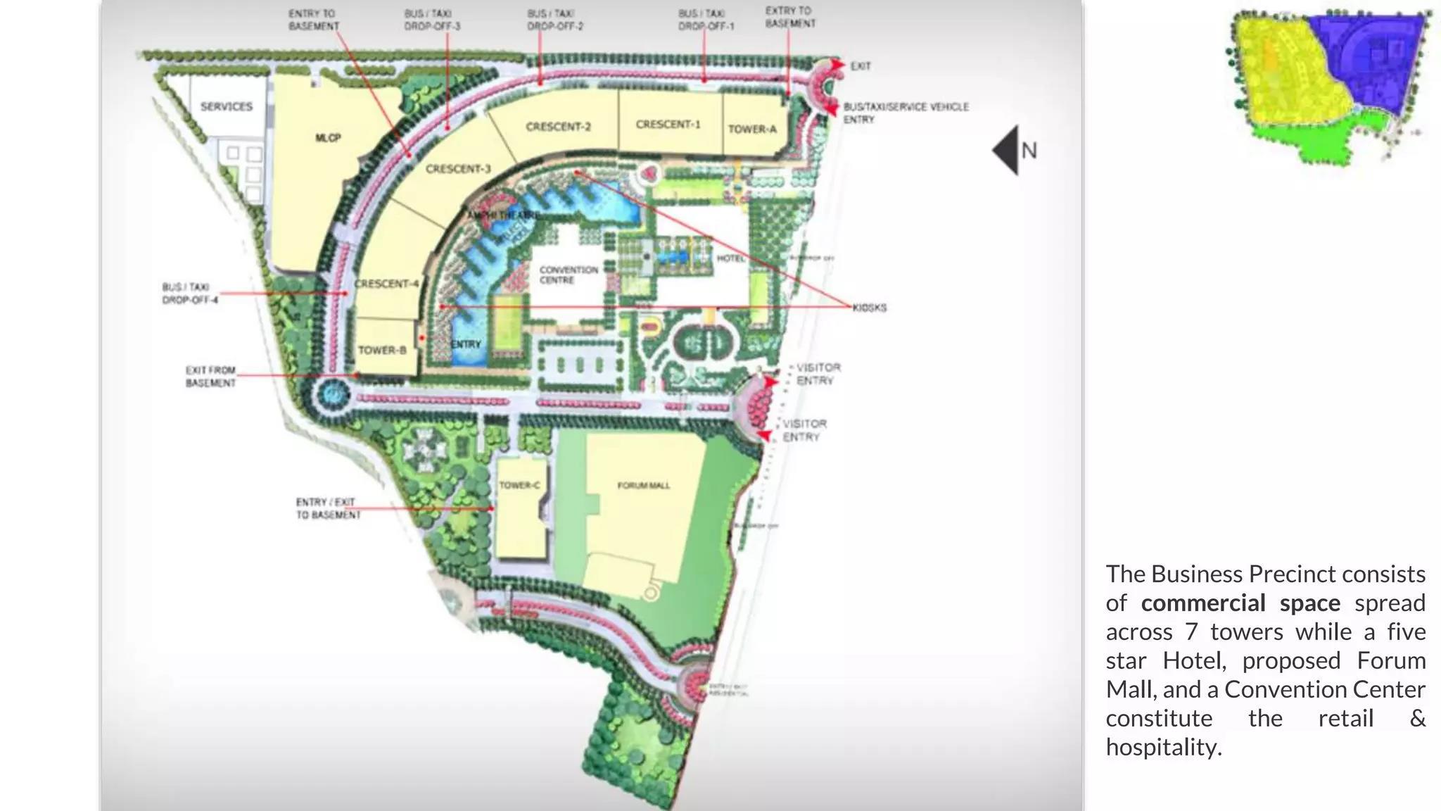 • Sustainability Zone: Water recycling plant, energy-efficient systems, and green facades.