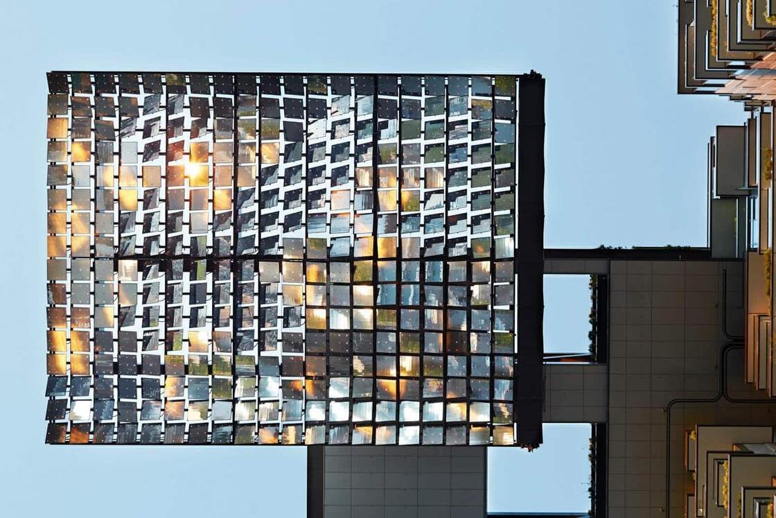 The heliostat at One Central Park uses 40 motorized mirrors to redirect sunlight into shaded areas and enhance natural lighting. It reduces the need for artificial light and features an artistic light display at night, combining environmental efficiency with modern design.
