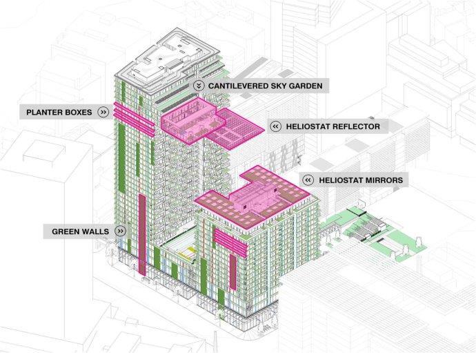 Heliostat: A system of motorized mirrors on the roof of the West Tower that reflects sunlight down into the shaded areas of the development, including the Sky Garden.