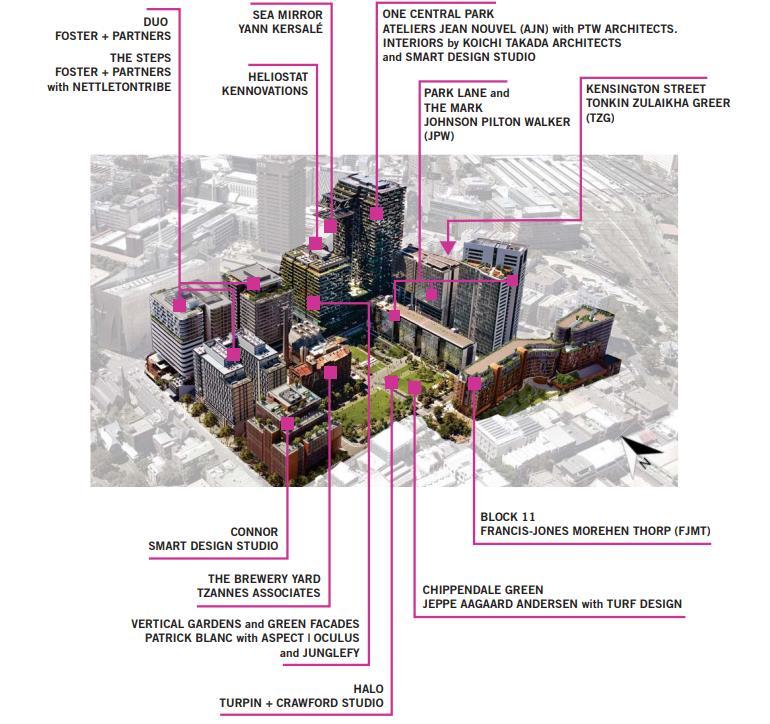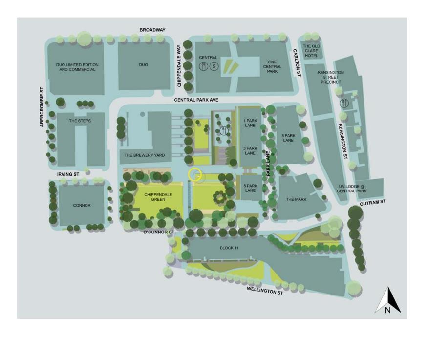 • Public Zone: Chippendale Green park and public spaces for recreation and events.