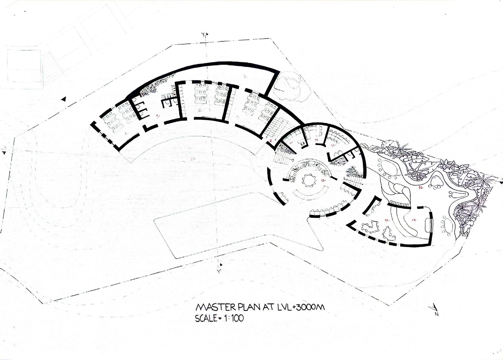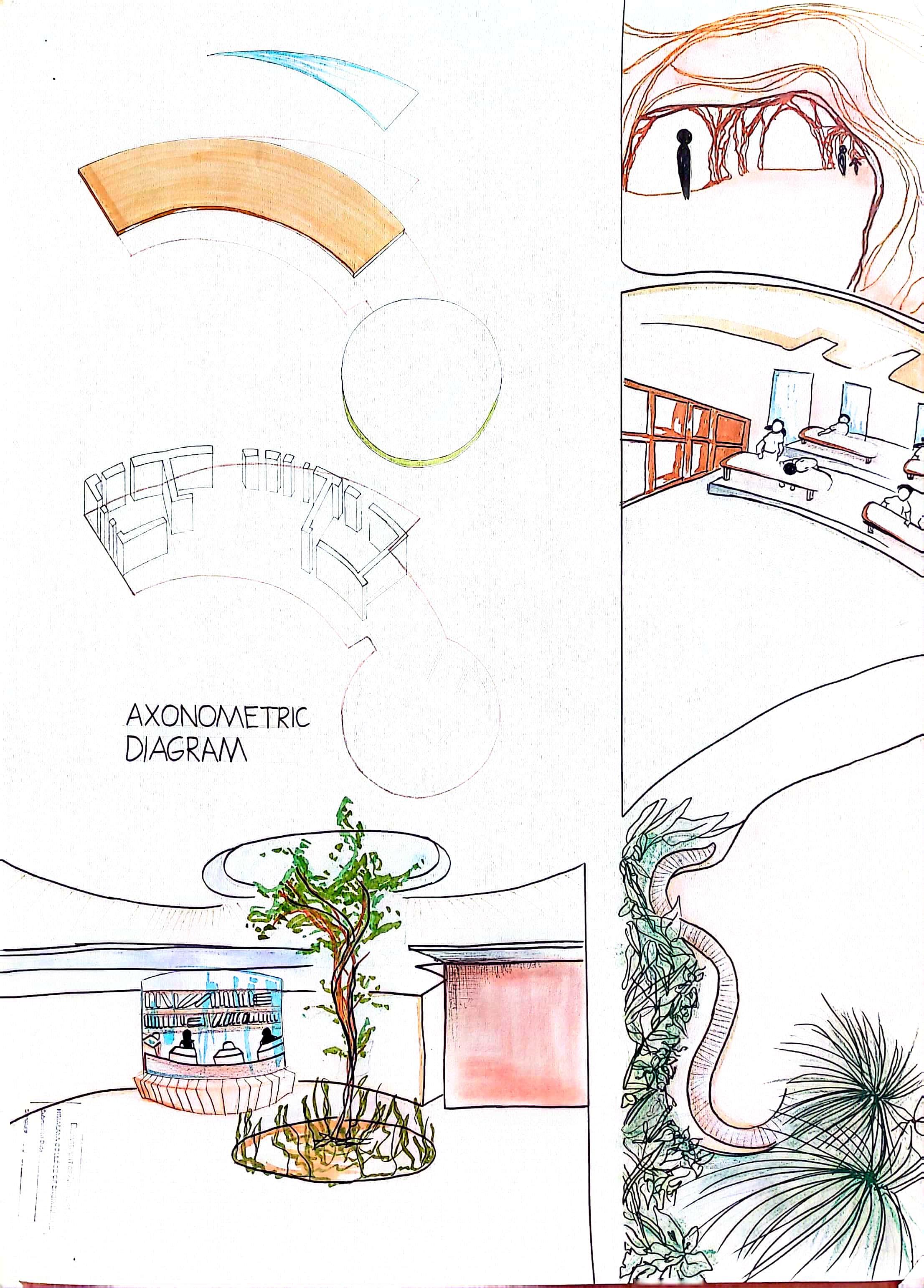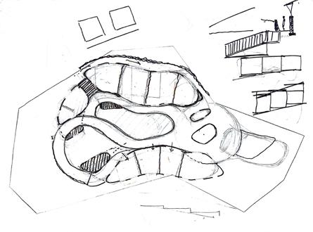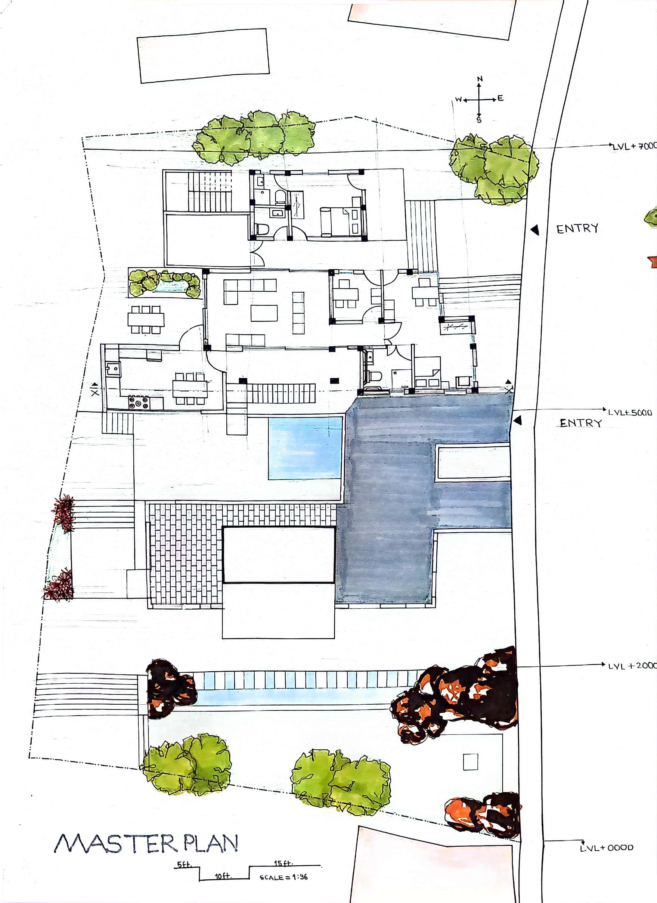 the design started with a multi level approach because i wanted to leave an option of future expansion within the site. it progressed on to utilze the natural angles of the site to maximise visual engagement which introduced issues like negative corners, to adrress that, i introduced curves in all the corners which seconorily guided the rest of my form.