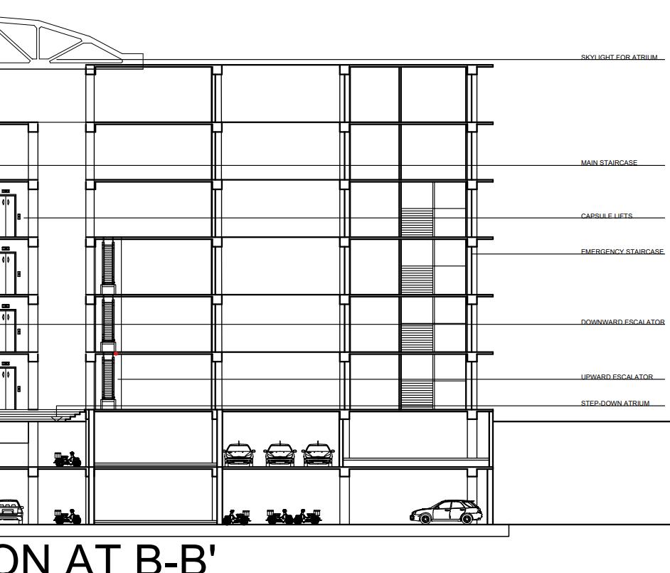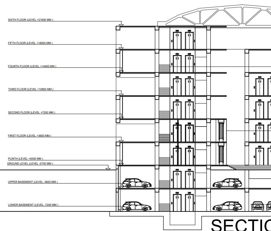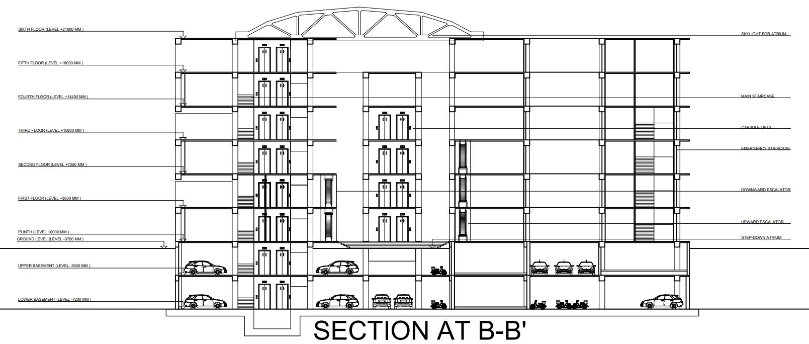 LOWER BASEMENT (LEVEL -7200 MM UPPER BASEMENT (LEVEL -3600 MM PLINTH (LEVEL +0000 MM FIRST FLOOR (LEVEL +3600 MM SECOND FLOOR (LEVEL +7200 MM THIRD FLOOR (LEVEL +10800 MM FOURTH FLOOR (LEVEL +14400 MM FIFTH FLOOR (LEVEL +18000 MM SIXTH FLOOR (LEVEL +21600 MM GROUND LEVEL (LEVEL -0750 MM SKYLIGHT FOR ATRIUM CAPSULE LIFTS EMERGENCY STAIRCASE STEP-DOWN ATRIUM DOWNWARD ESCALATOR UPWARD ESCALATOR MAIN STAIRCASE